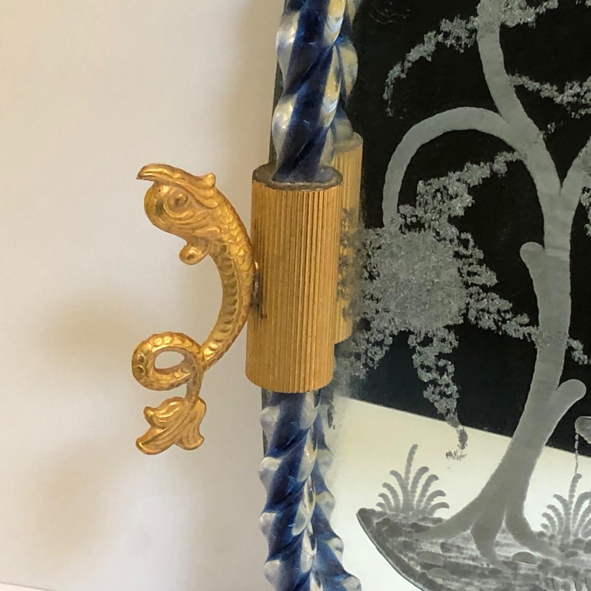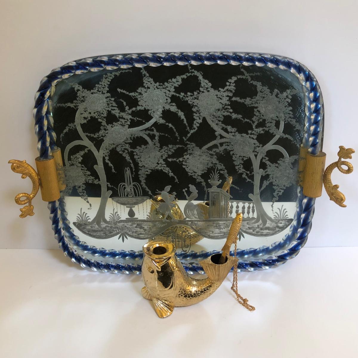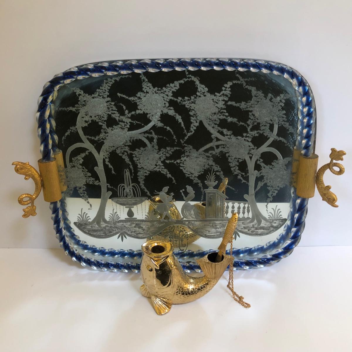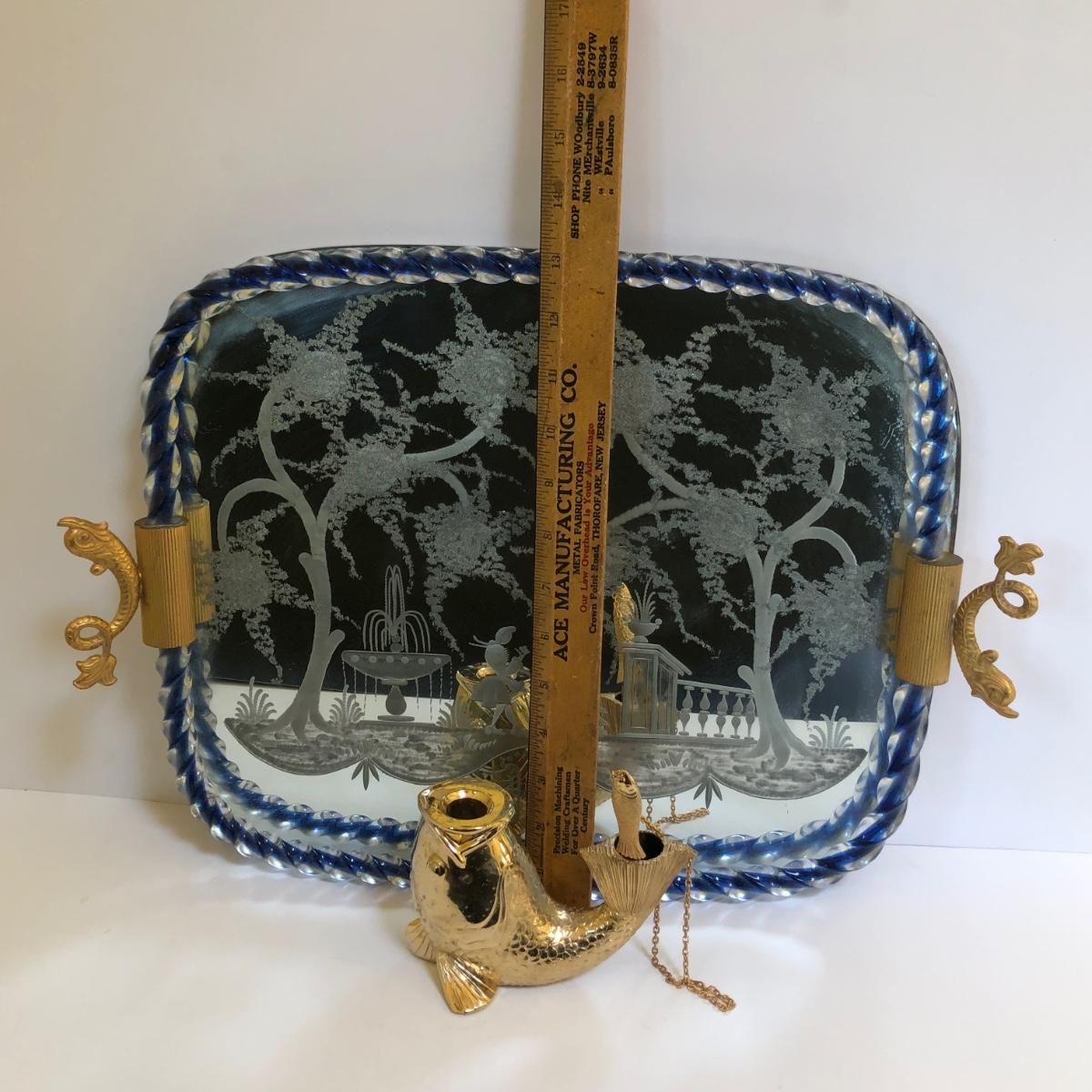 This vintage tray is attributed to Murano with a mirror etched tray featuring two lovers and cascading waterfall fountain in a garden. The surrounding frame is hand twist Murano glass with brass sea dolphin handles and a wood base back. Very hard to find these in this condition. Age is betweenthe 40's to 50's. Brass tone fish has an opening in the mouth and the tail, along with a spreader shaped like a fish chained to it.