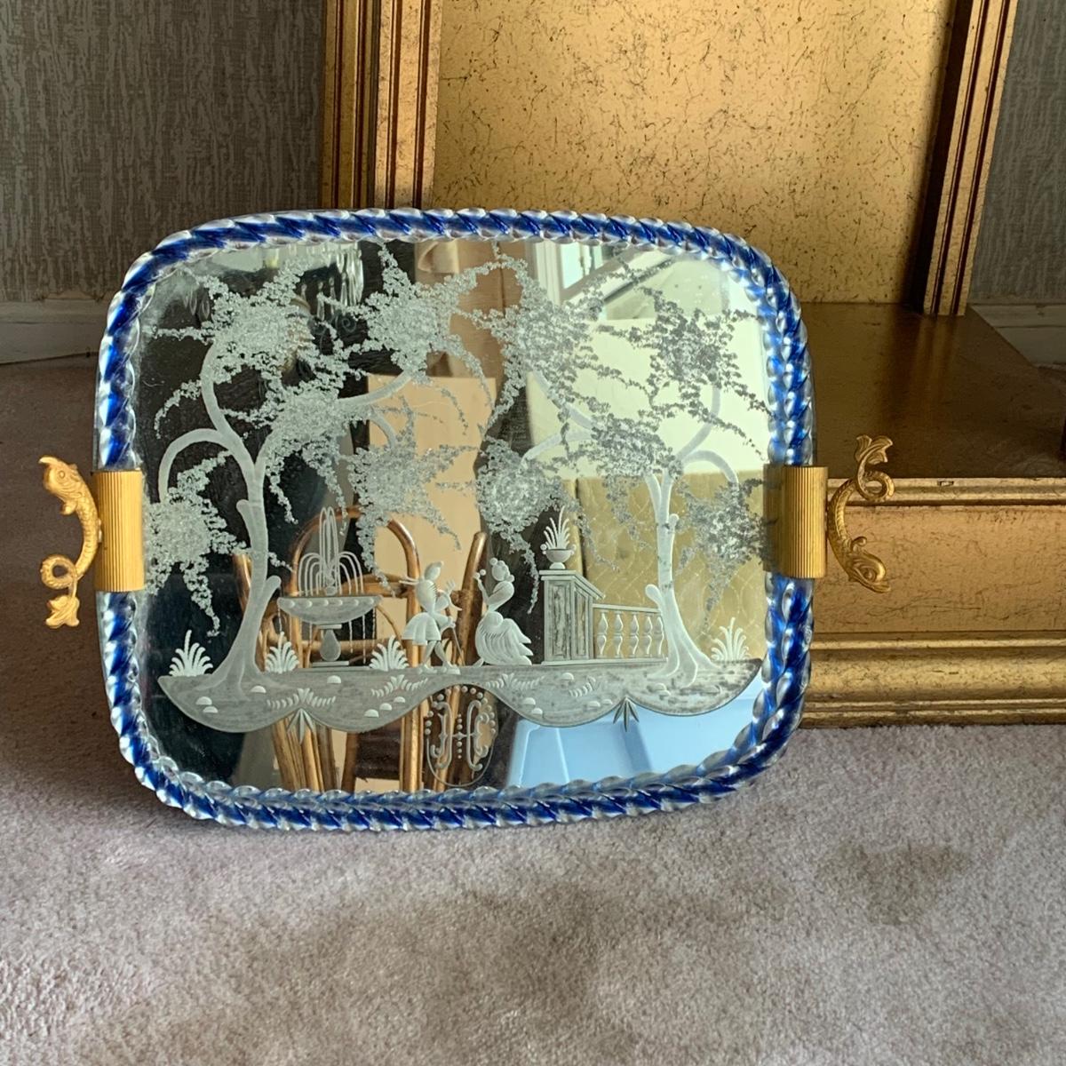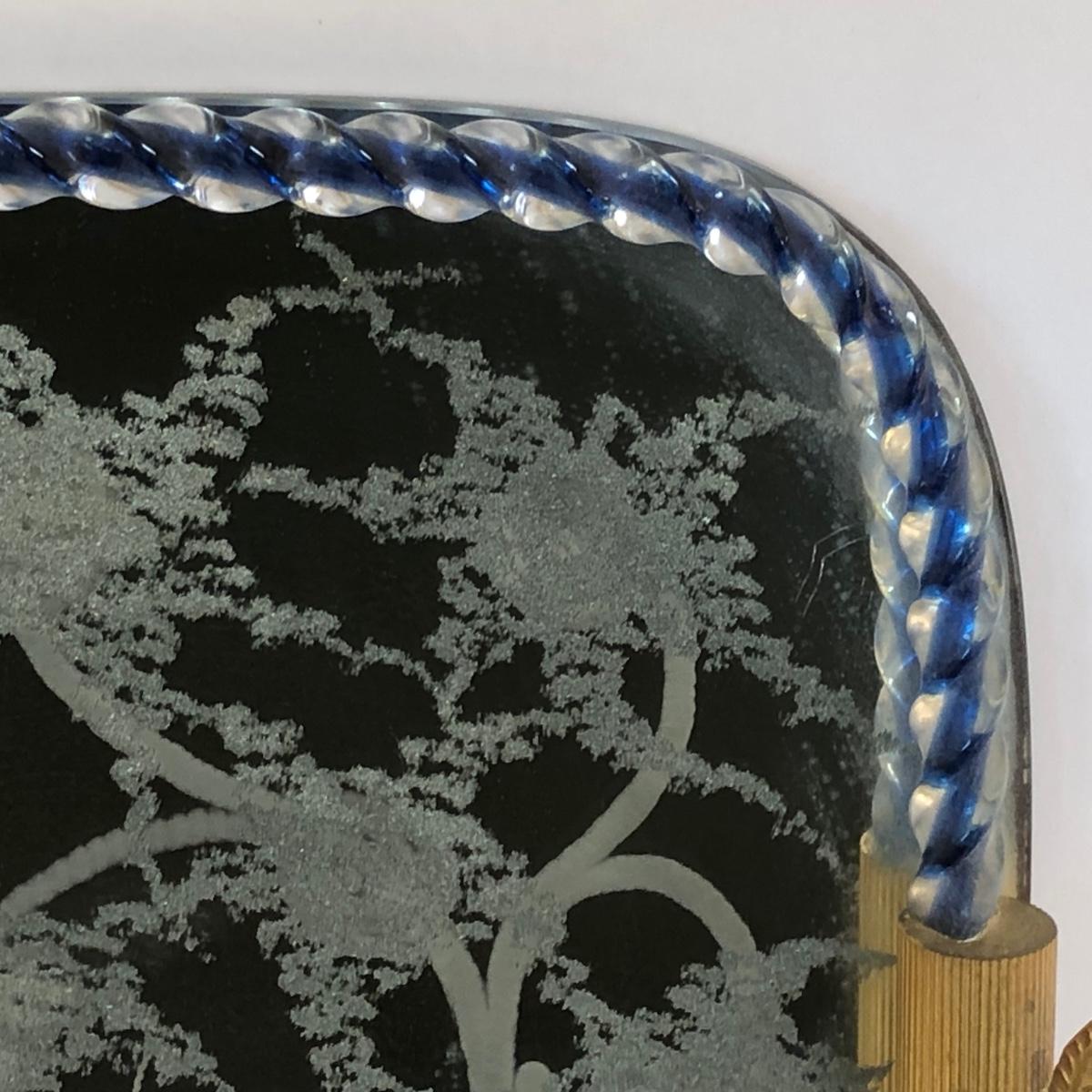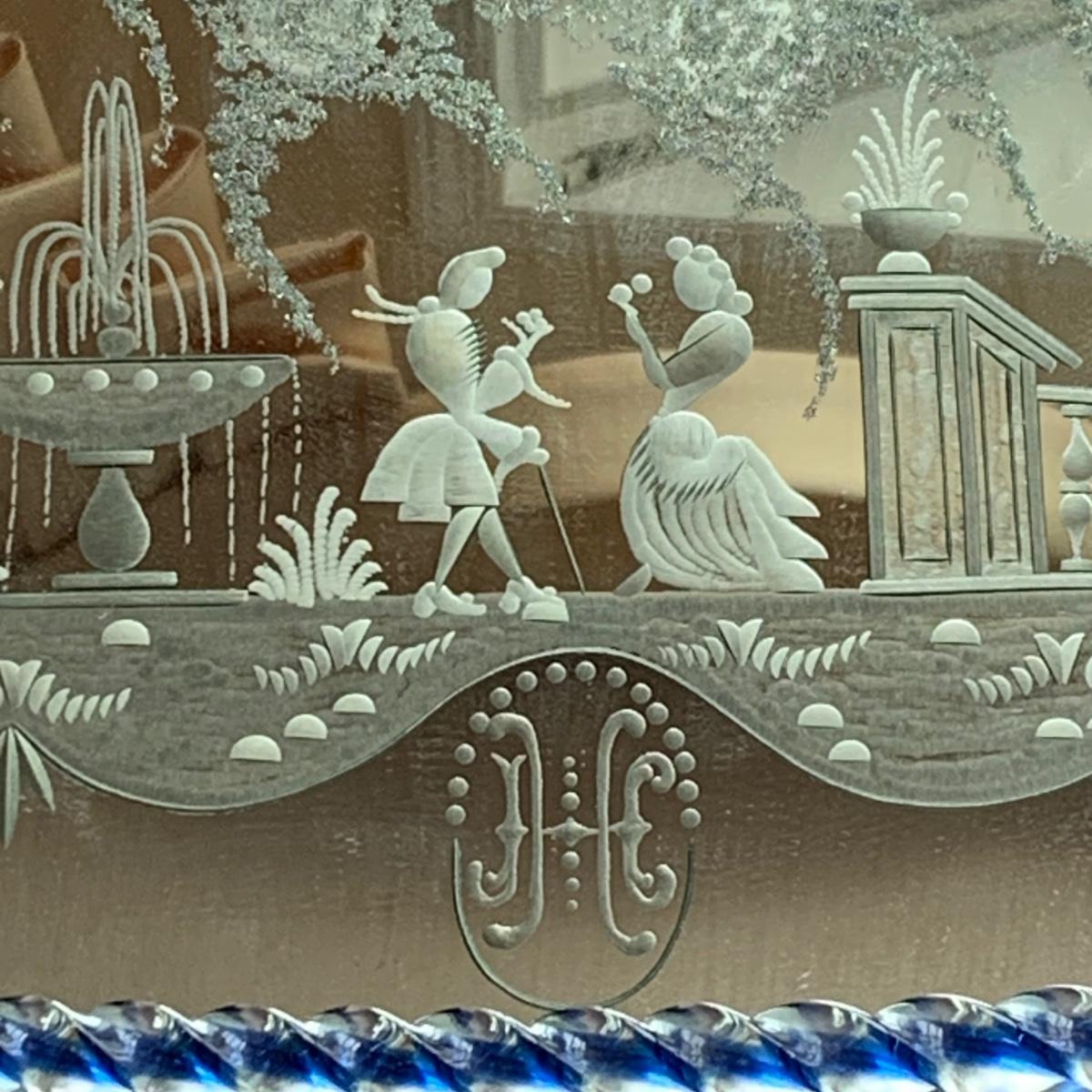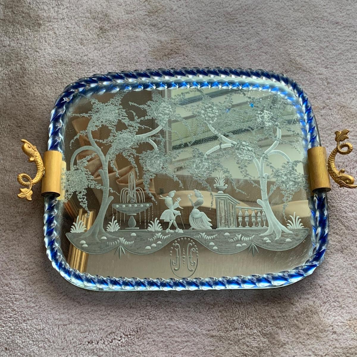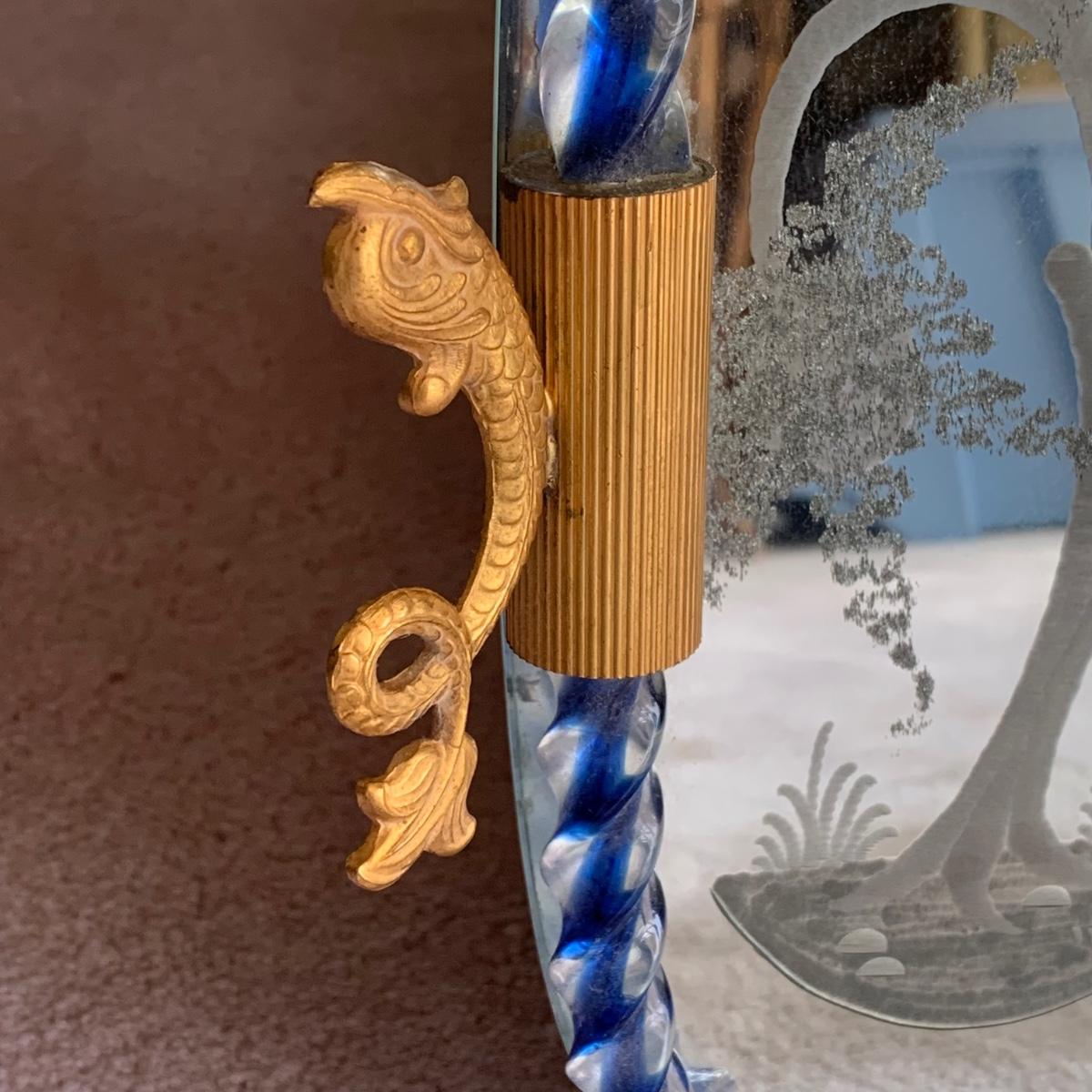 This vintage tray is attributed to Murano with a mirror etched tray featuring two lovers and cascading waterfall fountain in a garden. The surrounding frame is hand twist Murano glass with brass sea dolphin handles and a wood base back. Very hard to find these in this condition. Age is betweenthe 40's to 50's. Brass tone fish has an opening in the mouth and the tail, along with a spreader shaped like a fish chained to it.