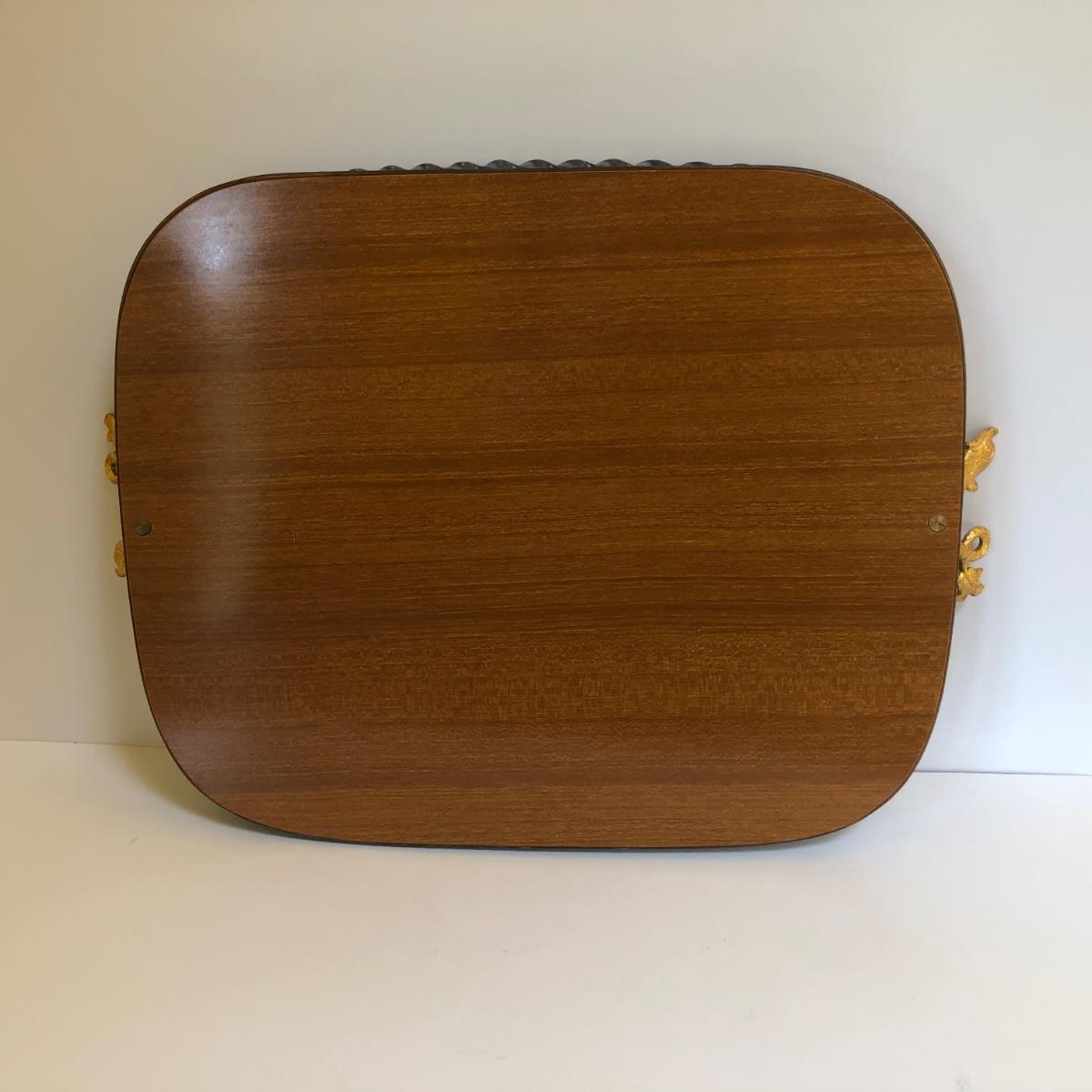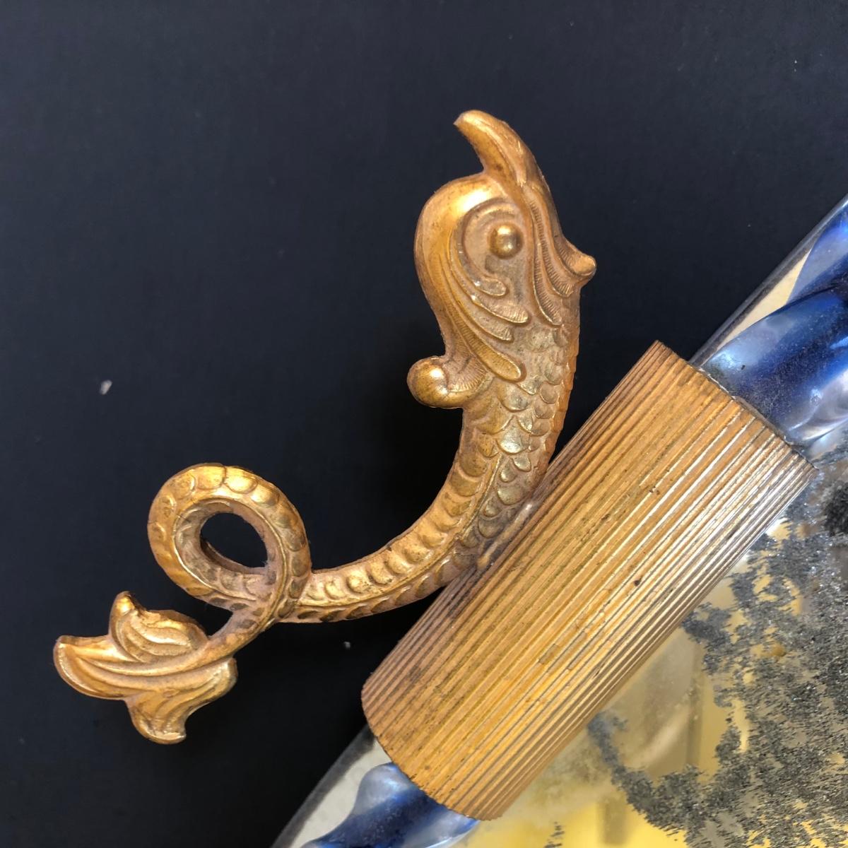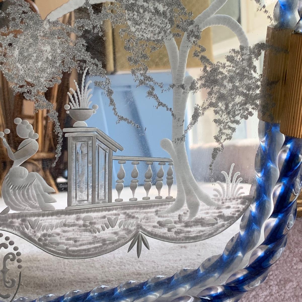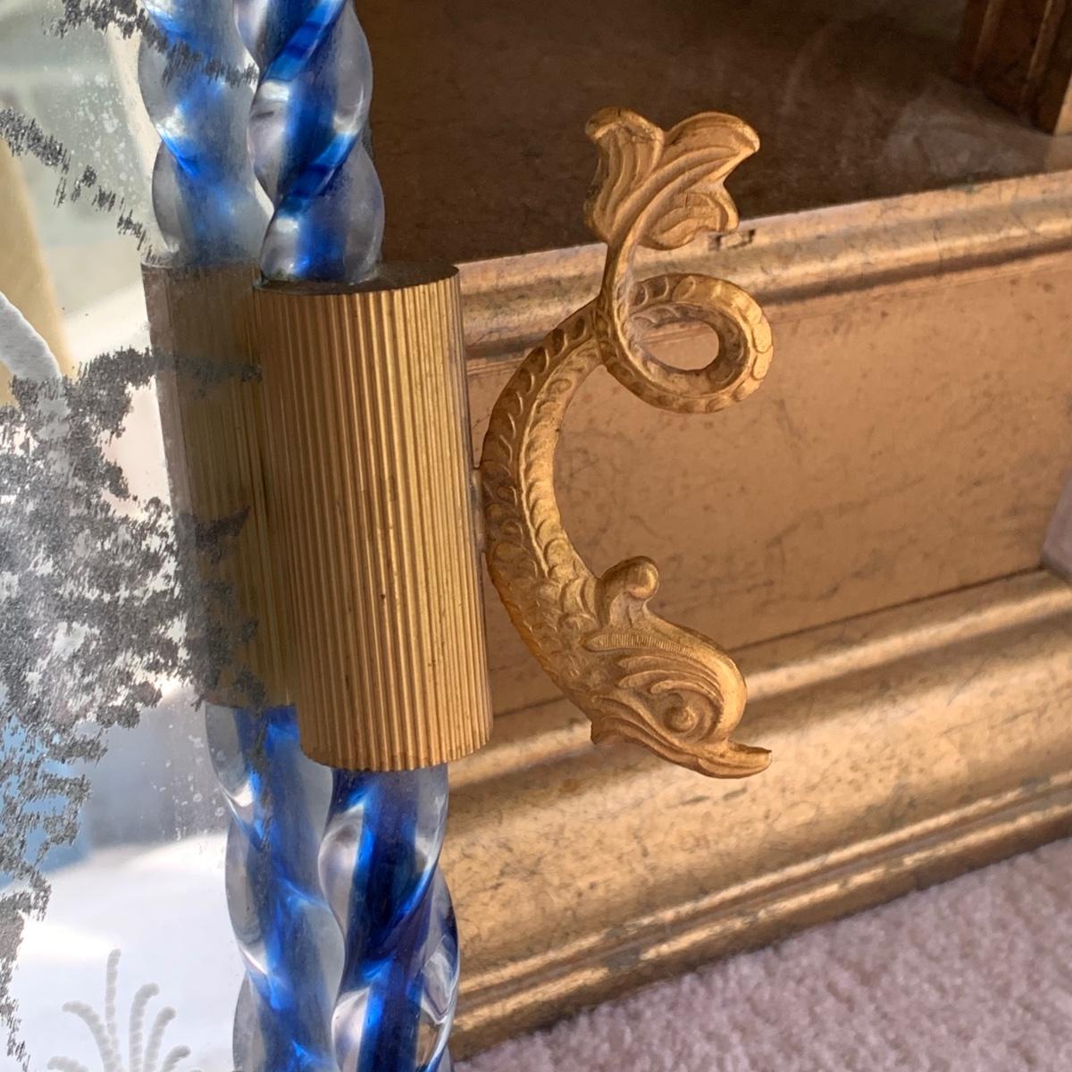 This vintage tray is attributed to Murano with a mirror etched tray featuring two lovers and cascading waterfall fountain in a garden. The surrounding frame is hand twist Murano glass with brass sea dolphin handles and a wood base back. Very hard to find these in this condition. Age is betweenthe 40's to 50's. Brass tone fish has an opening in the mouth and the tail, along with a spreader shaped like a fish chained to it.