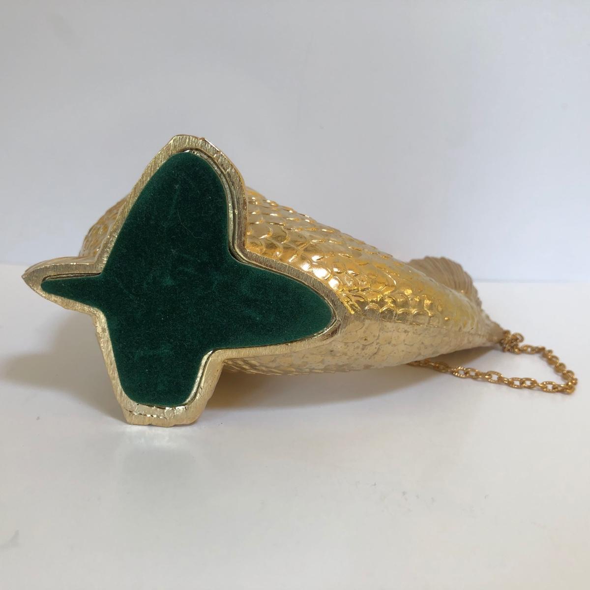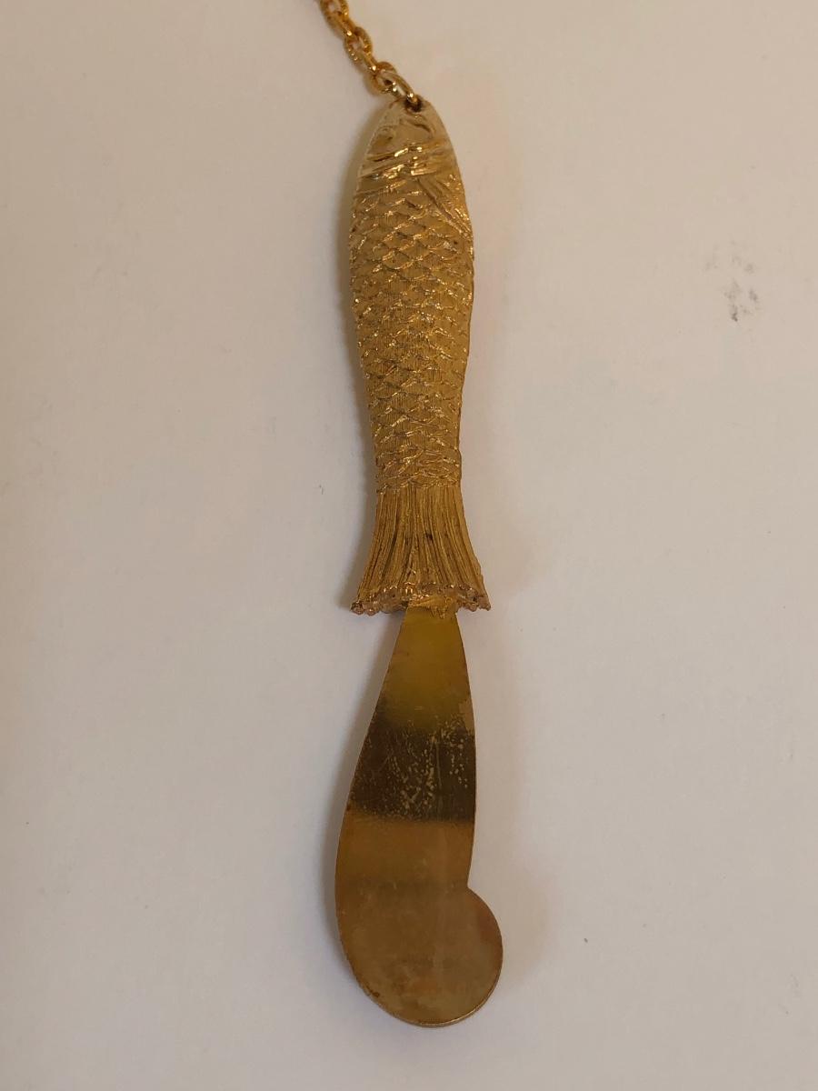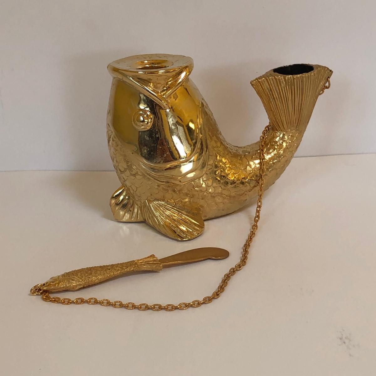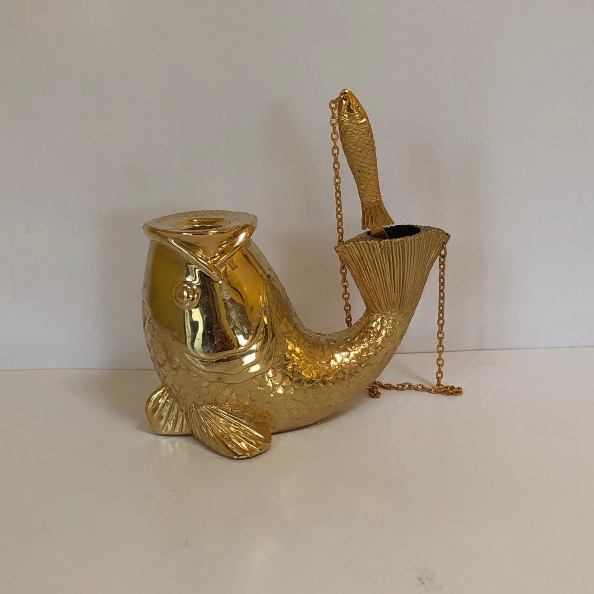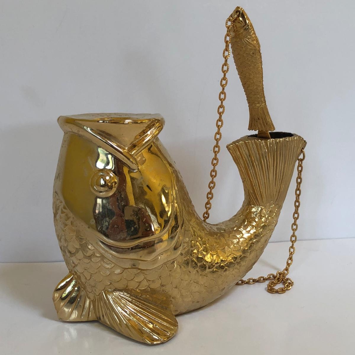 This vintage tray is attributed to Murano with a mirror etched tray featuring two lovers and cascading waterfall fountain in a garden. The surrounding frame is hand twist Murano glass with brass sea dolphin handles and a wood base back. Very hard to find these in this condition. Age is betweenthe 40's to 50's. Brass tone fish has an opening in the mouth and the tail, along with a spreader shaped like a fish chained to it.