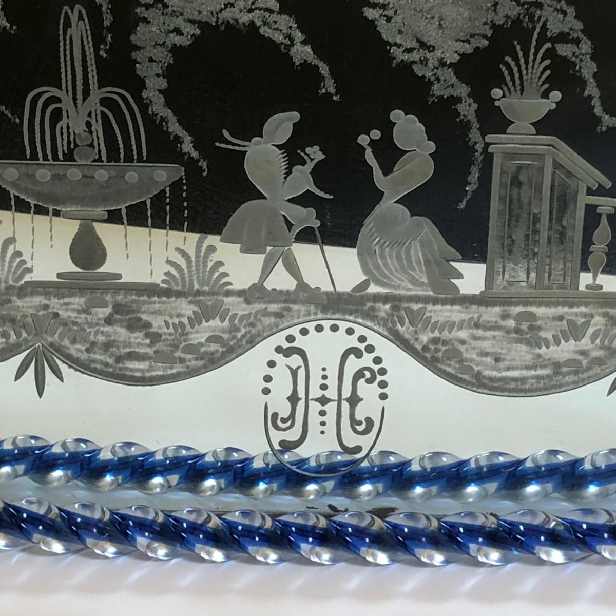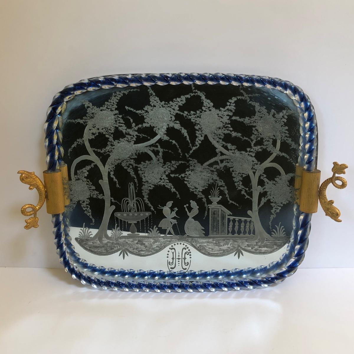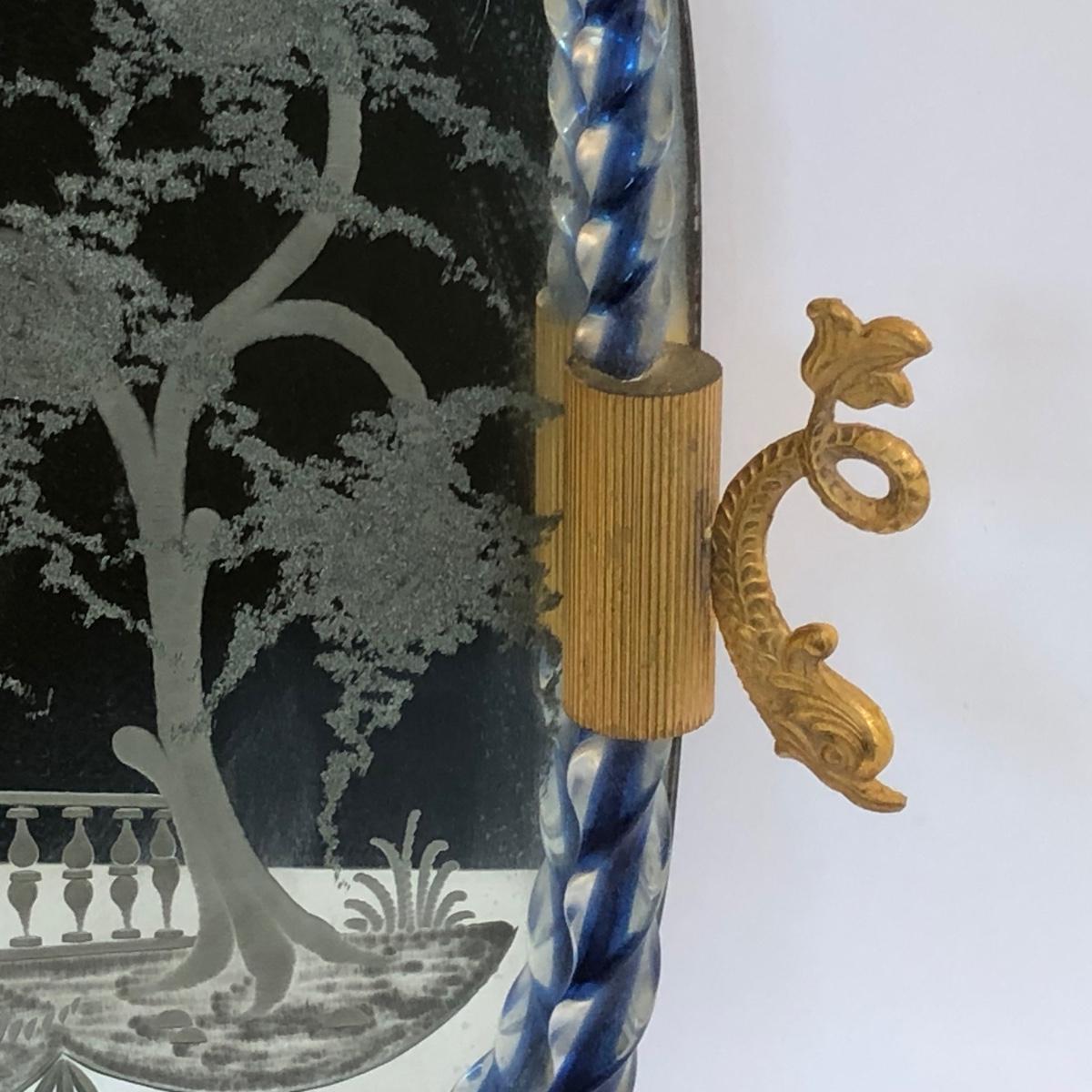 LOT 304M: HTF VIntage Italian Murano Glass Serving Tray w/Mirror Engraving & Sea Dolphin Handles
