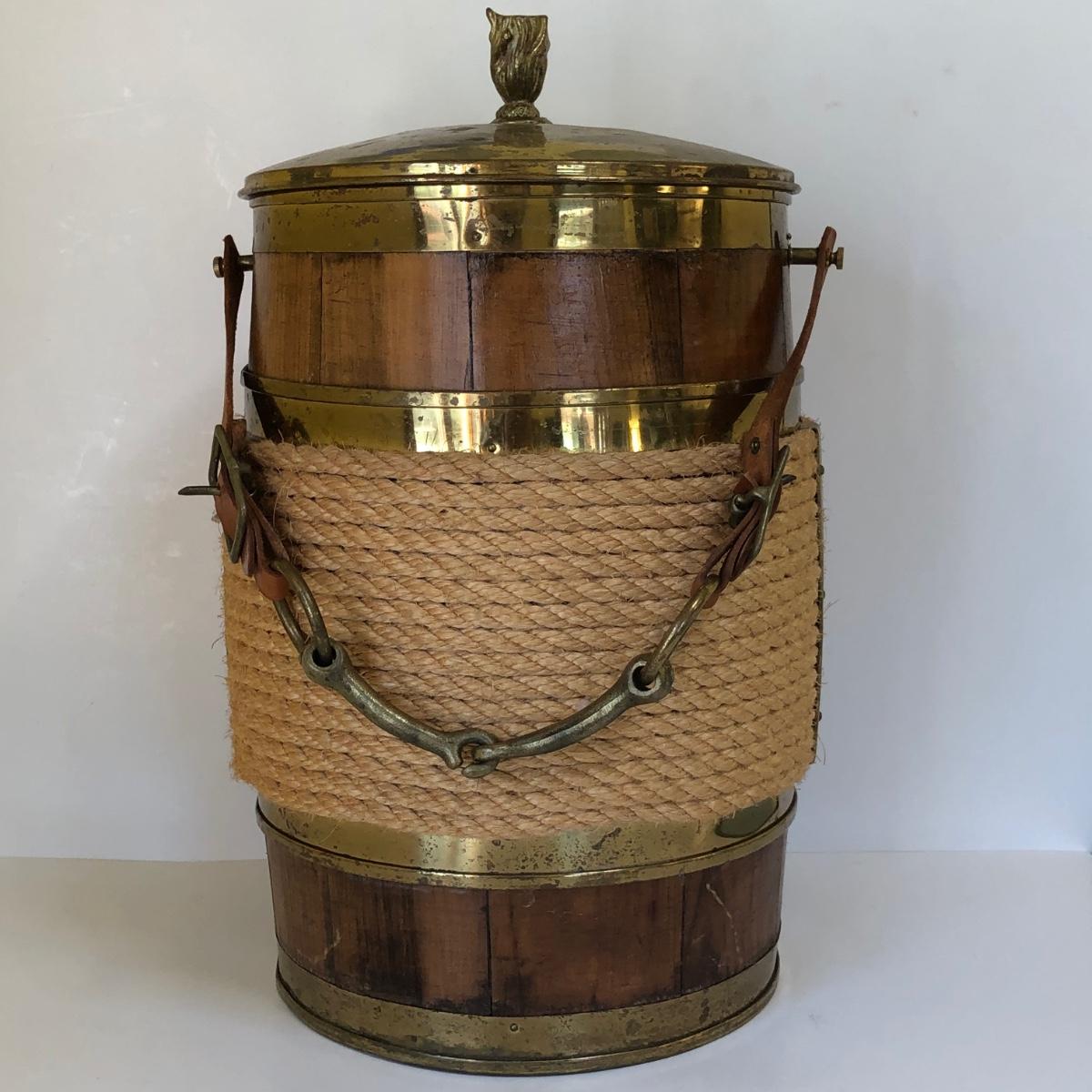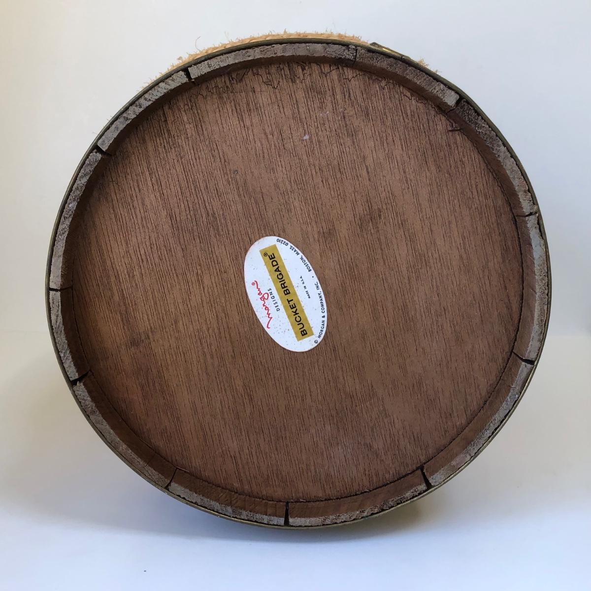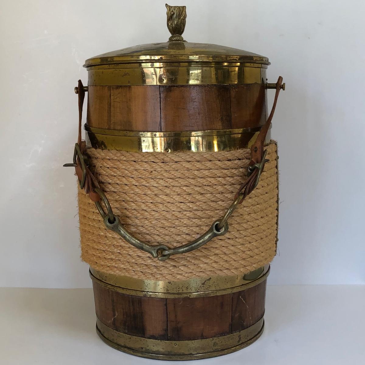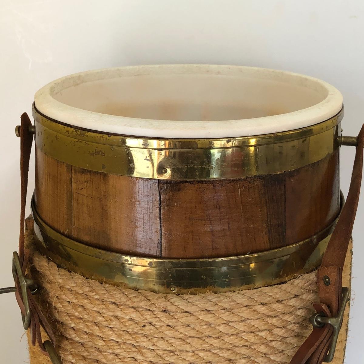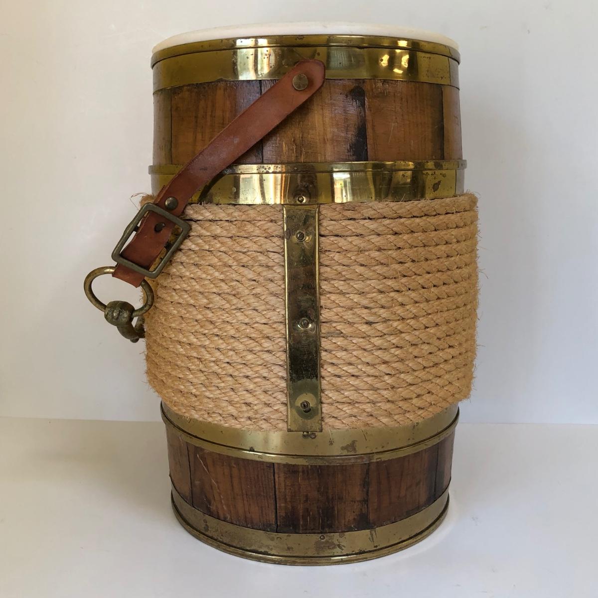 Barrel is insulated and marked Morgan Designs "Bucket Brigade" on the bottom. Has a handle with buckles and metal and is wrapped with rope, with a brass colored lid and accents.