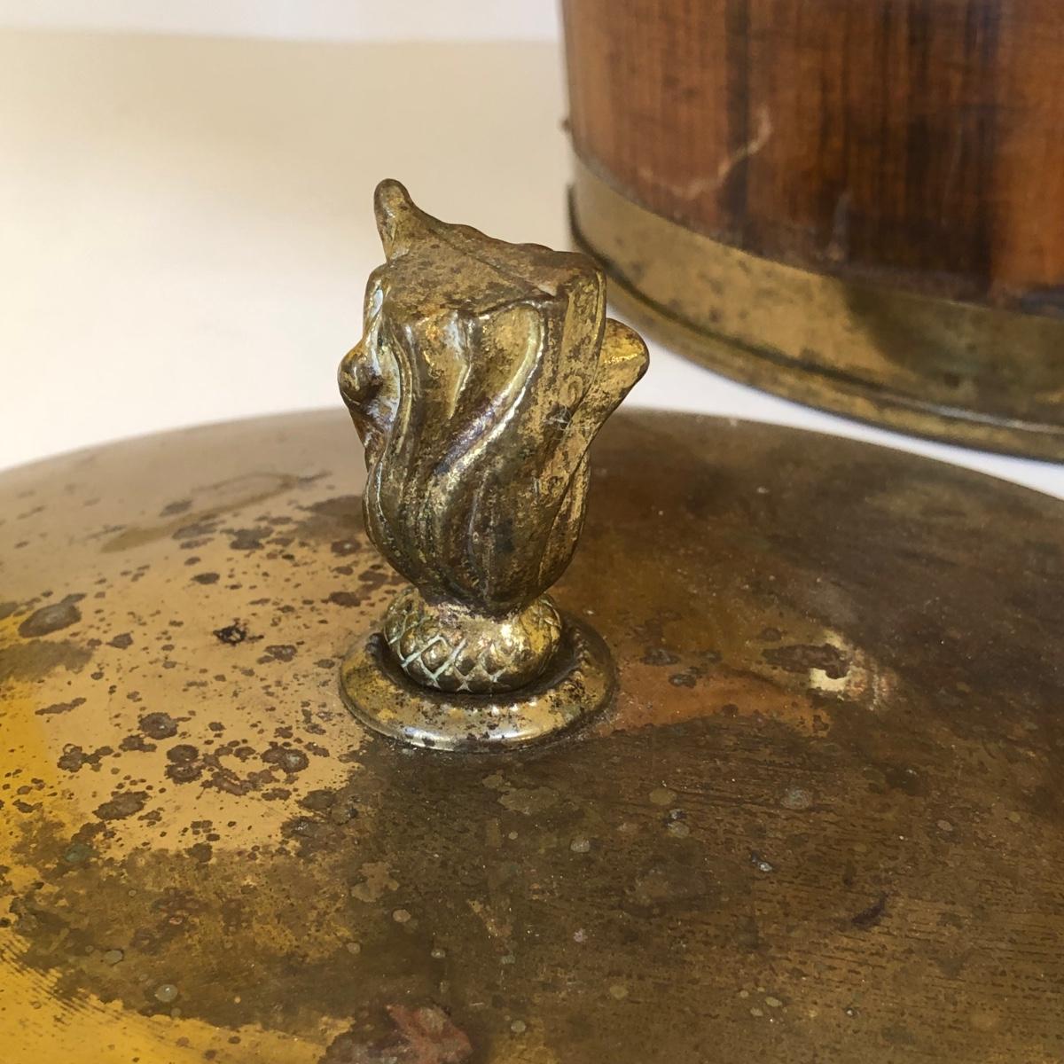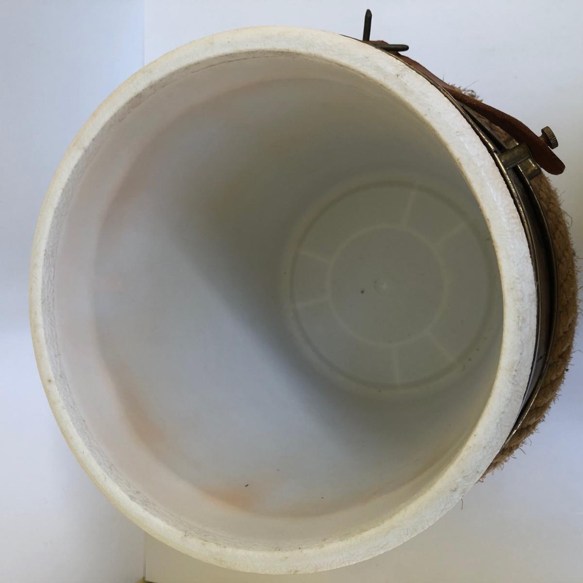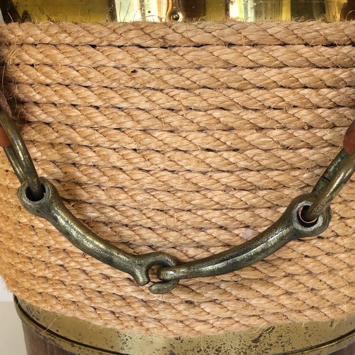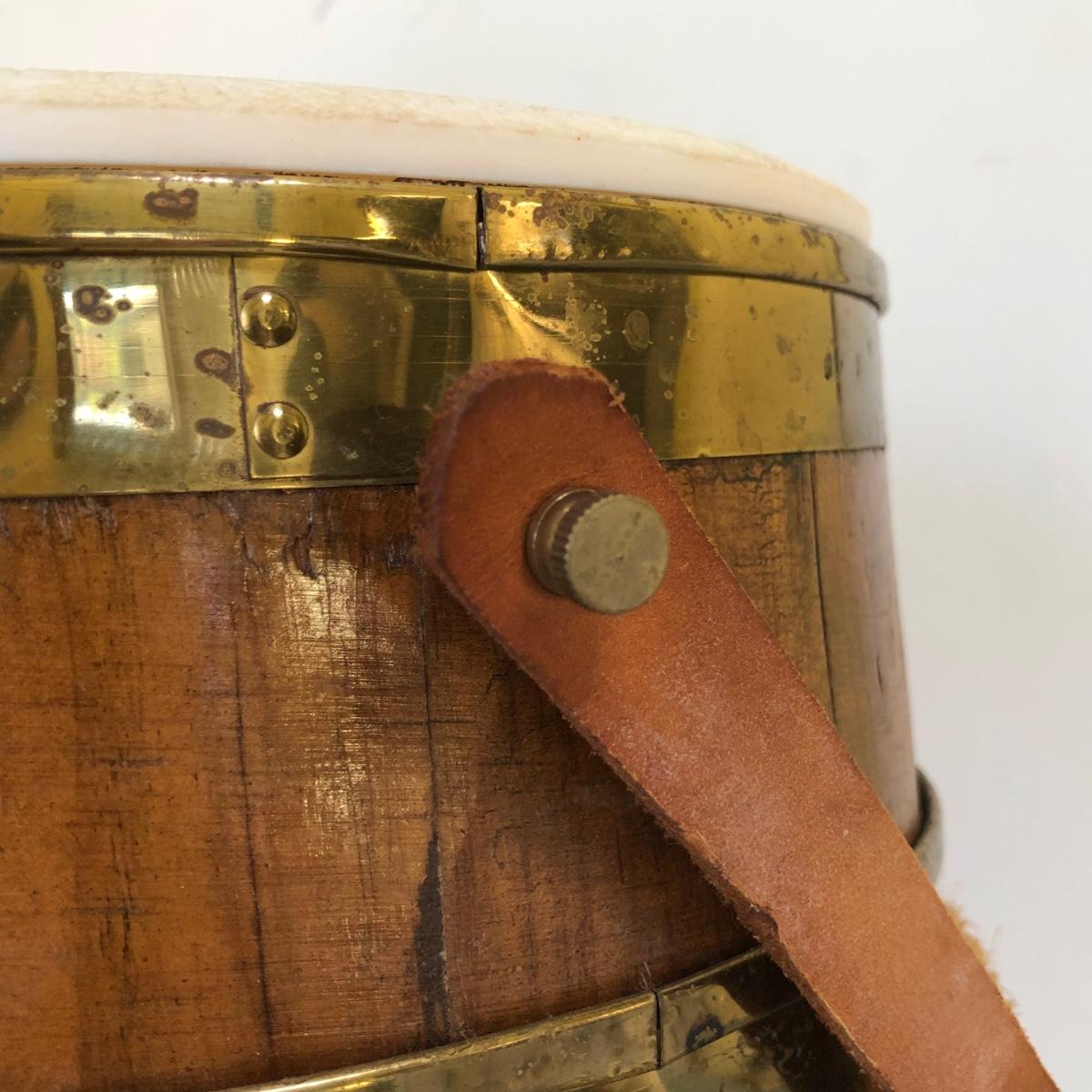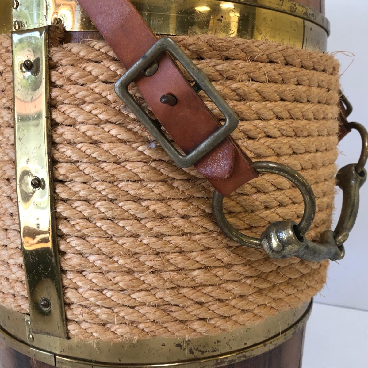 Barrel is insulated and marked Morgan Designs "Bucket Brigade" on the bottom. Has a handle with buckles and metal and is wrapped with rope, with a brass colored lid and accents.