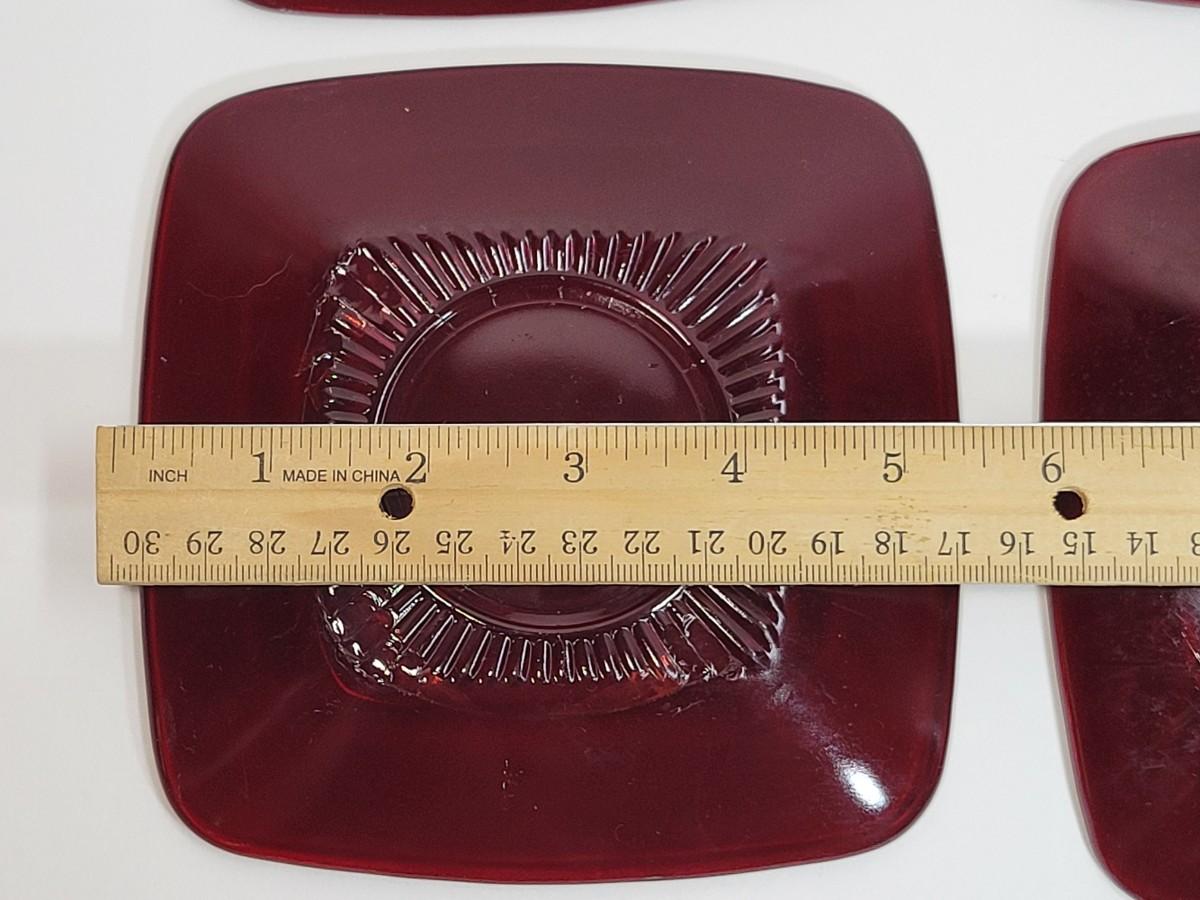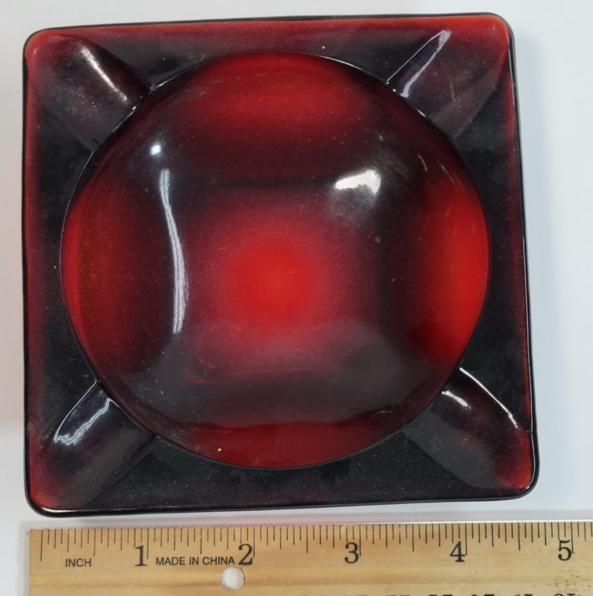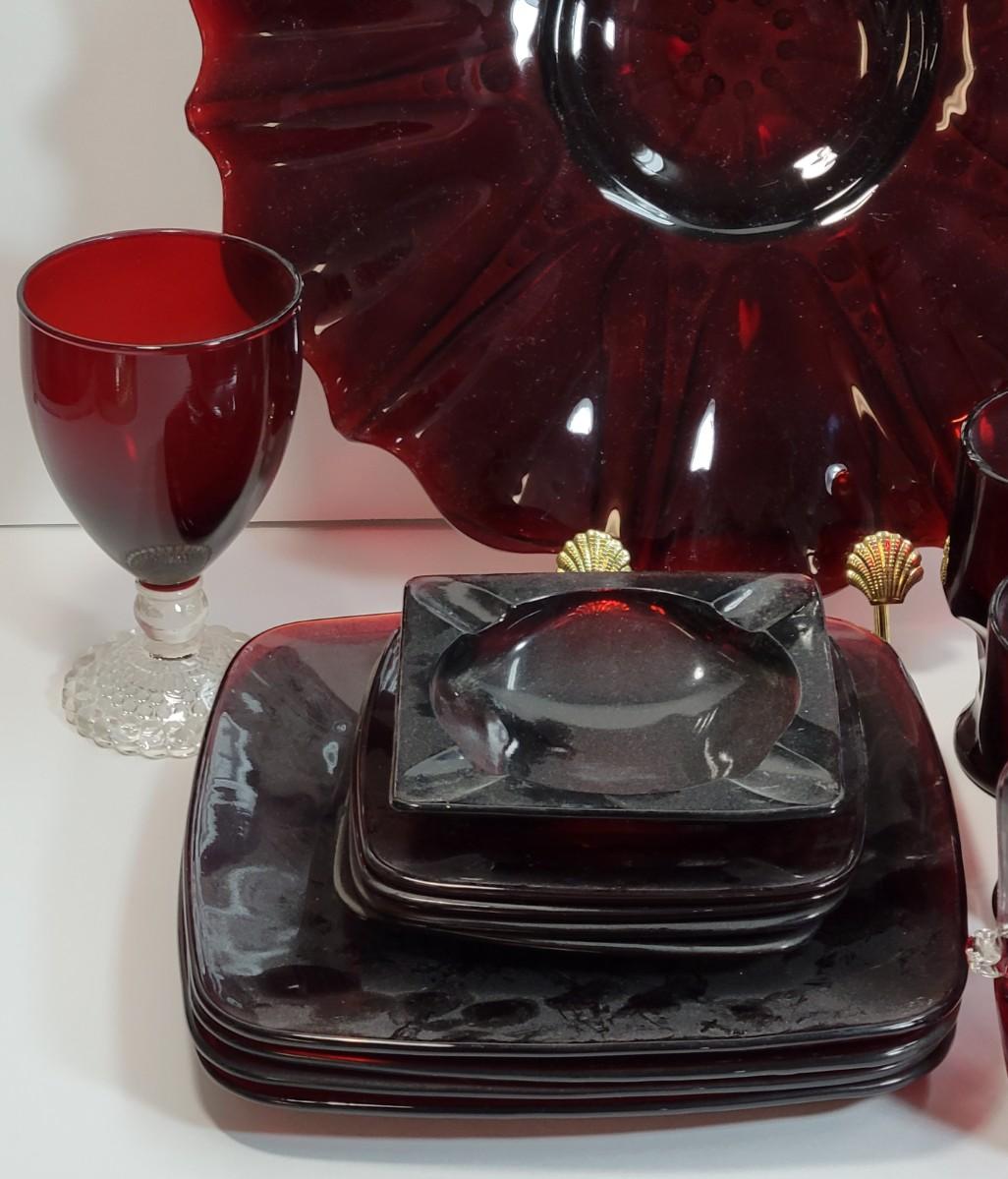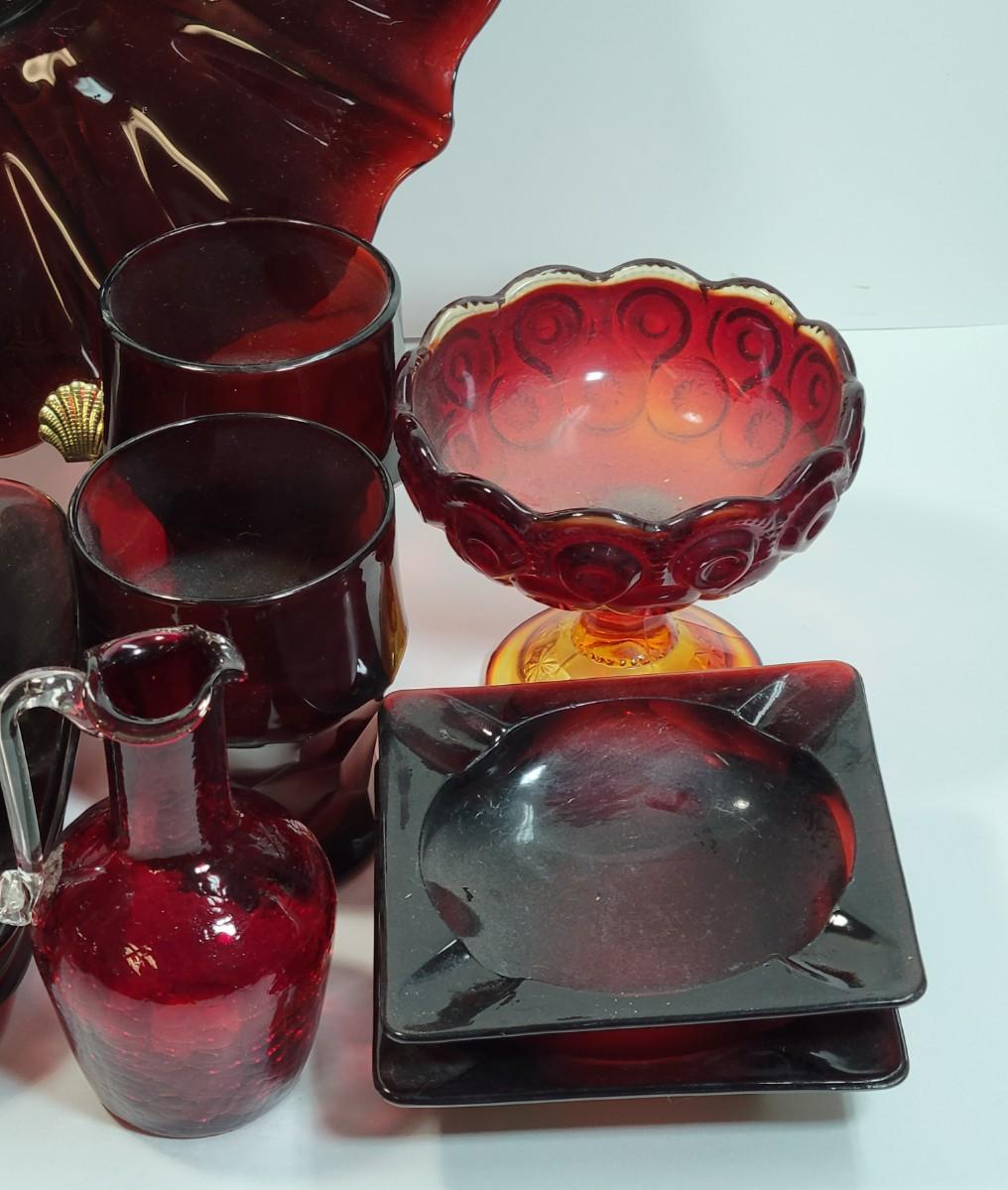 LOT 28: Red Glass: Dinnerware, Glassware, Ashtrays, Serveware, & Mini Pitcher