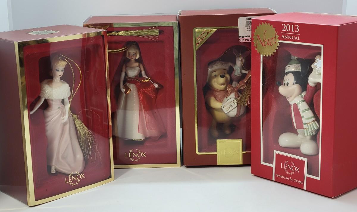 LOT 40: Collection of Lenox Ornaments 2003/2005 Barbies, Pooh, Mickey Mouse