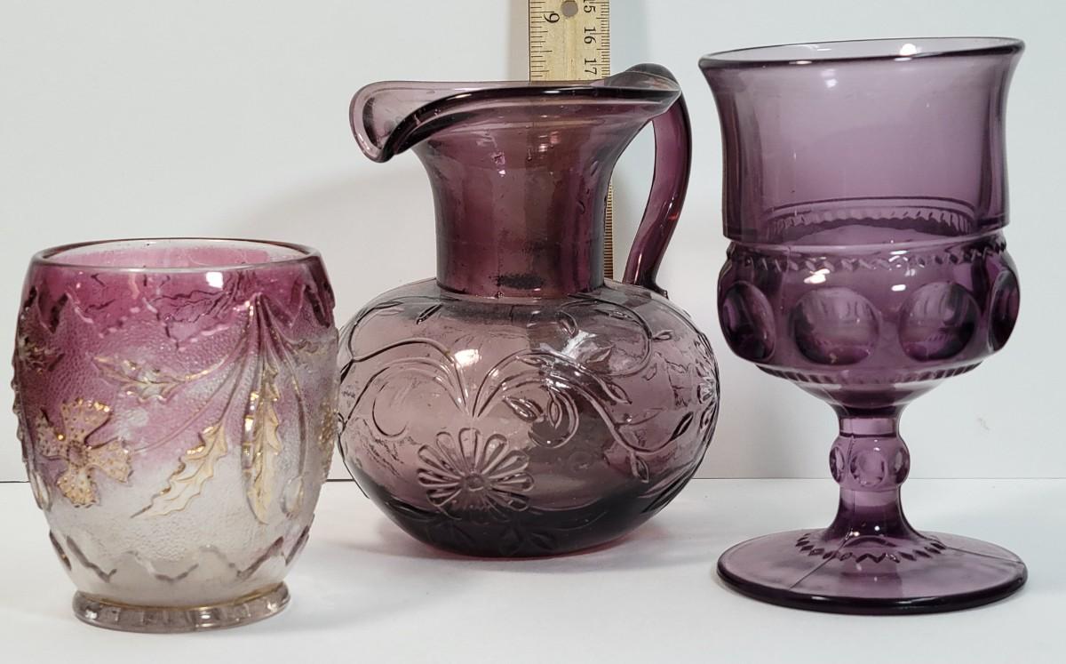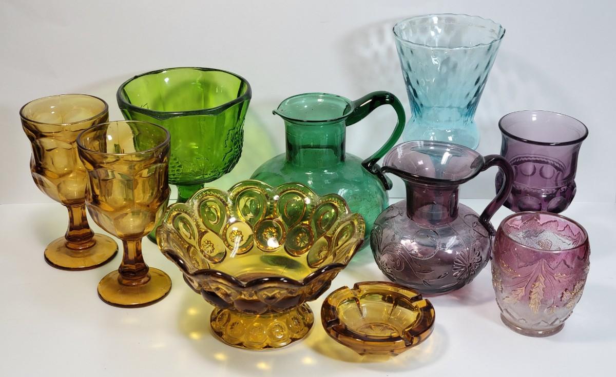 LOT 44: Collection of Amber, Purple, Blue, Green Glass Vases & More!