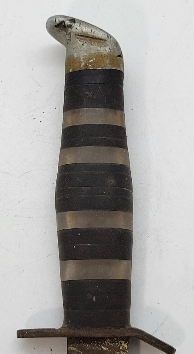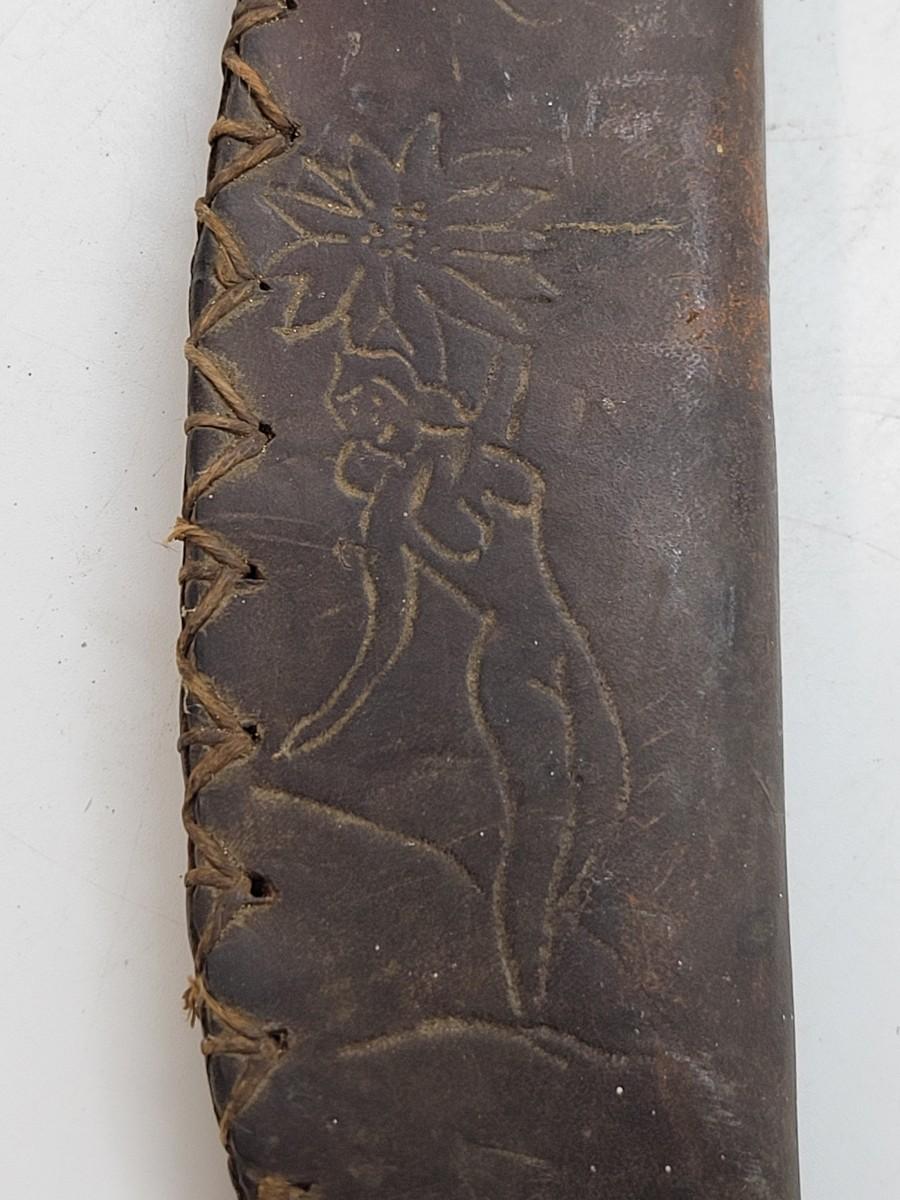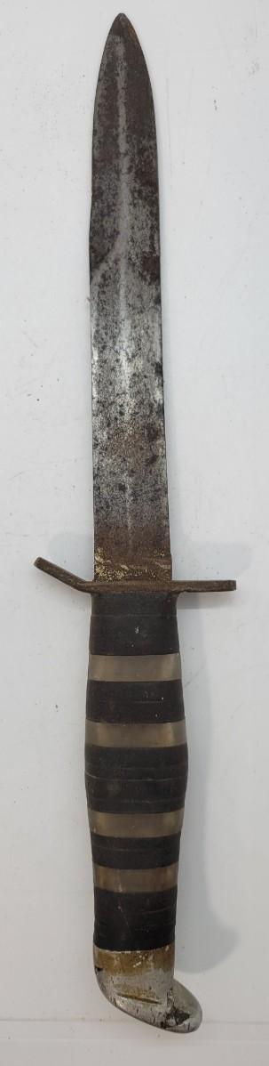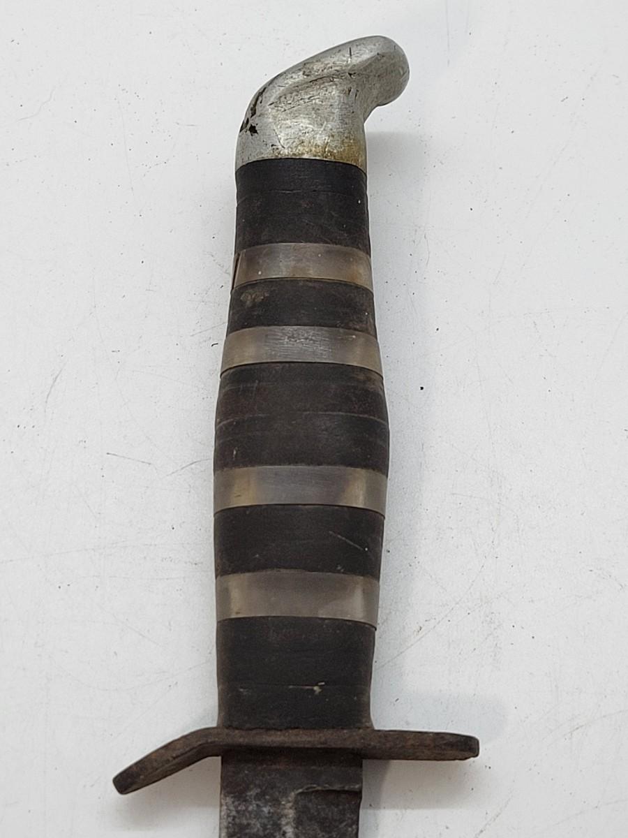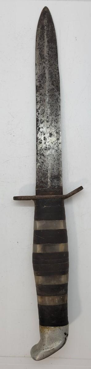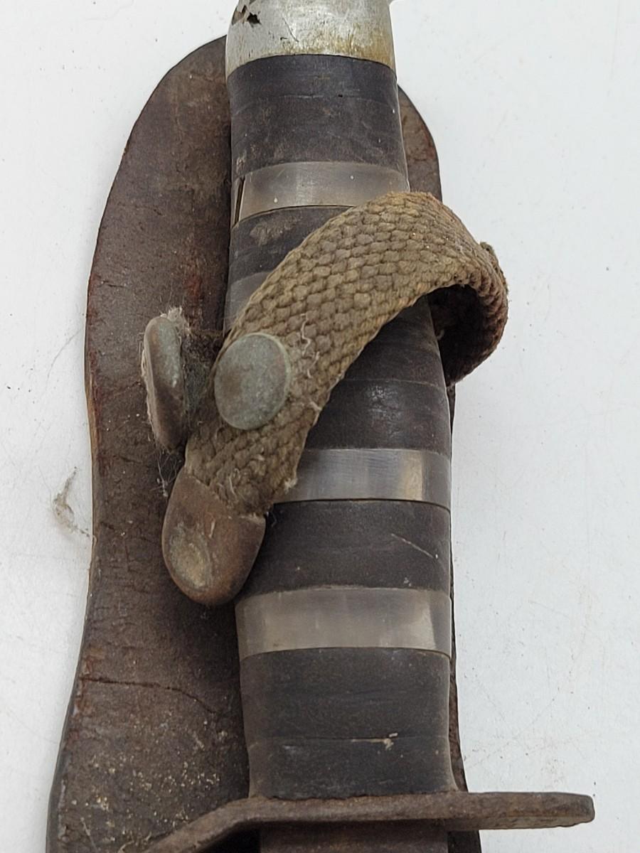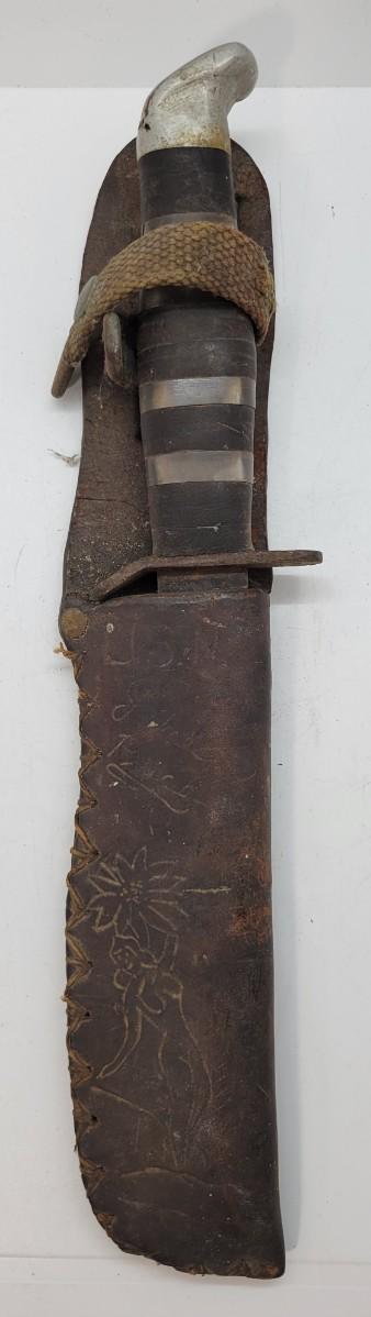 LOT 49: Vintage WW2 Fighting Knife with Plexi Glass Beads in engraved Leather Sheath