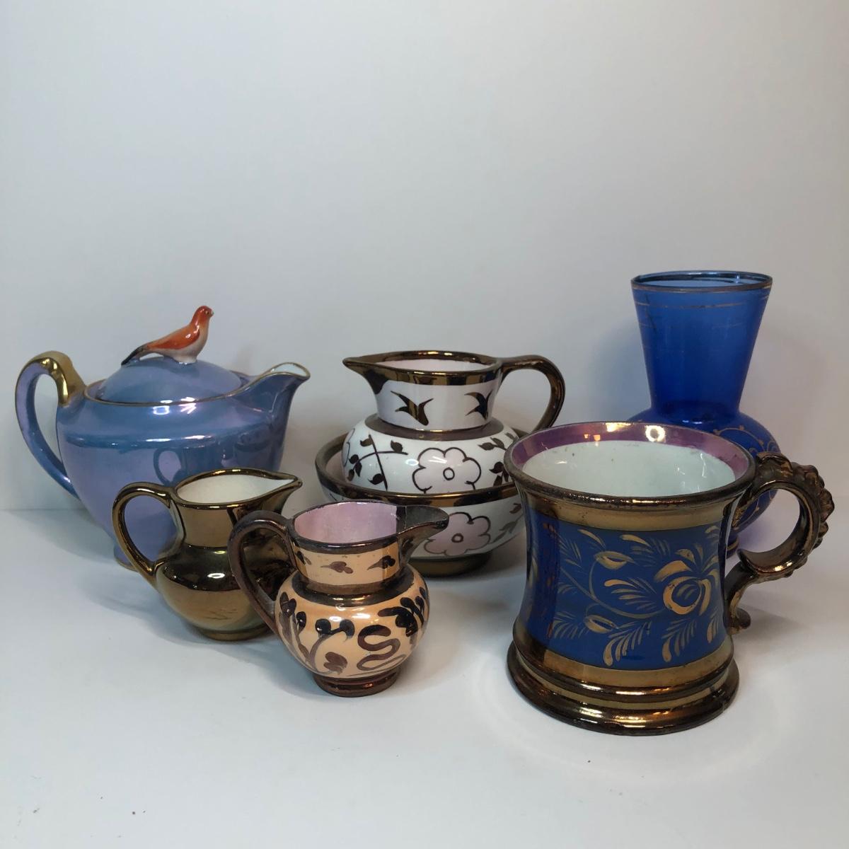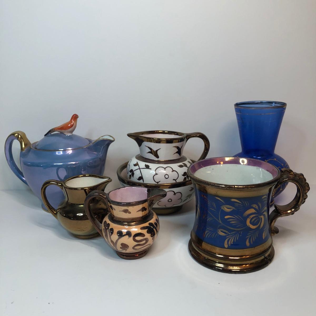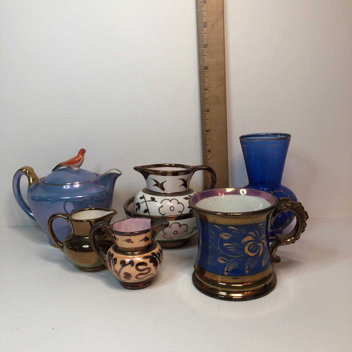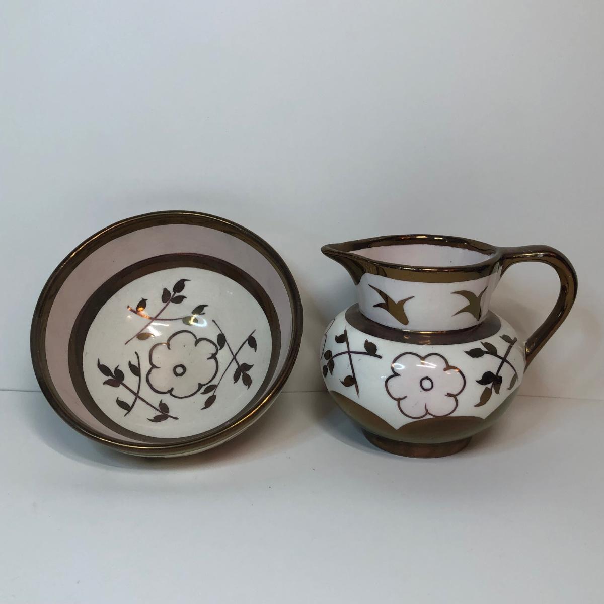Includes a small matching pink, white & brown English Ware bowl and pitcher, a mug, a vase, two small pitchers and a Noritake tea pot with a bird on the lid.