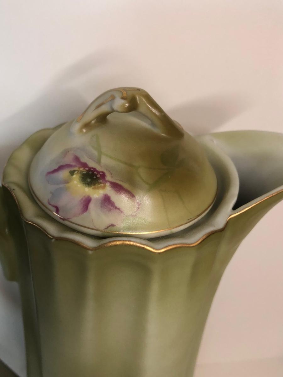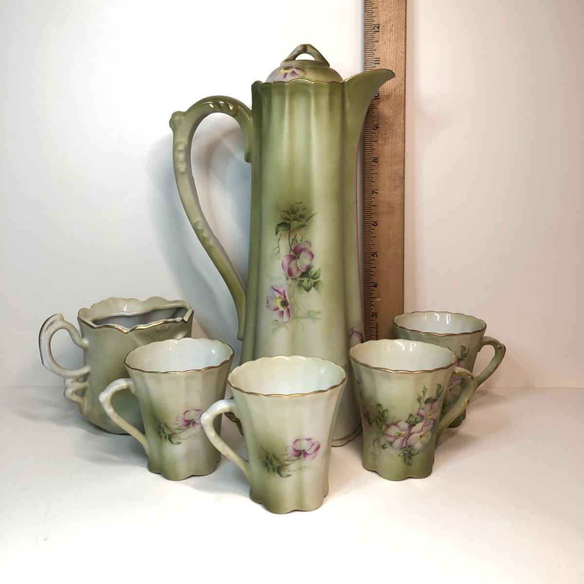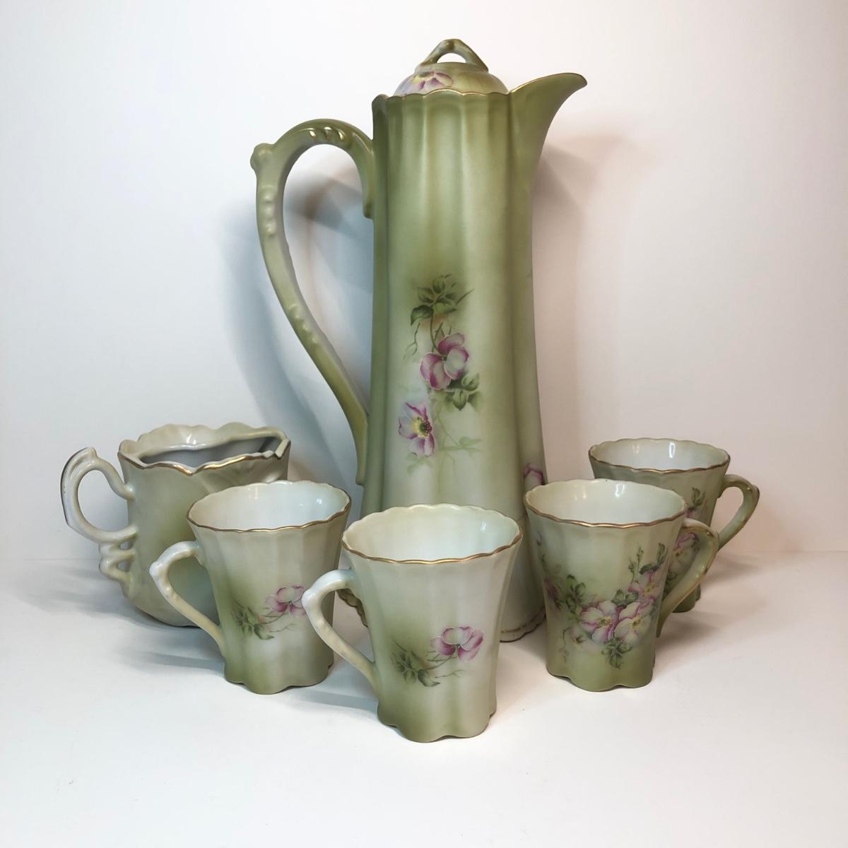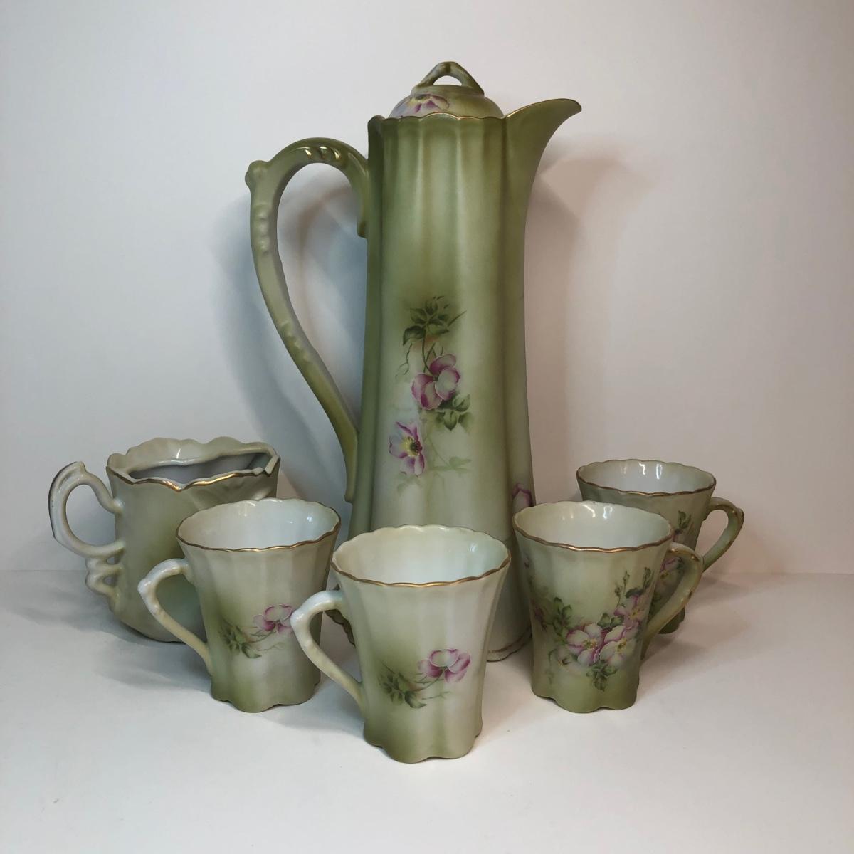 Large tea/coffee pot with 4 matching teacups and a moustache cup. All have floral designes painted and a green tone with gold colored rims.