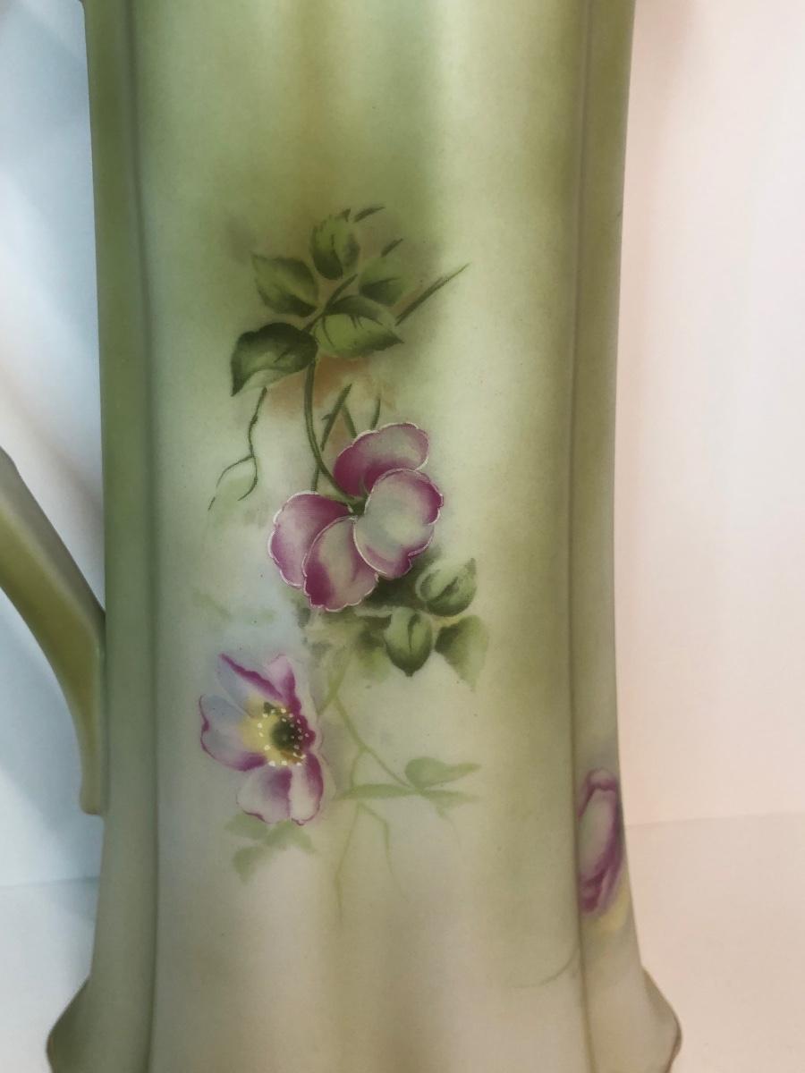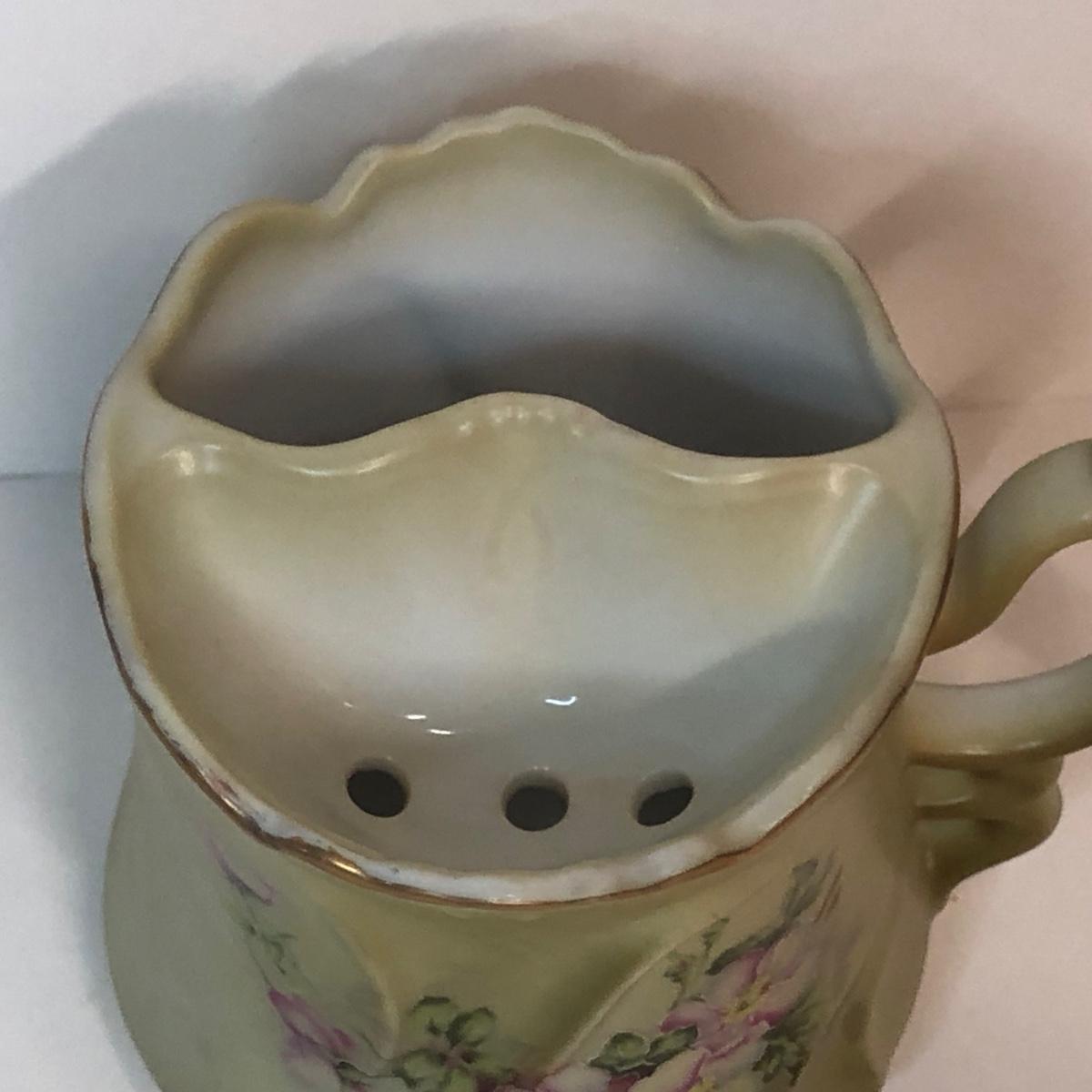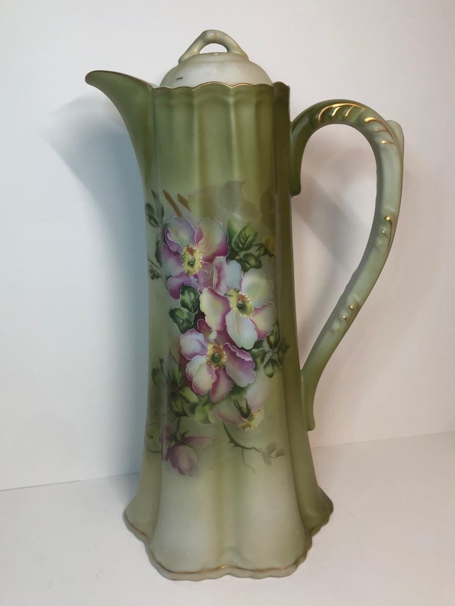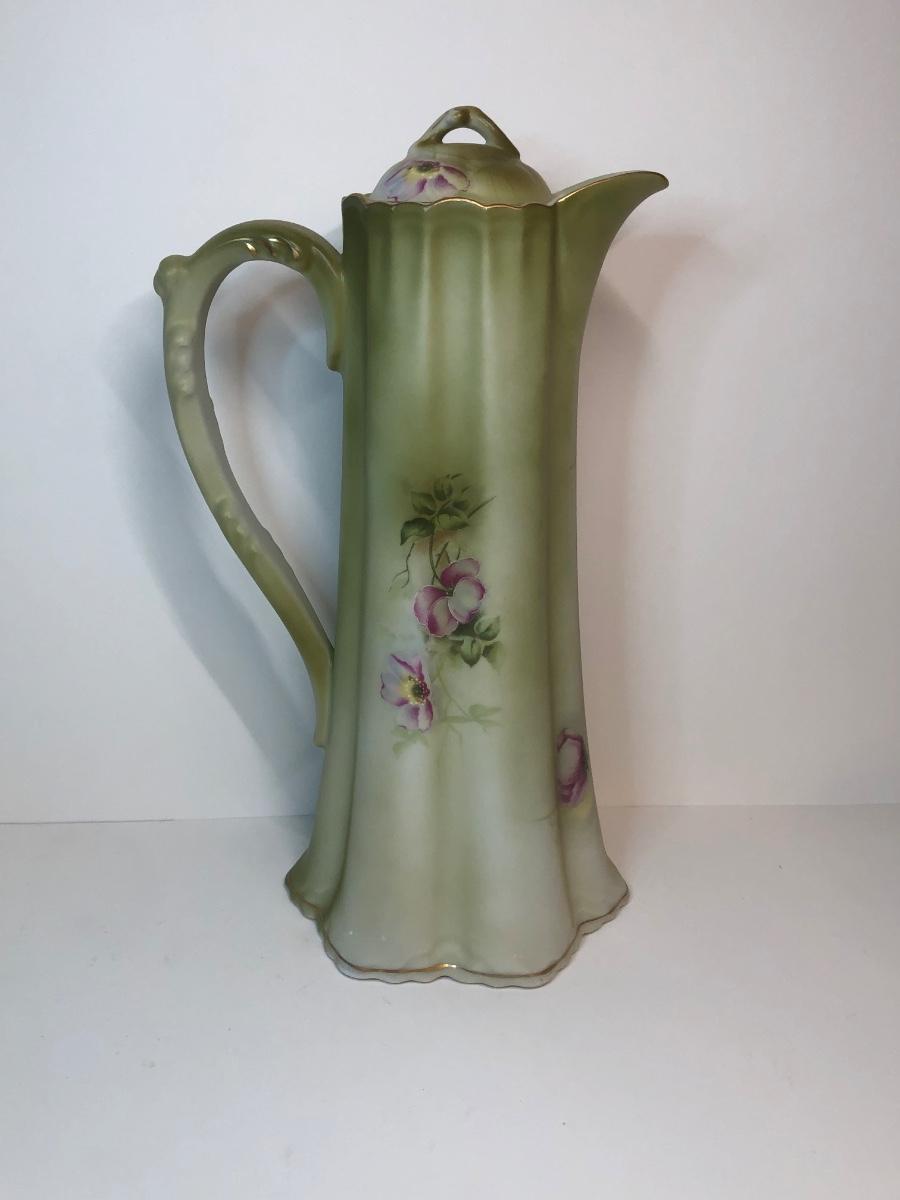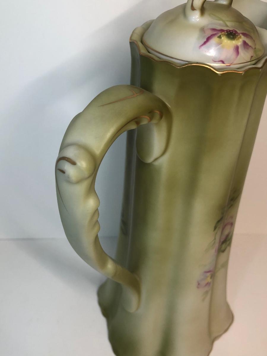 Large tea/coffee pot with 4 matching teacups and a moustache cup. All have floral designes painted and a green tone with gold colored rims.