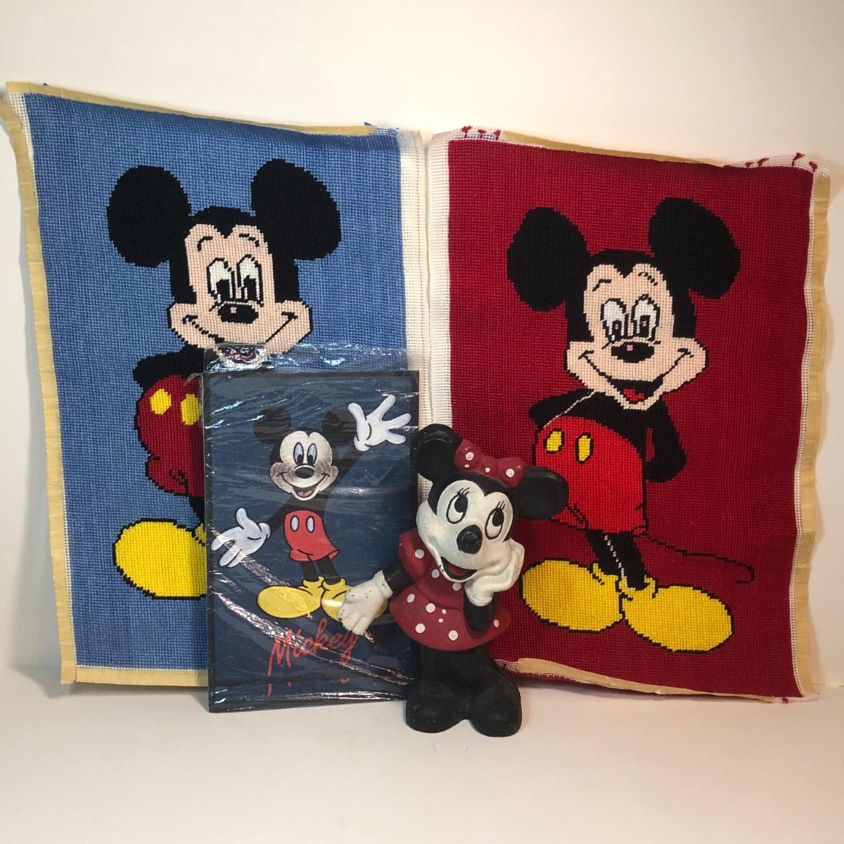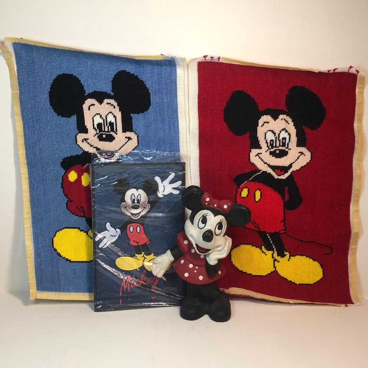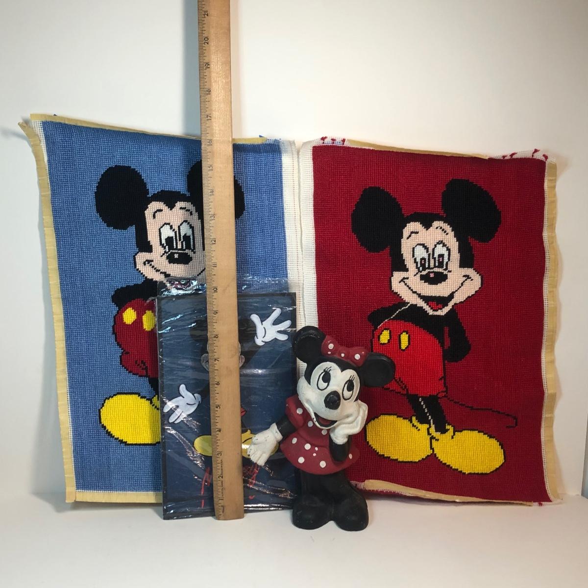 Two needlepoints of mickey mouse, a pack of stationary with the characters on it and a cast iron Minnie Mouse coin bank.