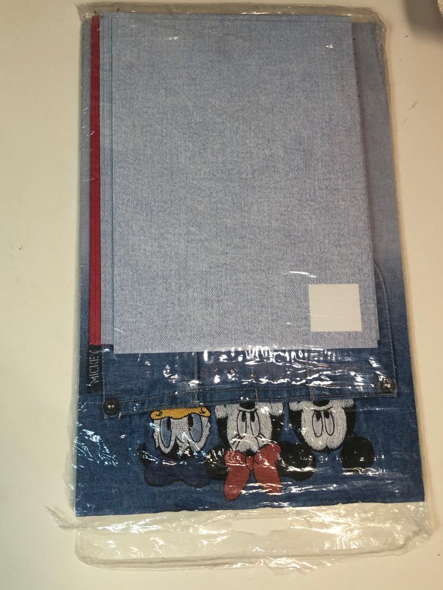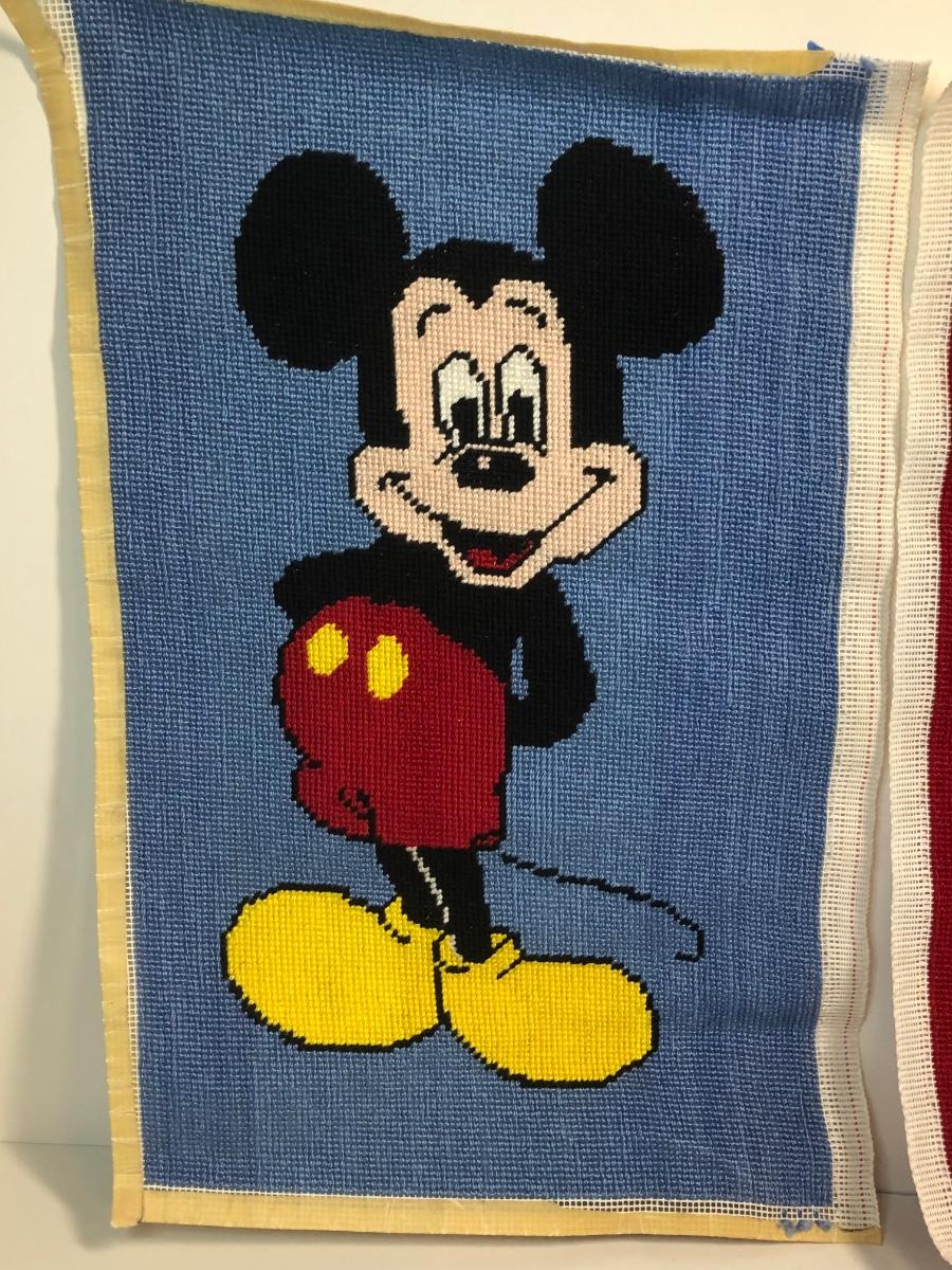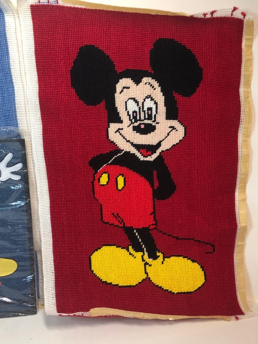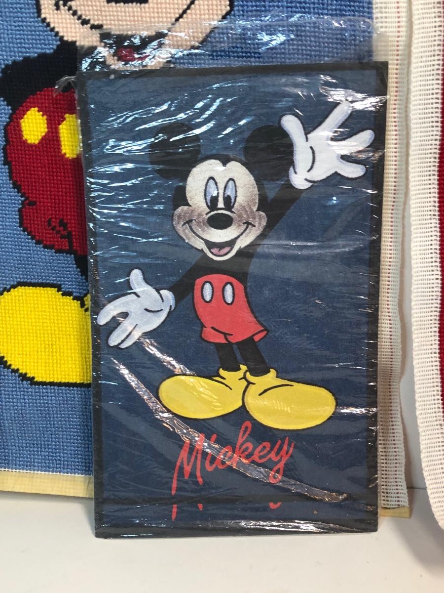 Two needlepoints of mickey mouse, a pack of stationary with the characters on it and a cast iron Minnie Mouse coin bank.