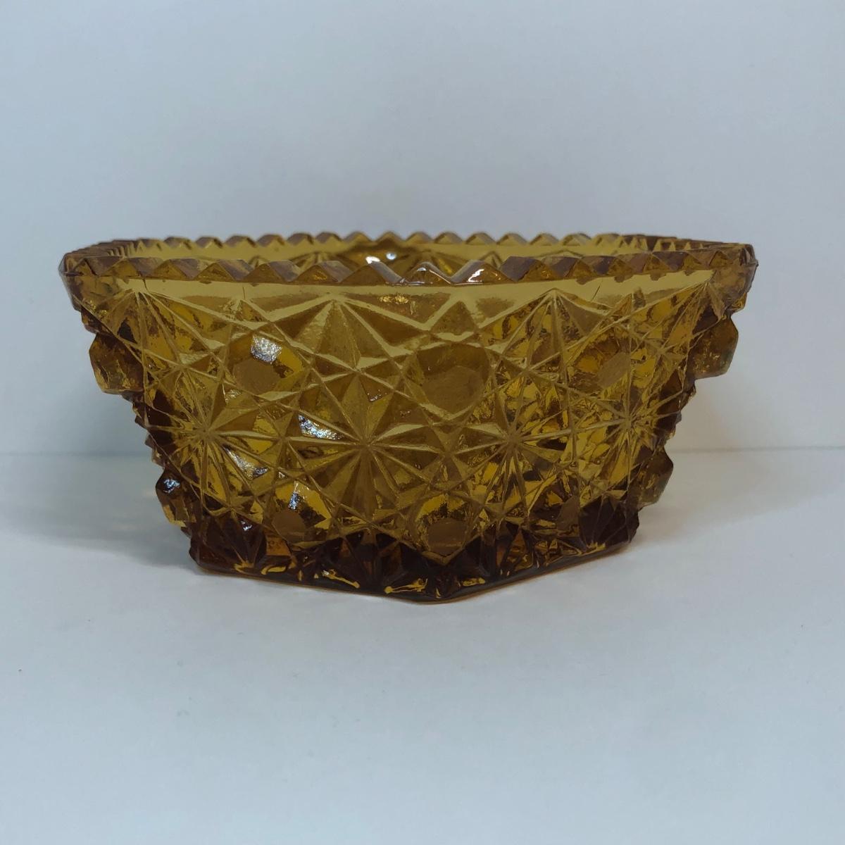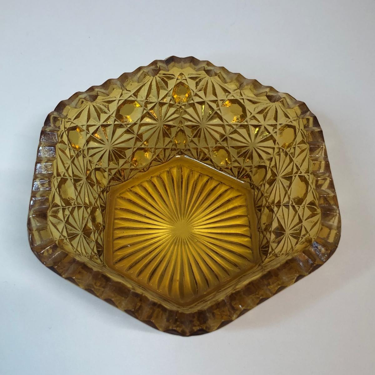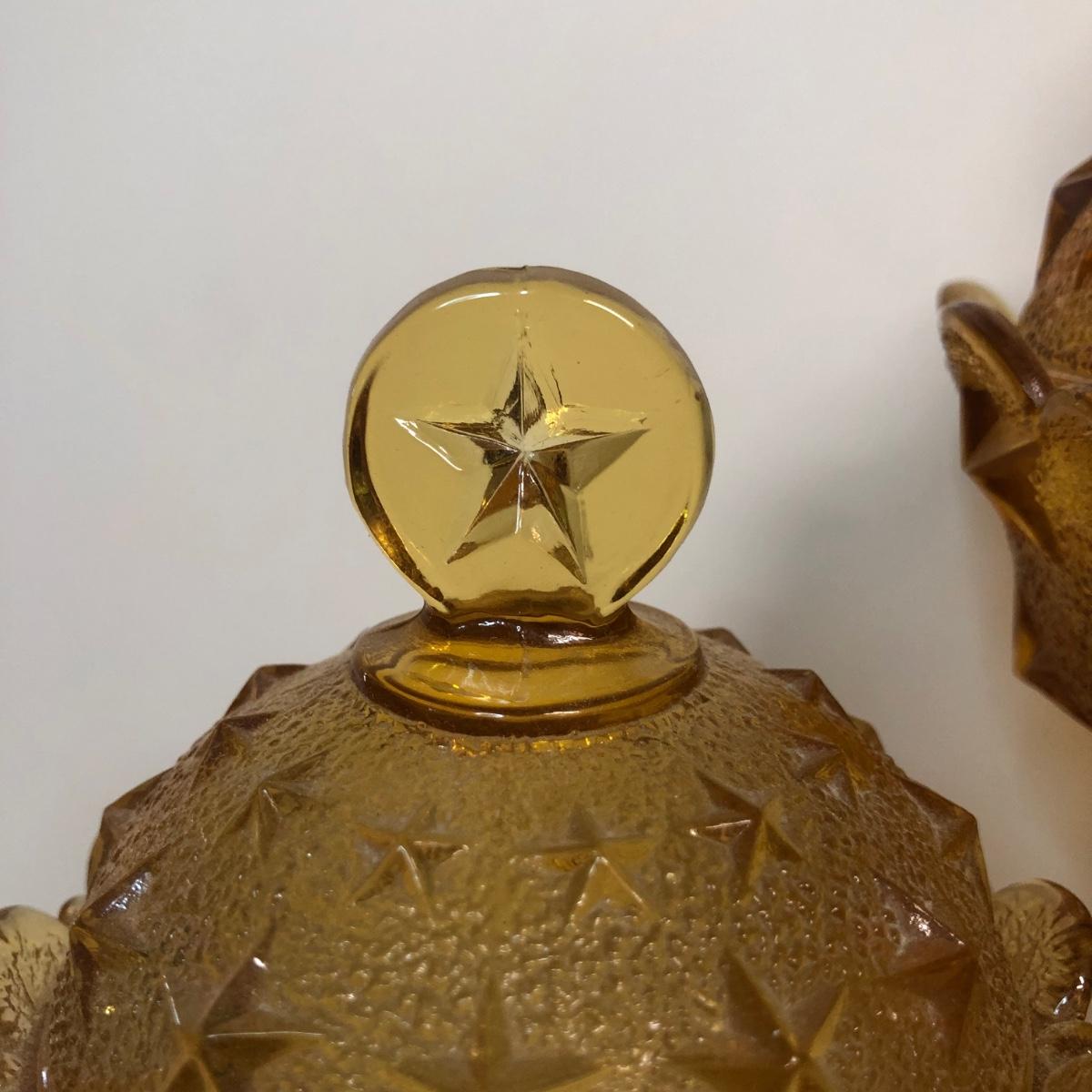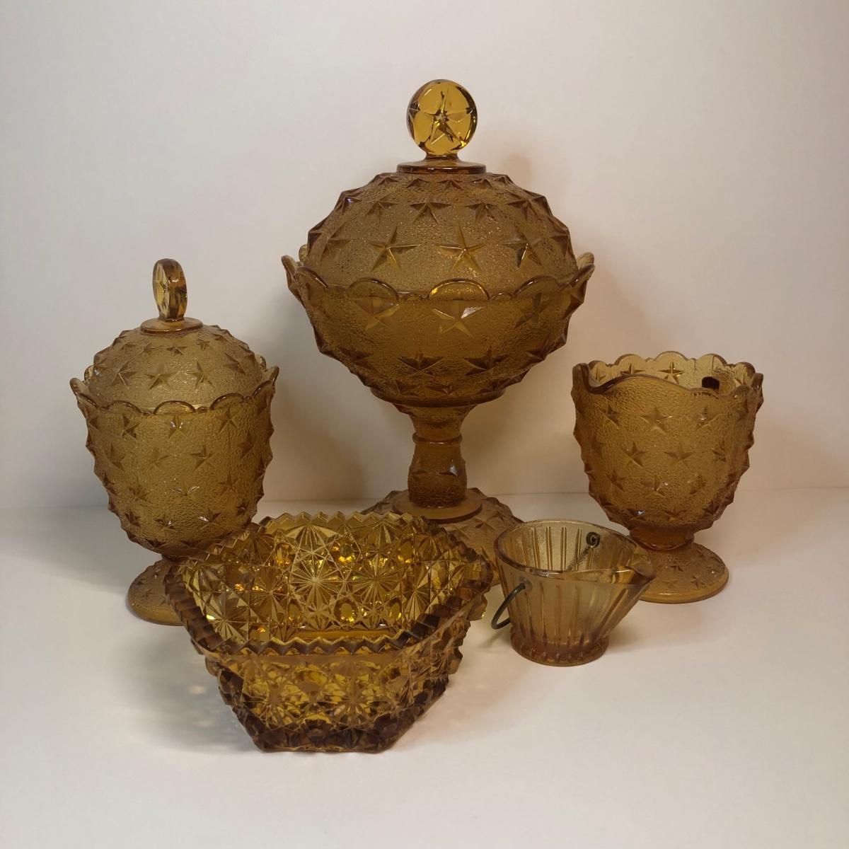 Includes three amber pieces with a star pattern and two other pieces of amber glass.
