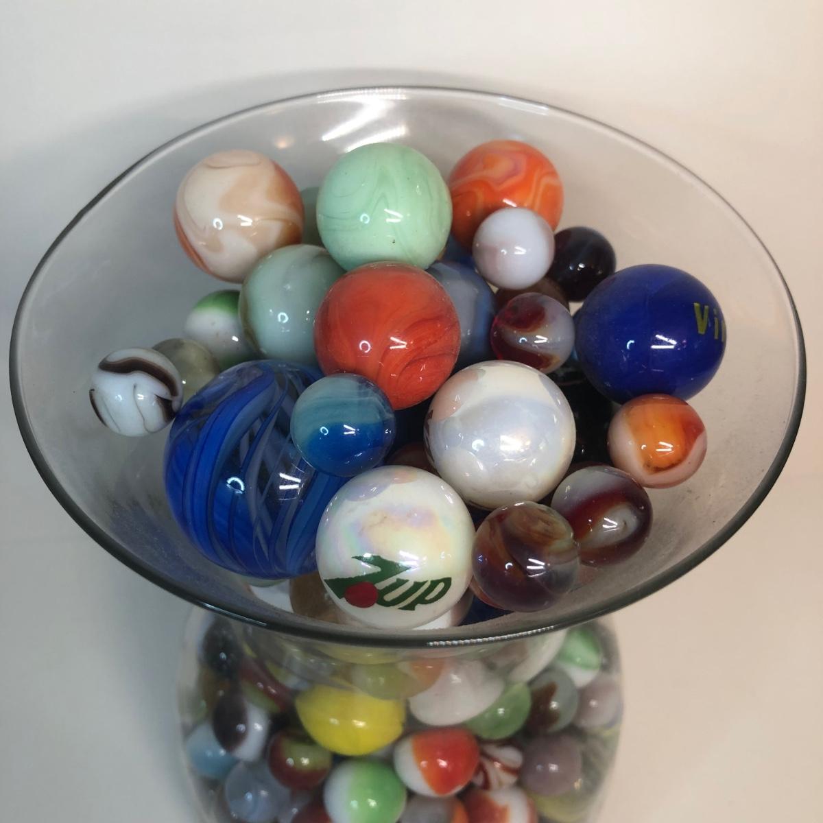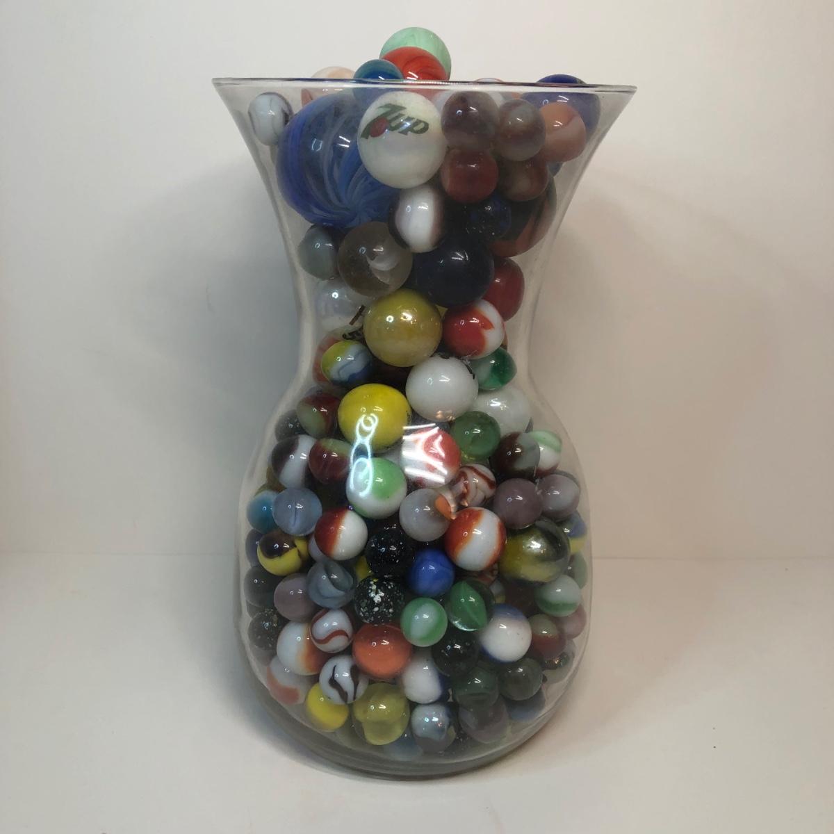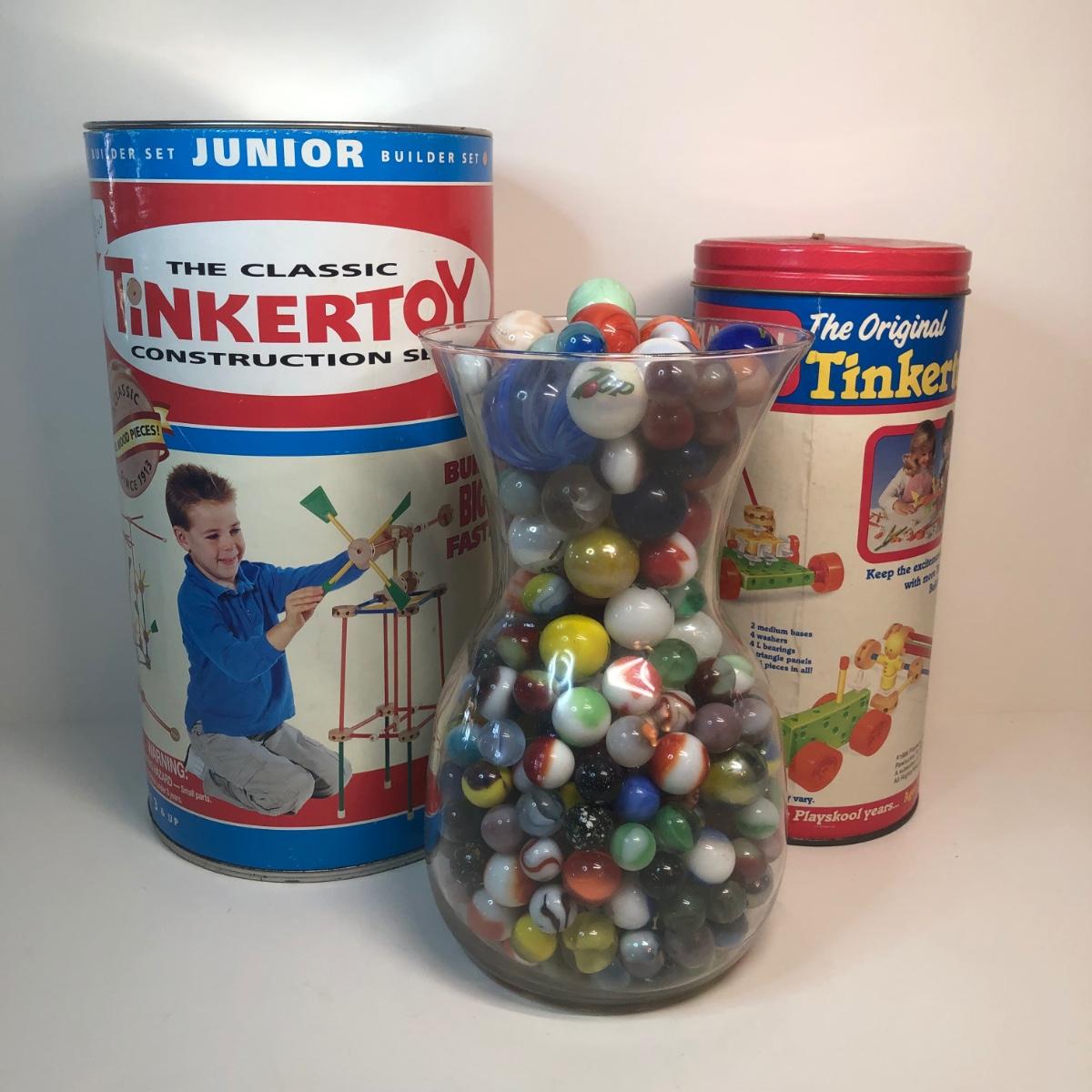 LOT 12M: Large Jar of Marbles & Vintage Tinkertoy Construction Sets (incomplete)