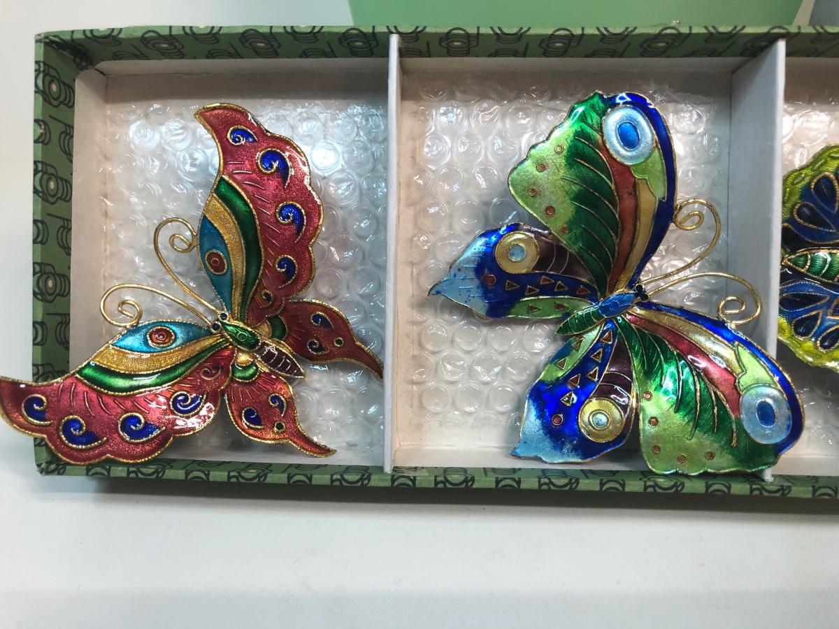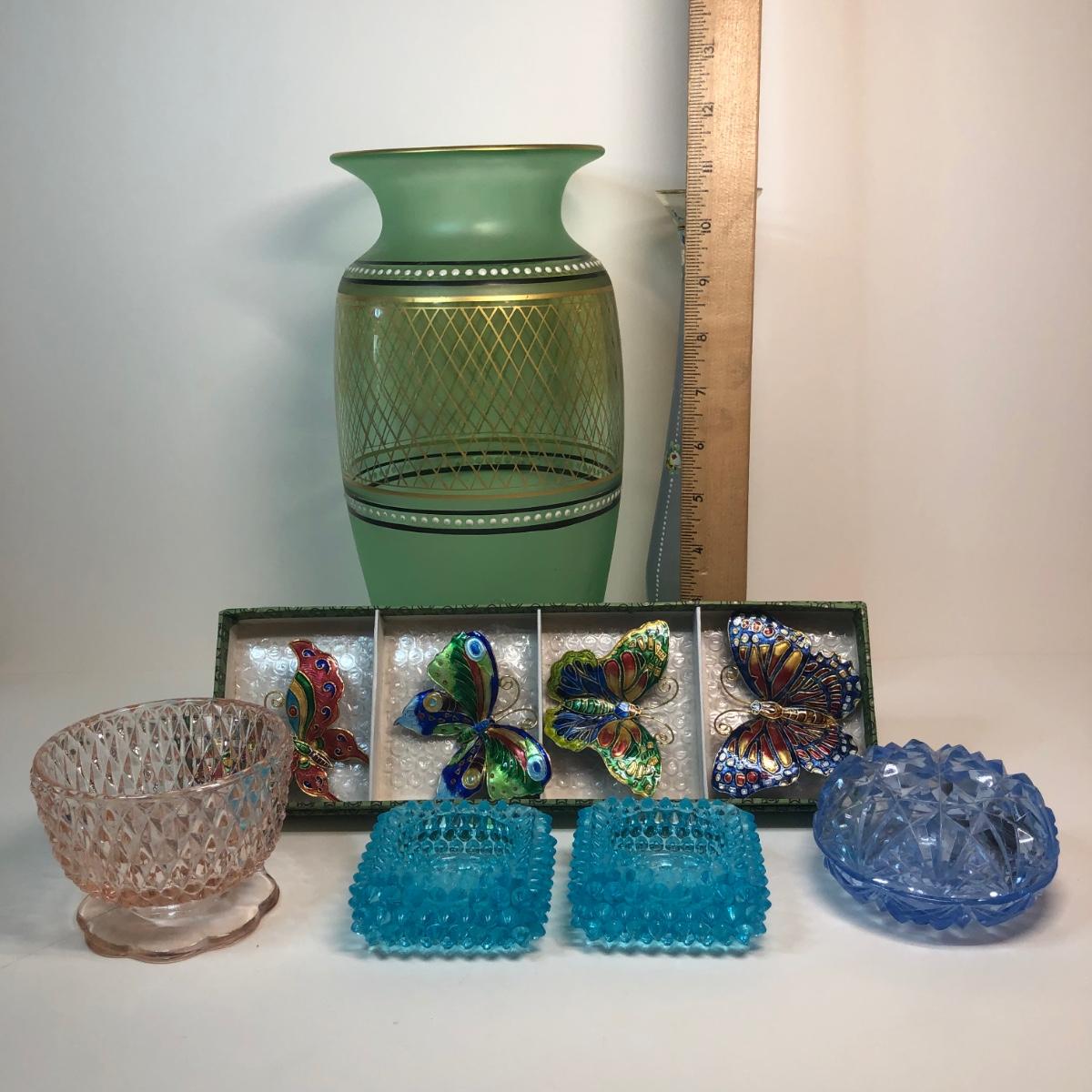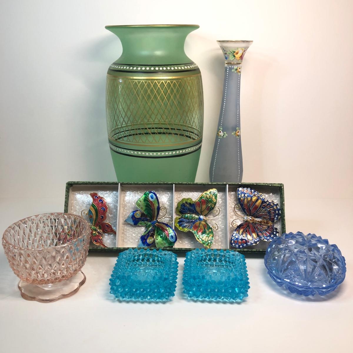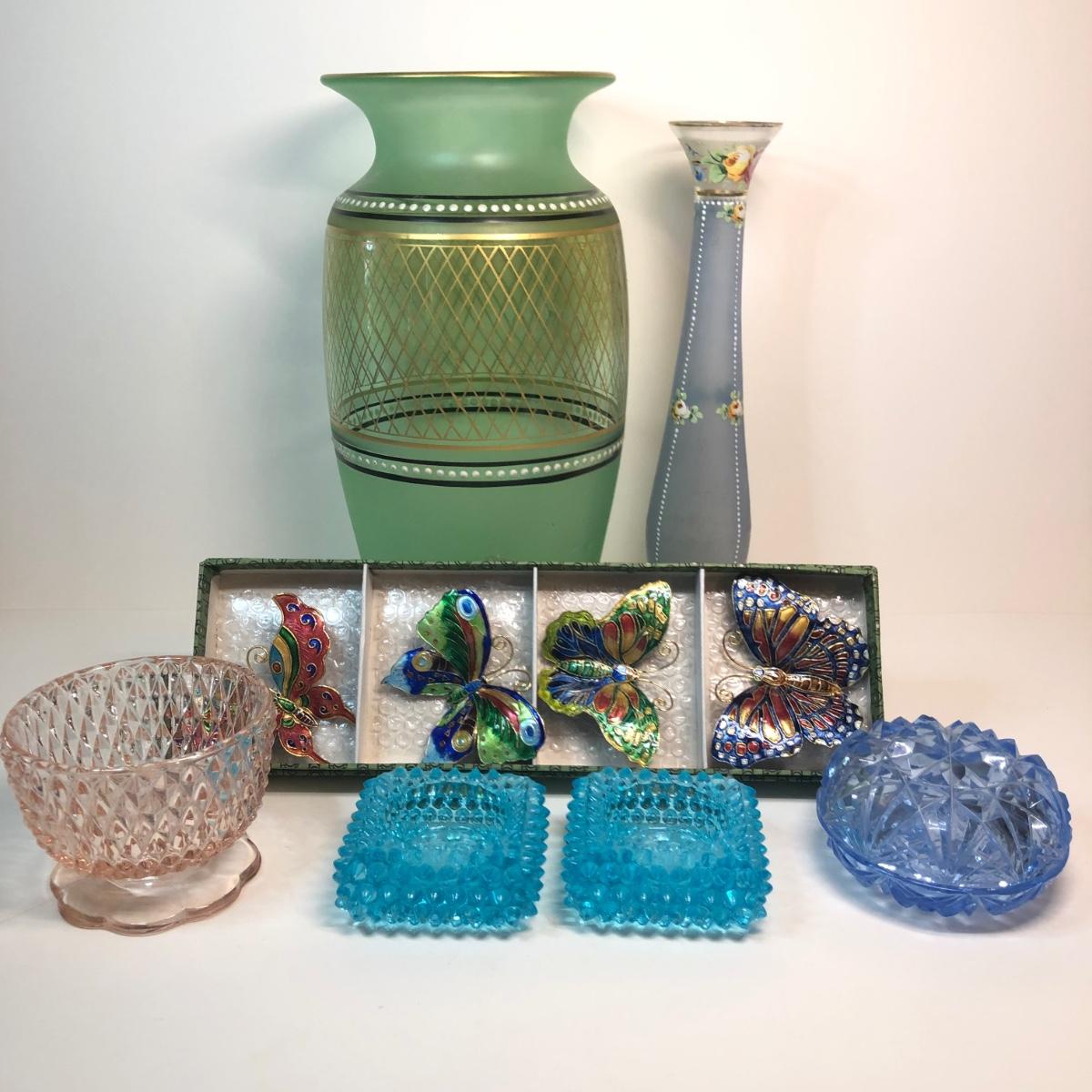 LOT 13M: Beautiful Vintage Hand Painted Vases, Pink & Blues Glassware & Metal/Enamel Butterflies w/Original Box