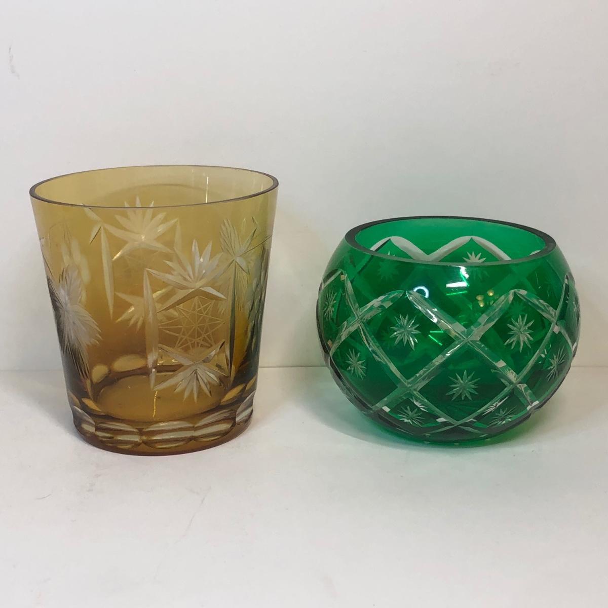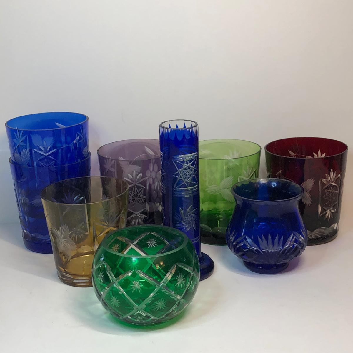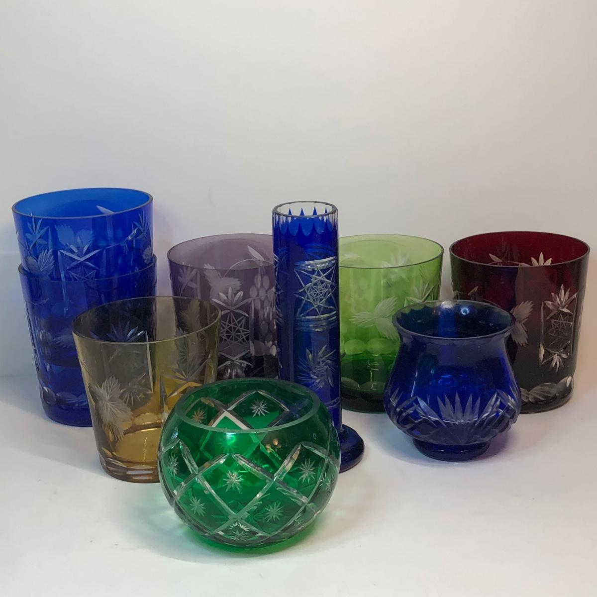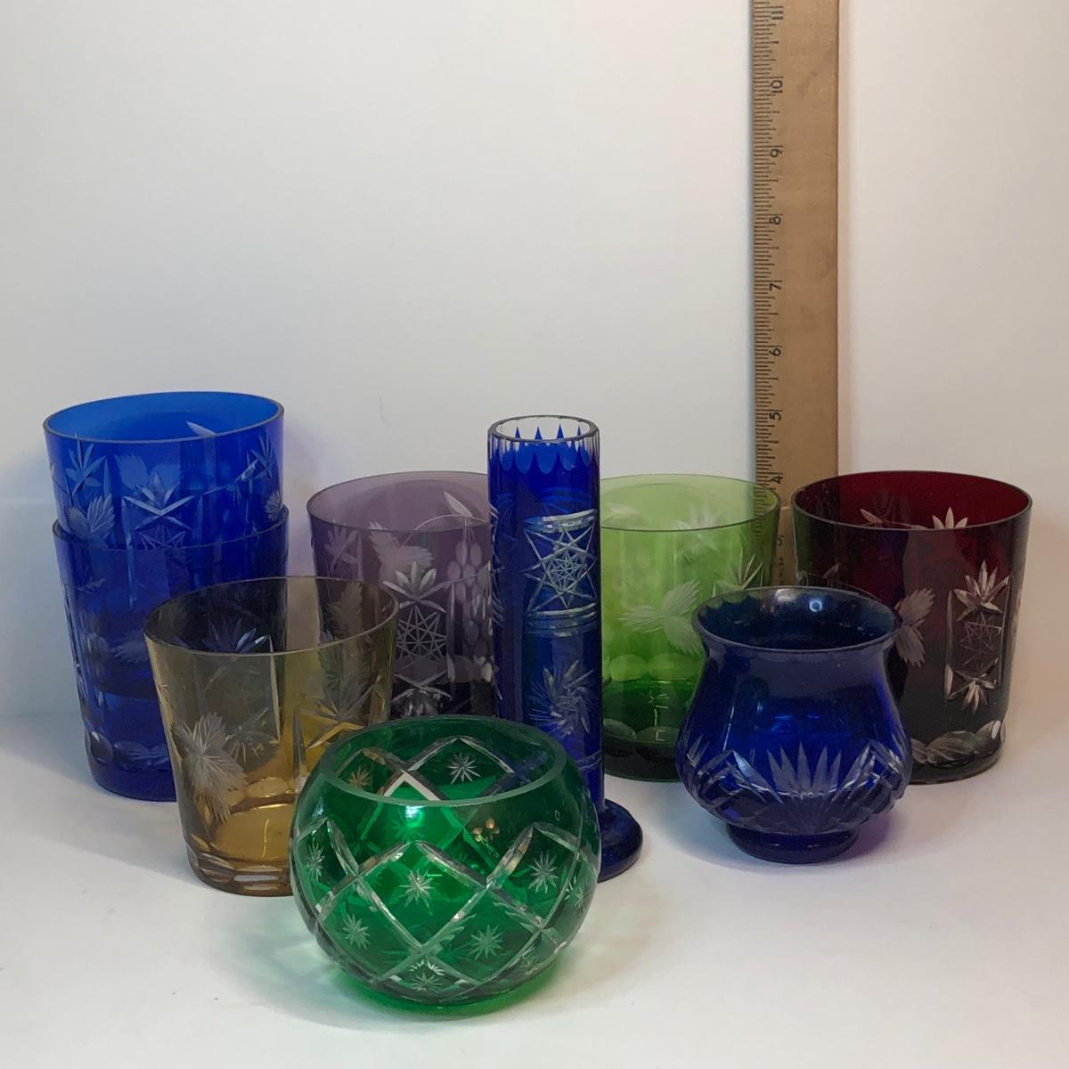 LOT 22M: Colored Glass Cut to Clear Collection - Cups, Candle Holders & More