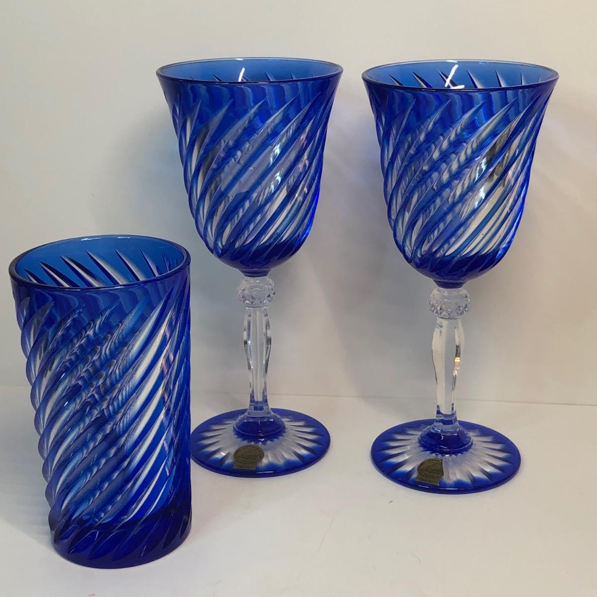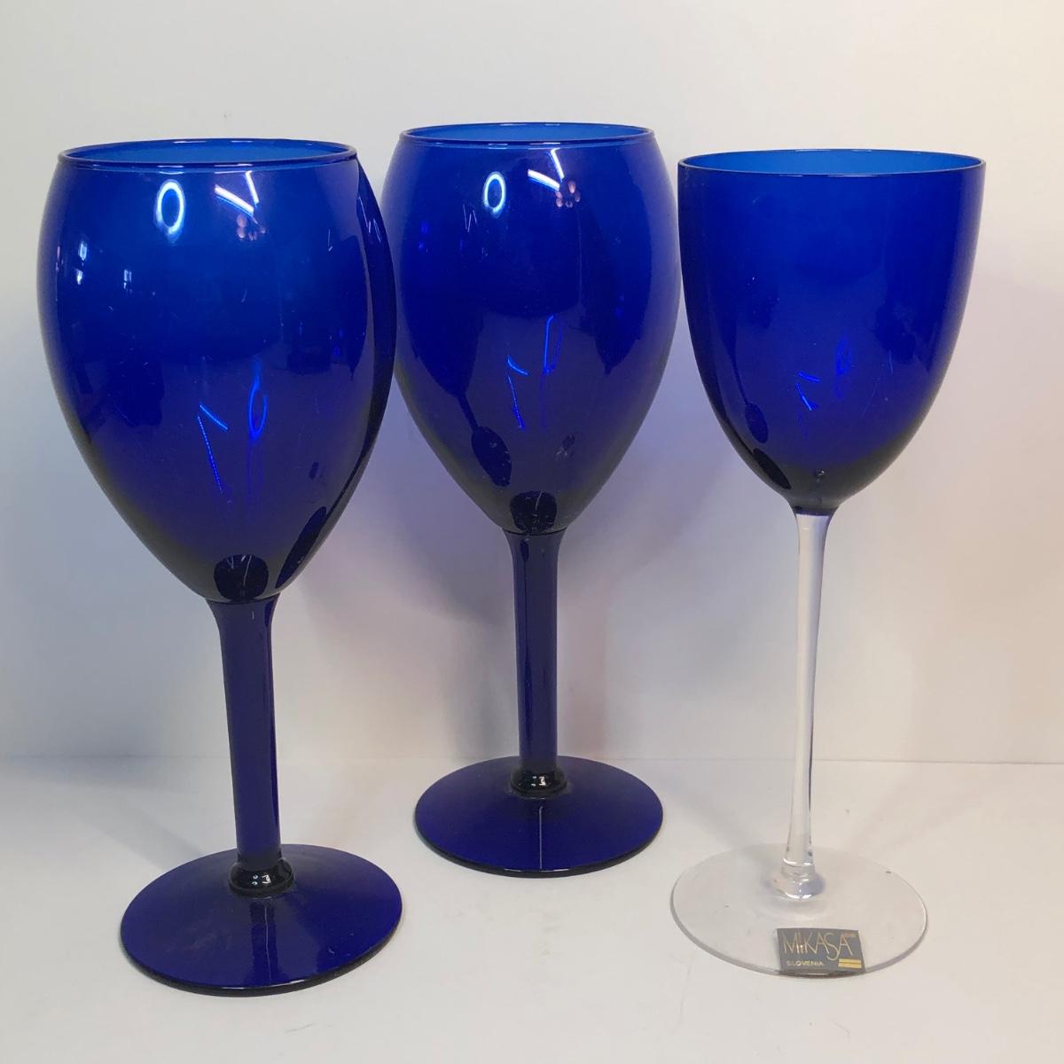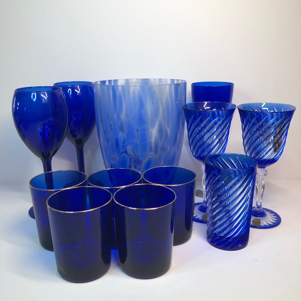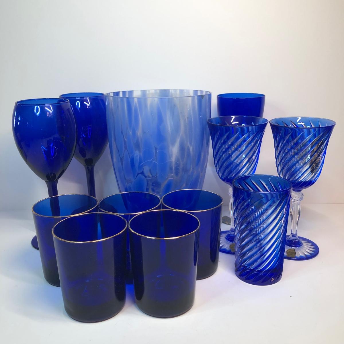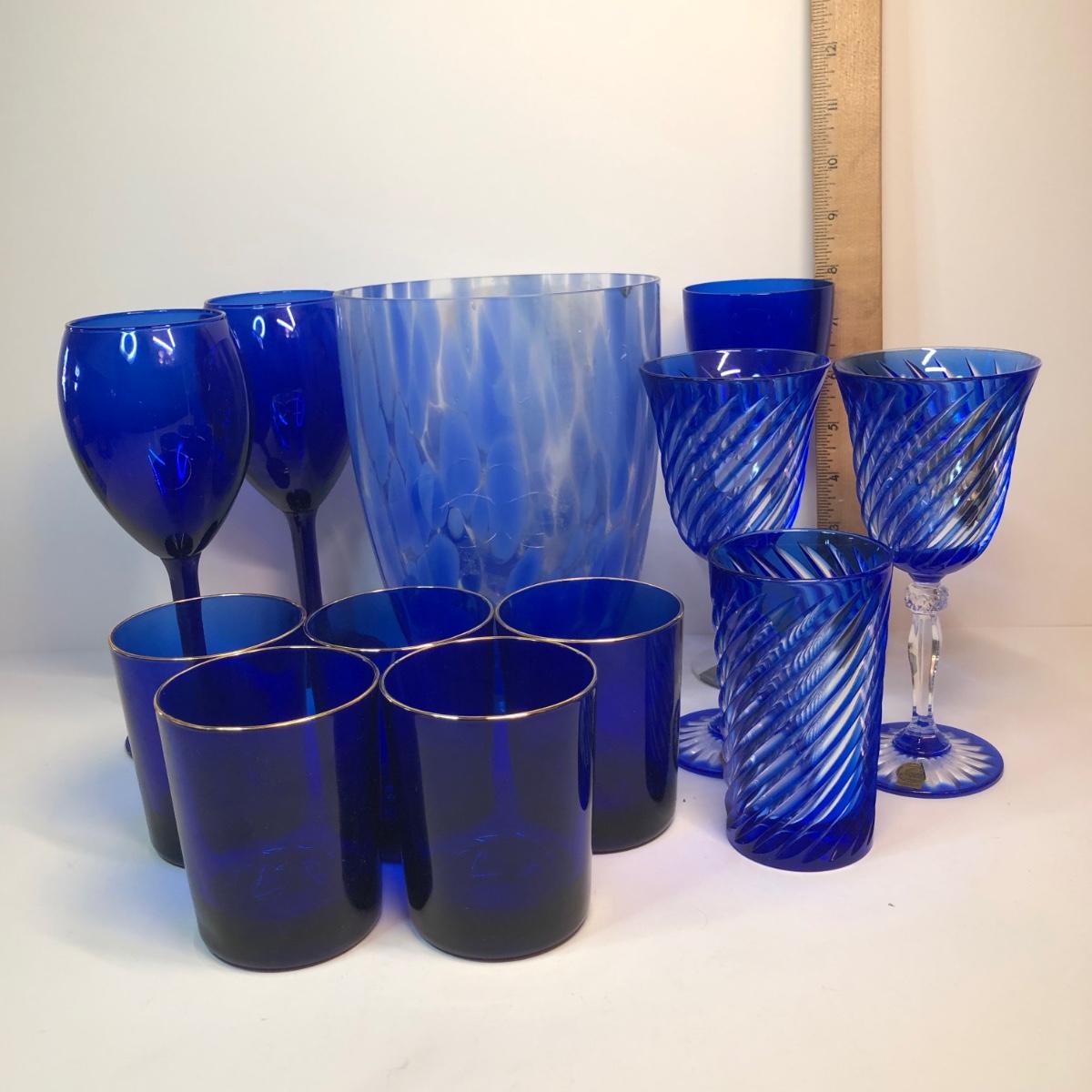Includes two crystal cut glasses, five glasses with gold colored rims marked "France," a Mikasa wine glass, two other blue wine glasses and a blue design vase.