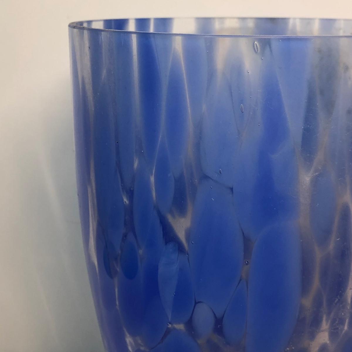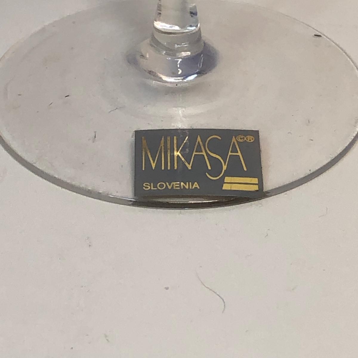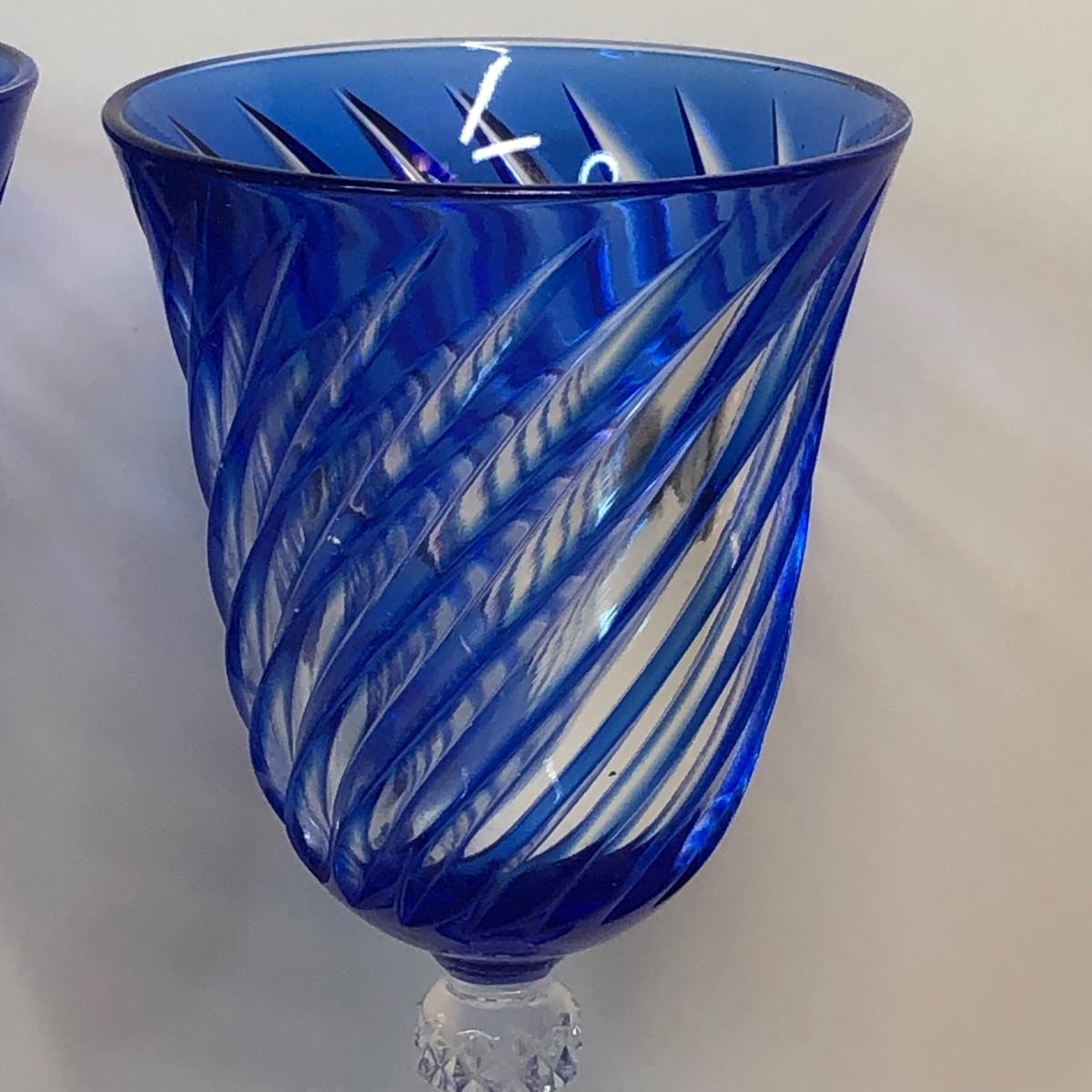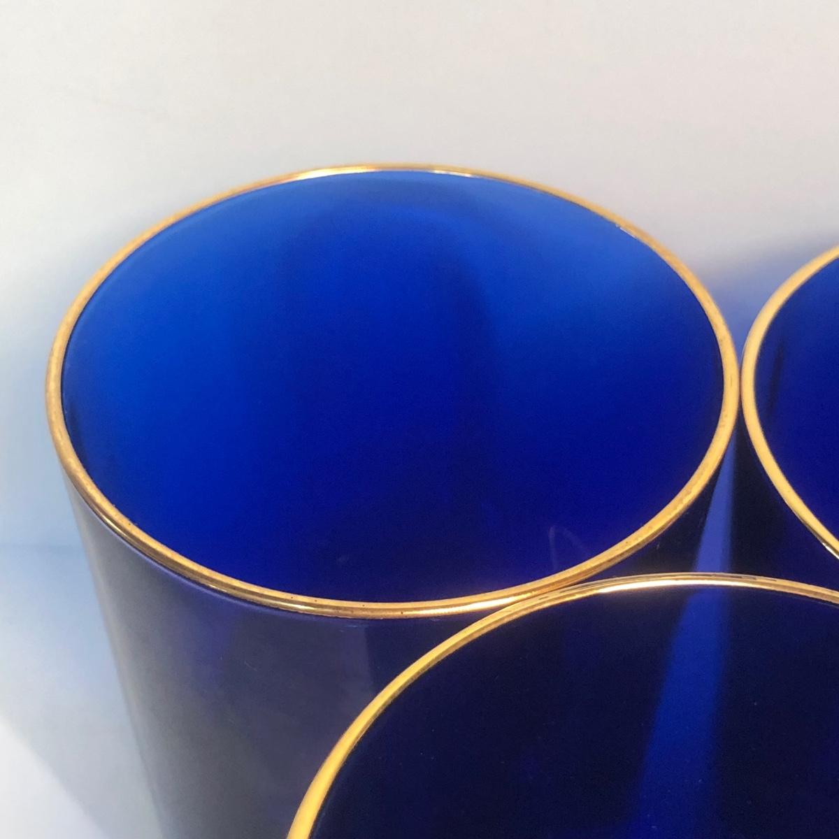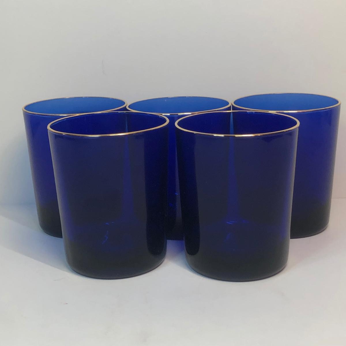 Includes two crystal cut glasses, five glasses with gold colored rims marked "France," a Mikasa wine glass, two other blue wine glasses and a blue design vase.