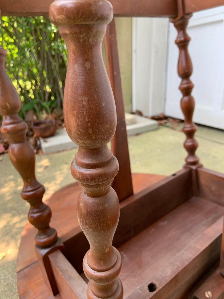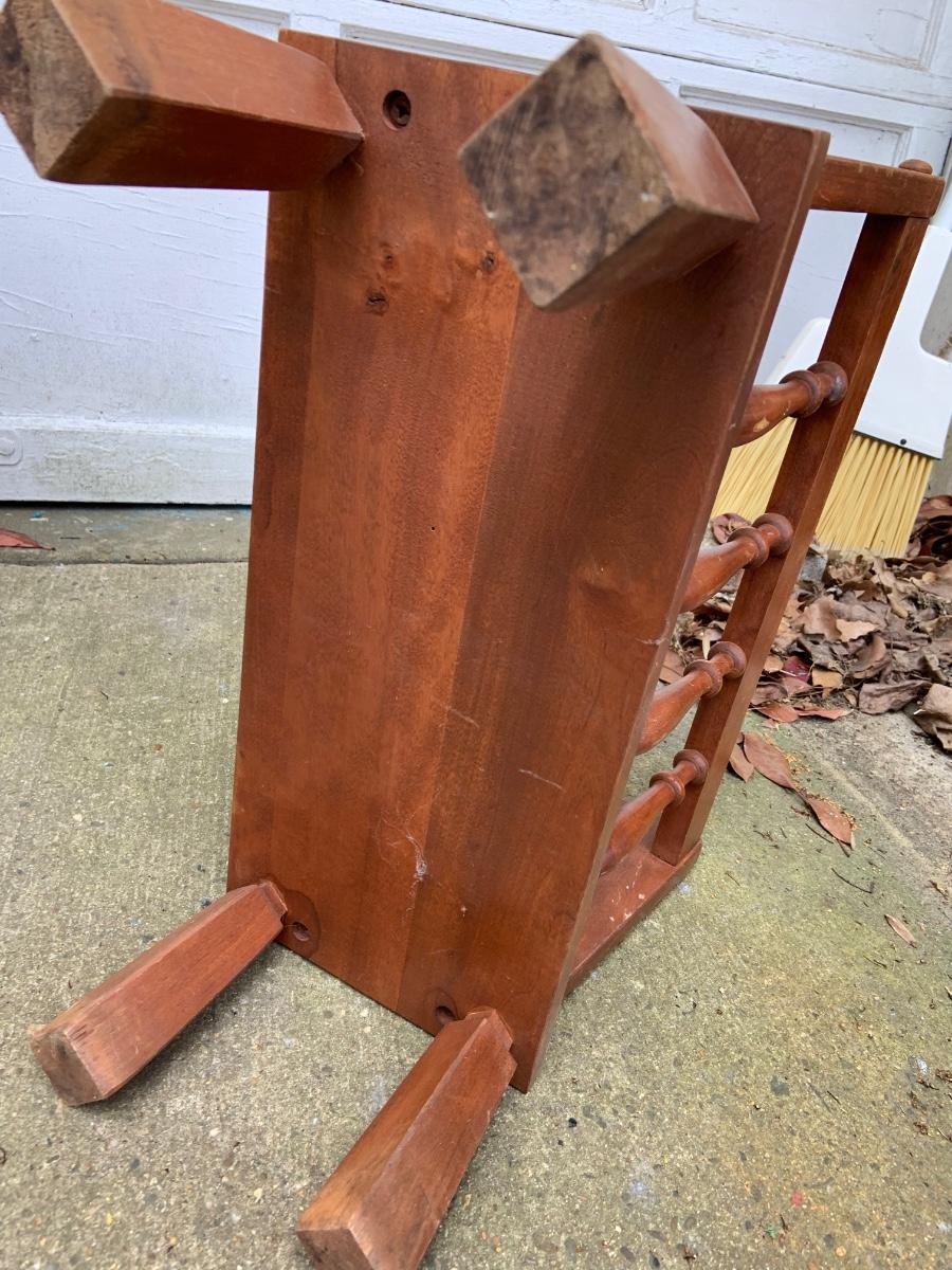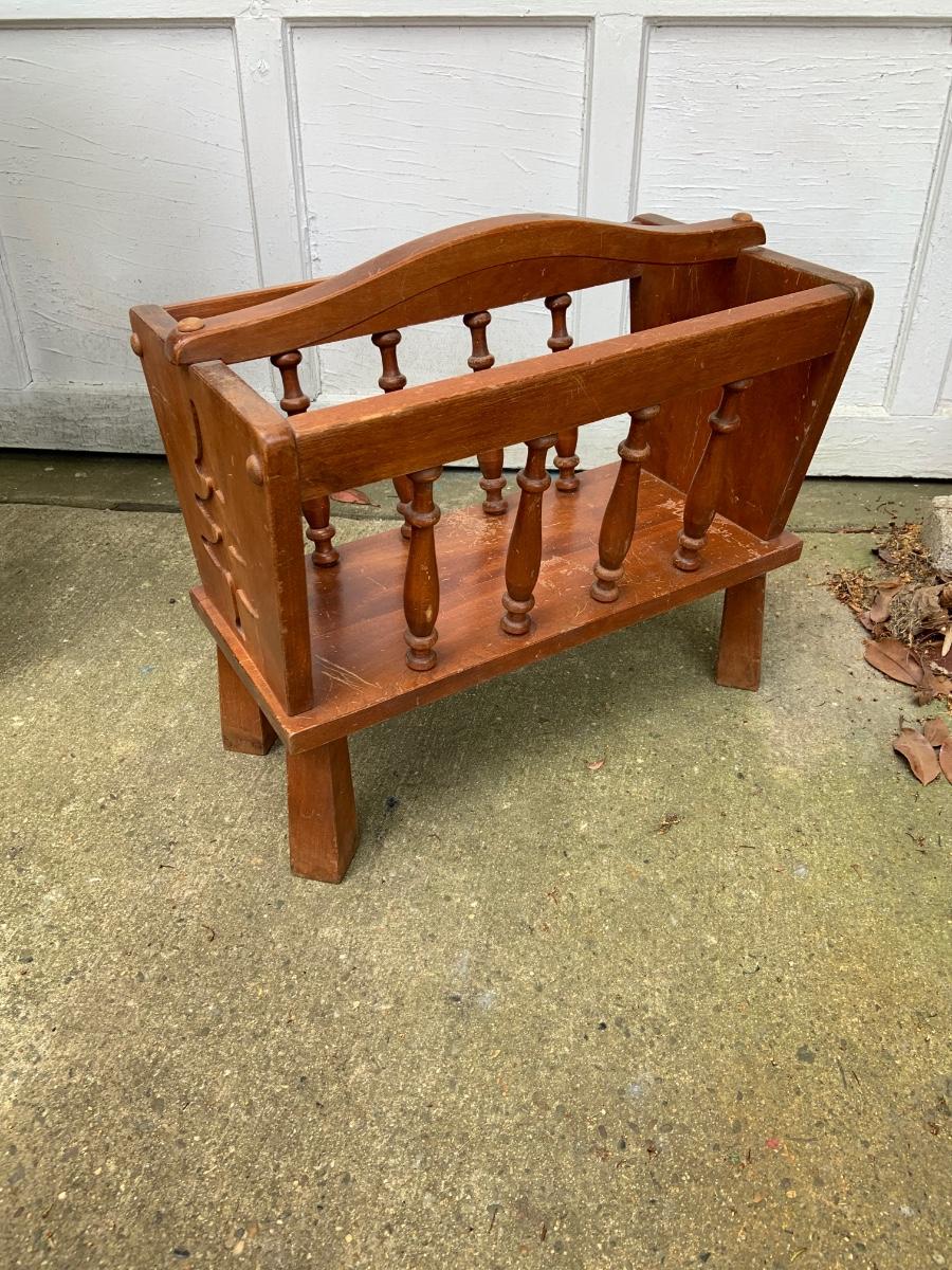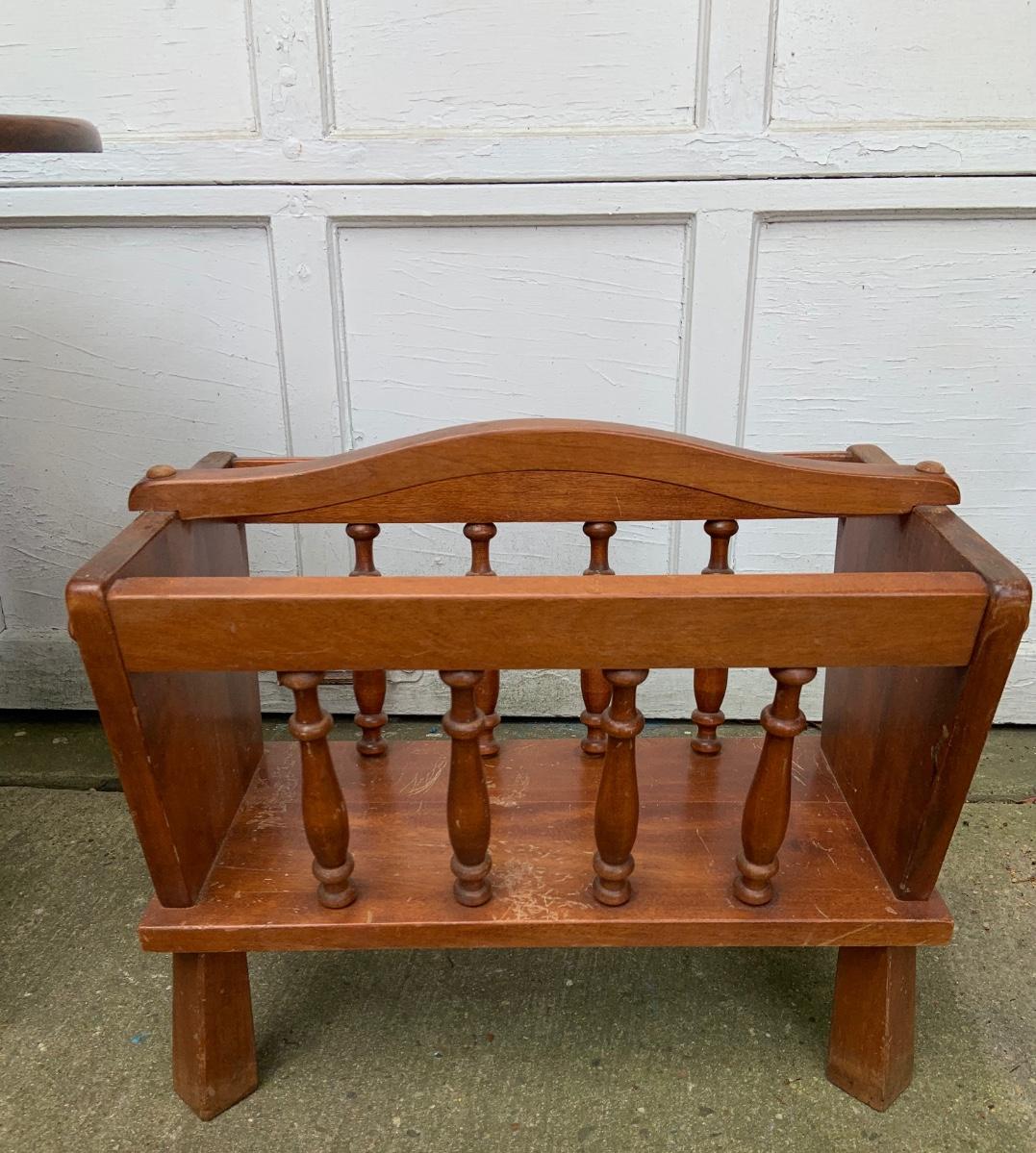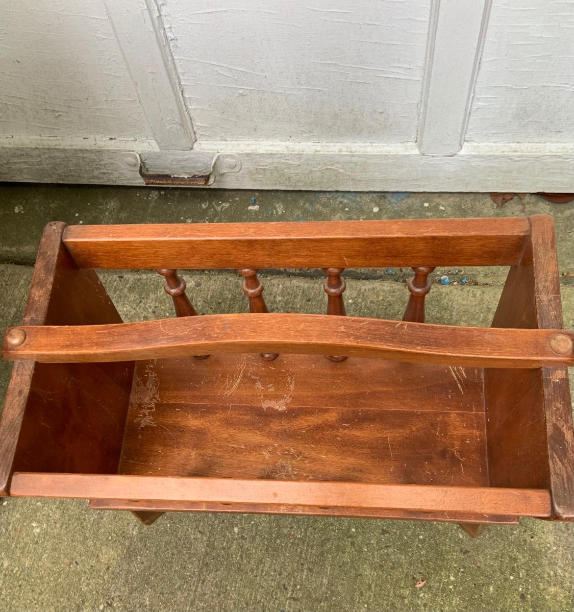 The table needs some attention and with the leafs dropped measures 18" 30" x 22" and the Magazine Rack is approximatly 18" x 10" x 15" Please see all pictures as they are the best representation of the items. The pictures show condition, measurements if taken, and what is included in the lot. Due to the large amount that we photograph and the time frame, we are not always able to take measurements. All items unless noted, are pre-owned and have been used. If you purchased furniture, you must bring help. We do not allow one person to carry large furniture out on their own. Bring help, tools and a truck for the safety of our client’s homes, and your personal safety. Any damages that result to the property including walls, and floors due to moving of the furniture will be charged to the buyer. Company policy. Thank you.