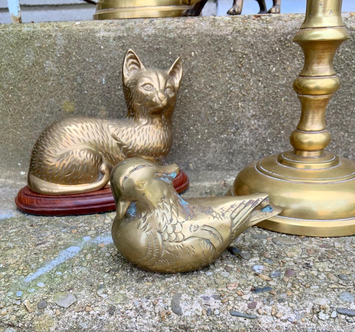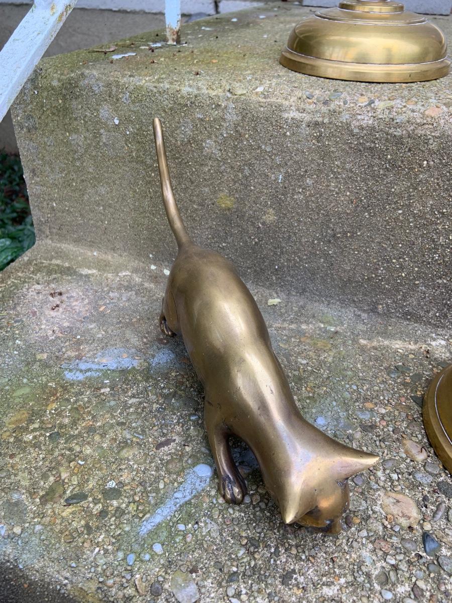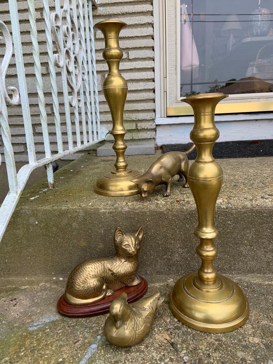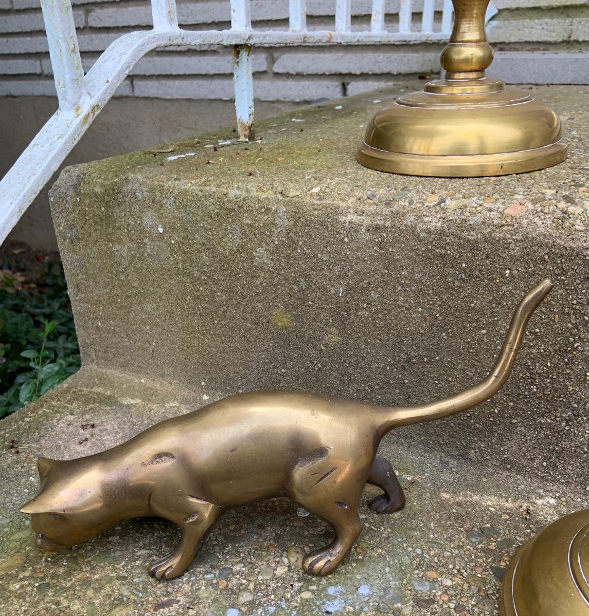 LOT:32G: Tall Brass Candle Sticks, Brass Cats and a Brass Bird