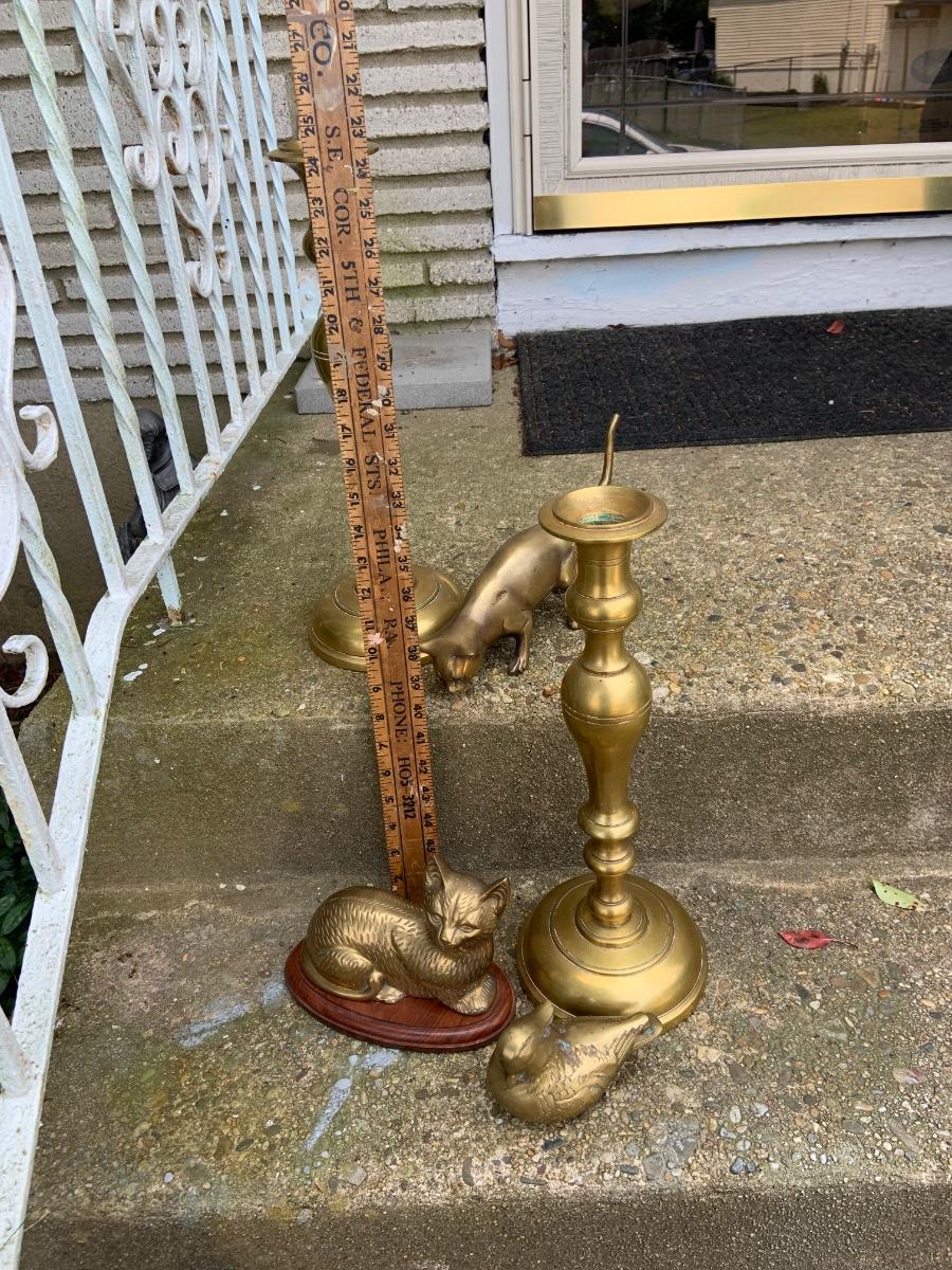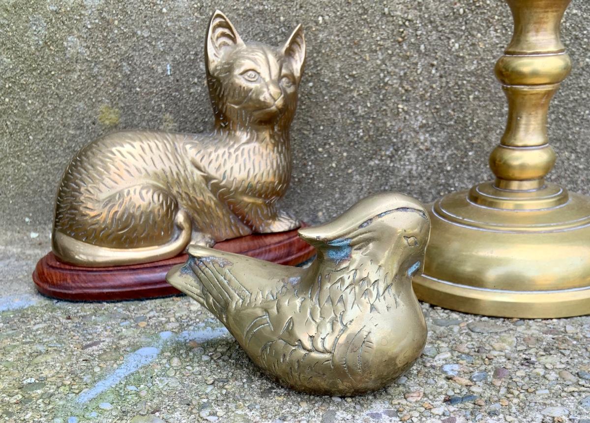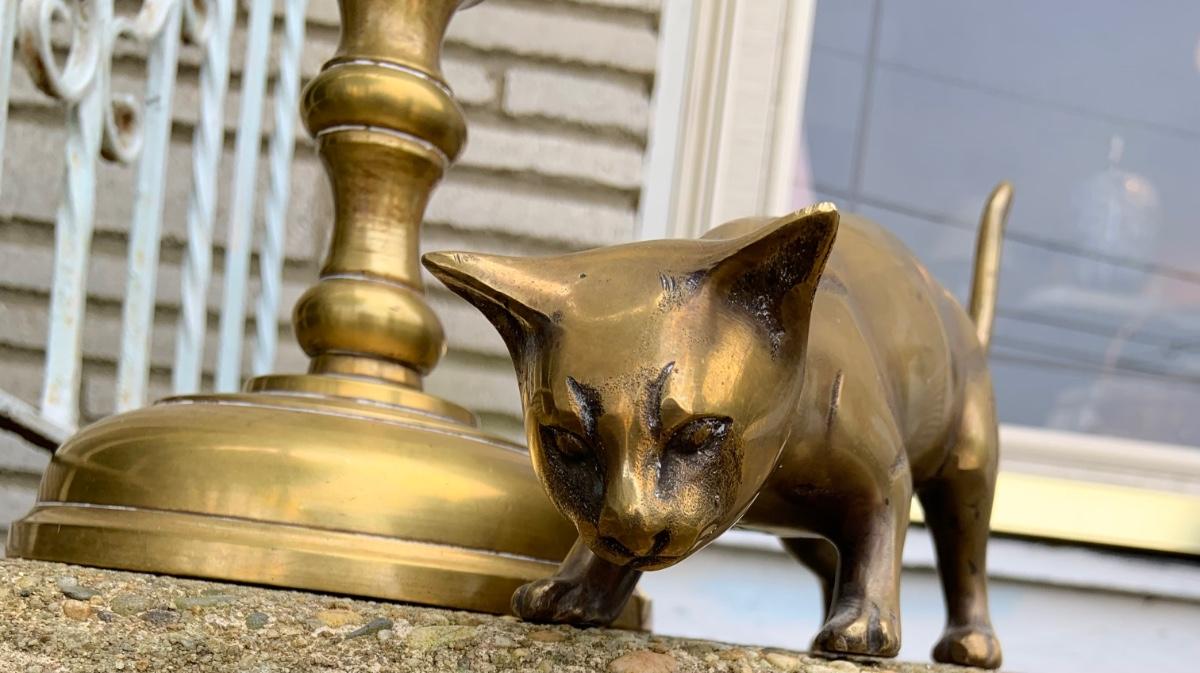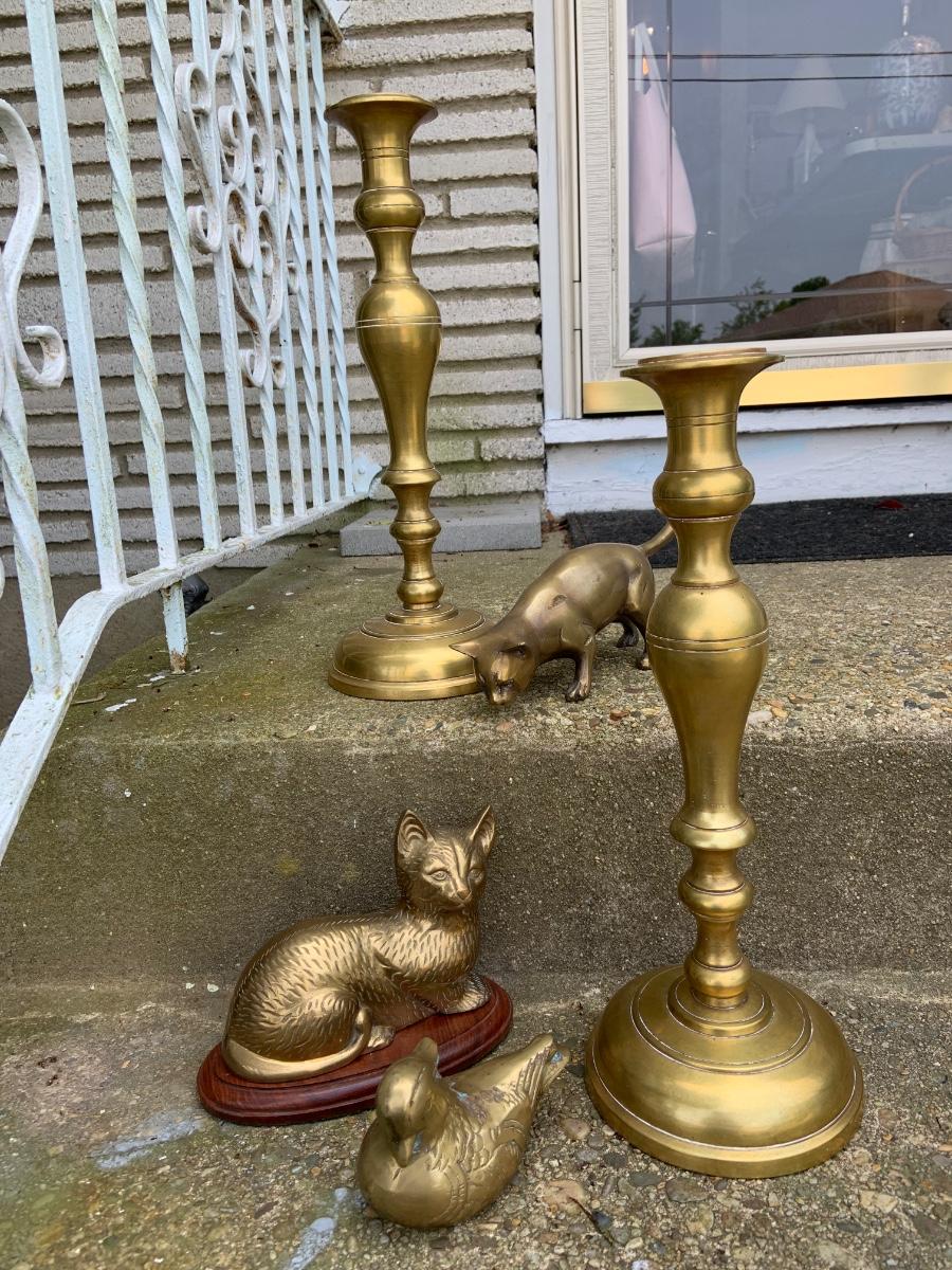 LOT:32G: Tall Brass Candle Sticks, Brass Cats and a Brass Bird