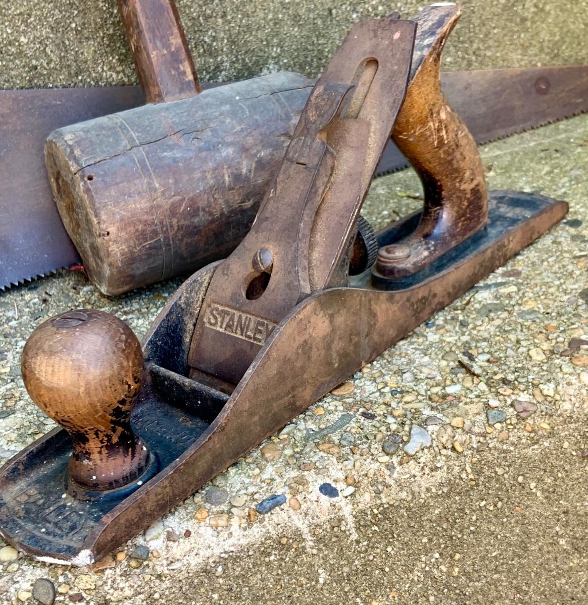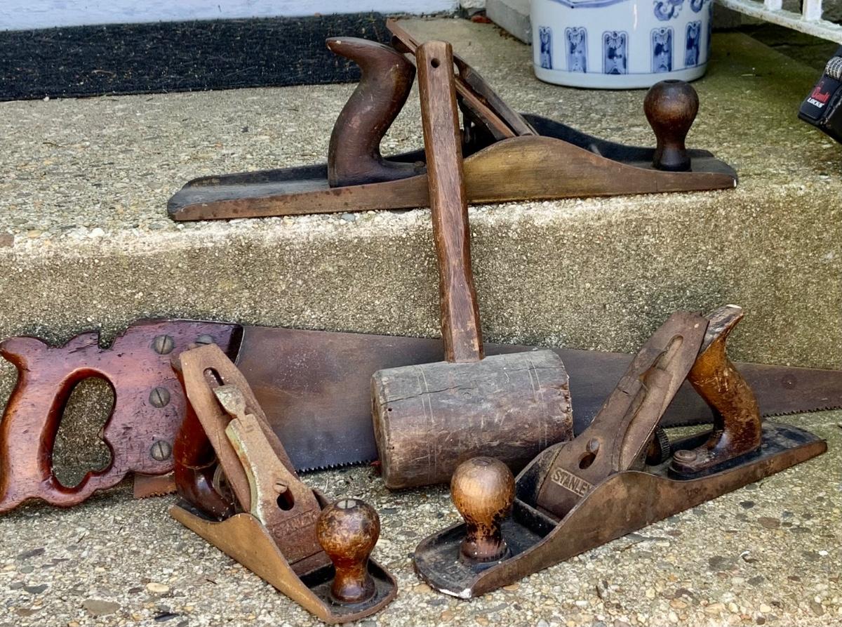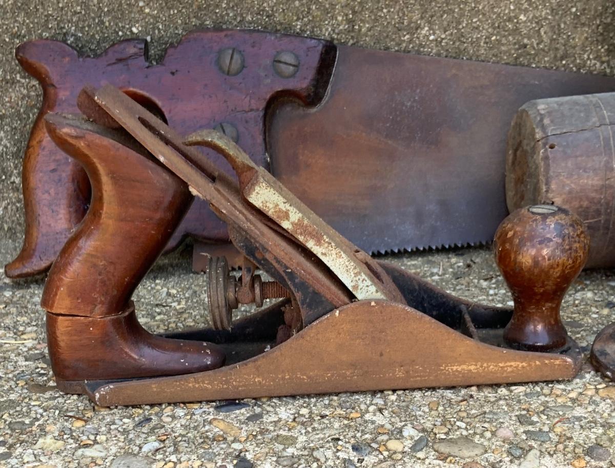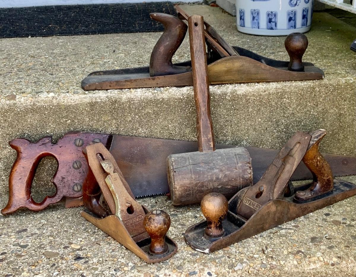 LOT:44G: Vintage and Antique Tools Including An Antique Saw From Disston Saw Works,  WoodenMallet, a Stanley and Other Wood Planes,