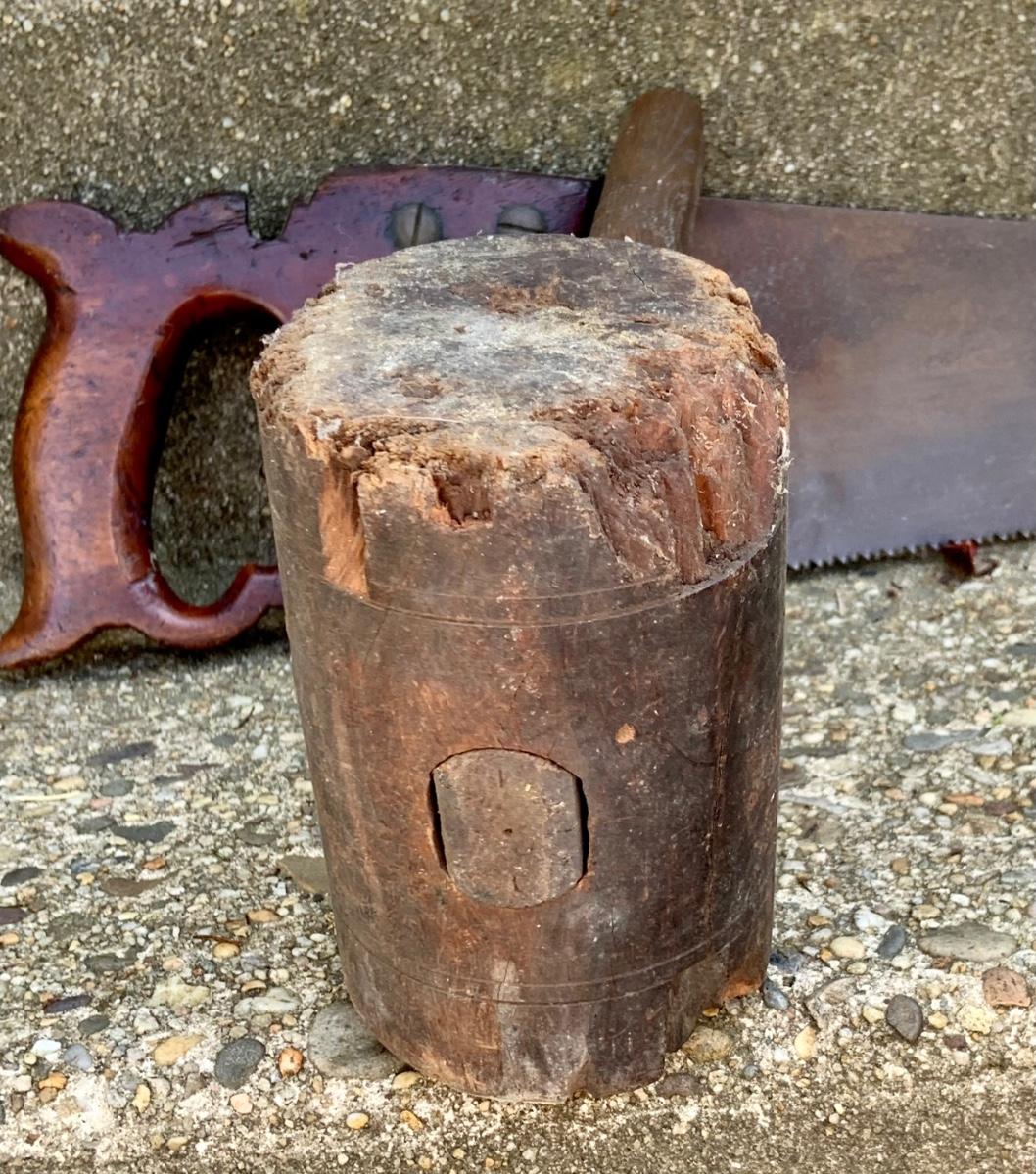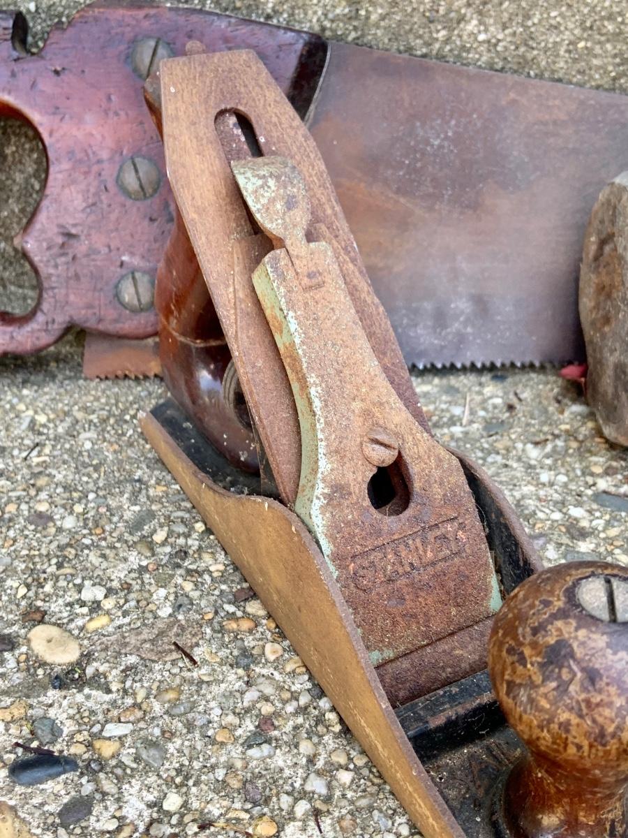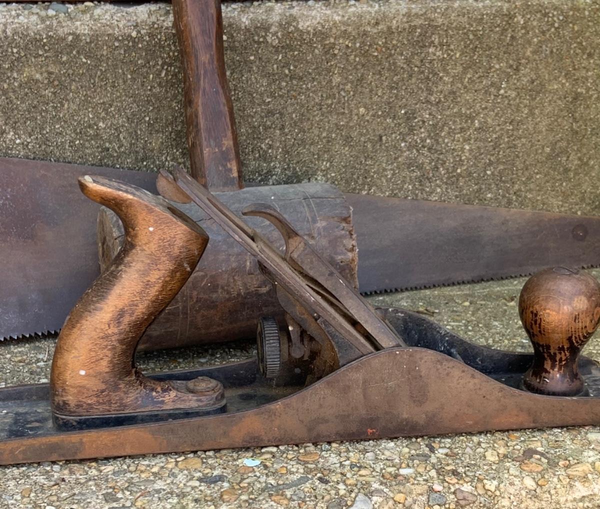 LOT:44G: Vintage and Antique Tools Including An Antique Saw From Disston Saw Works,  WoodenMallet, a Stanley and Other Wood Planes,