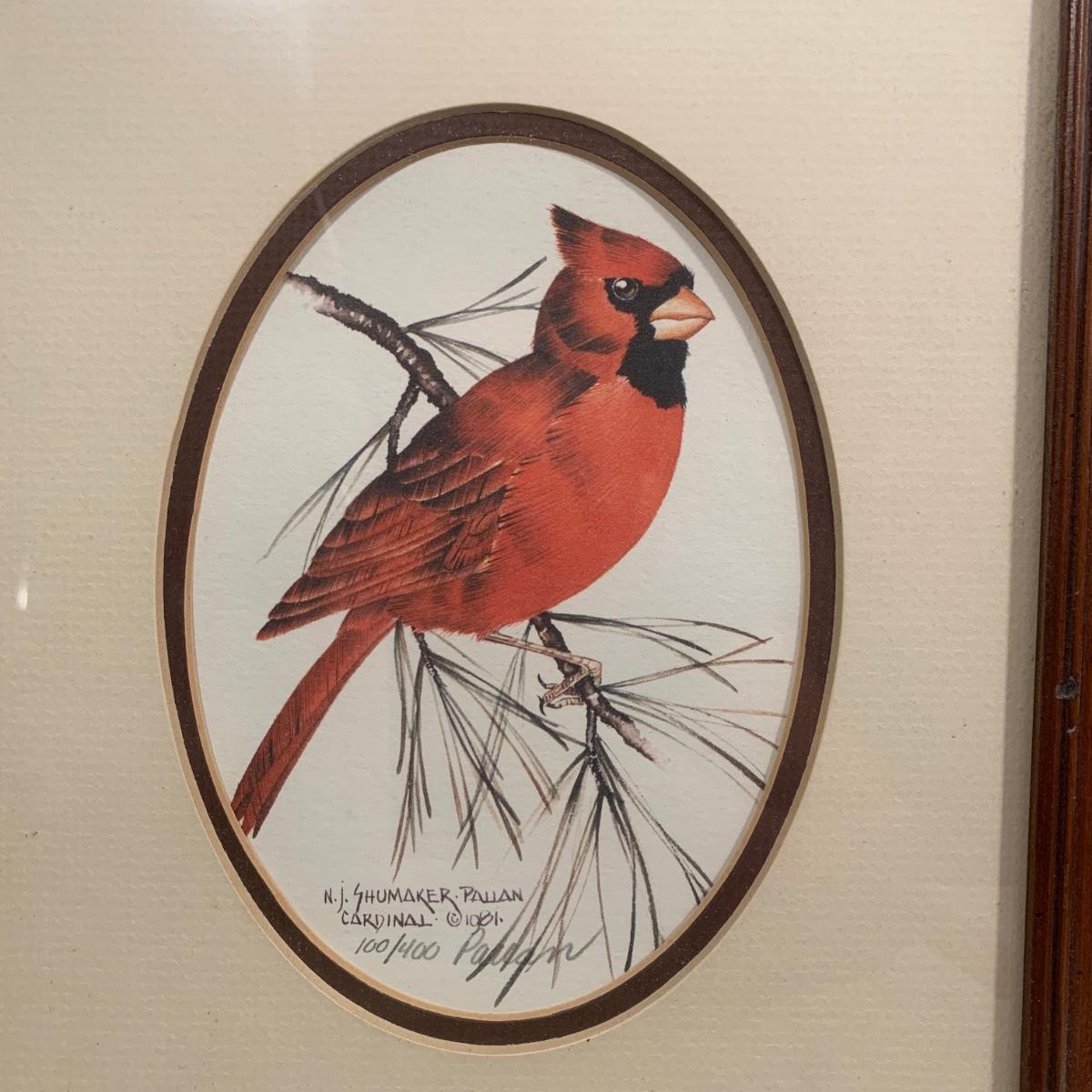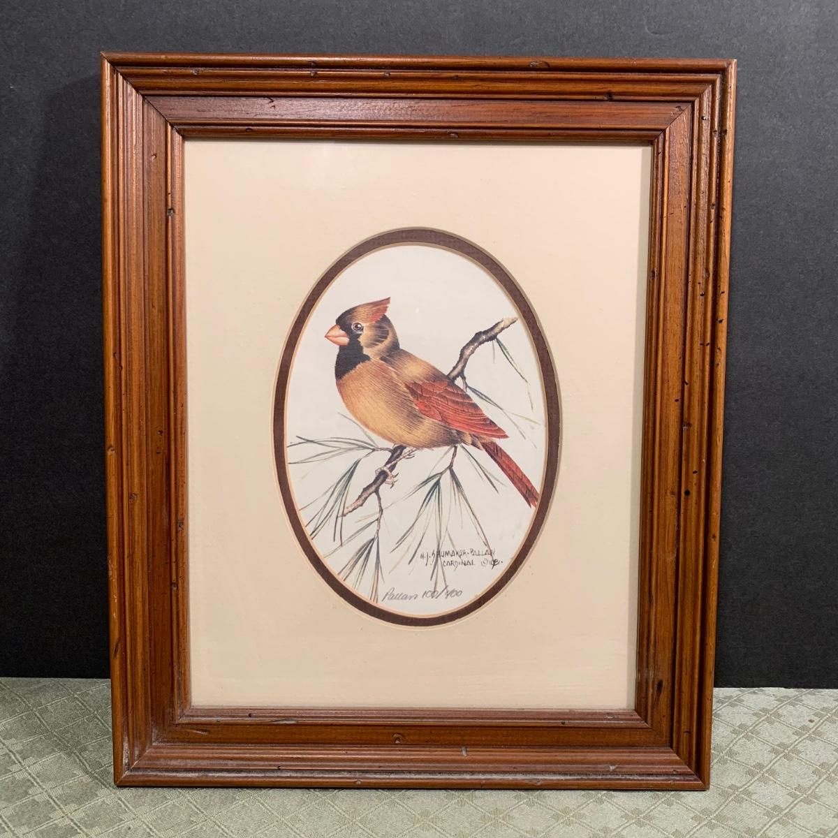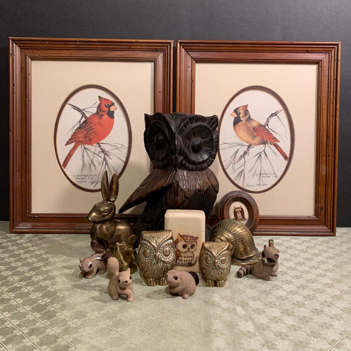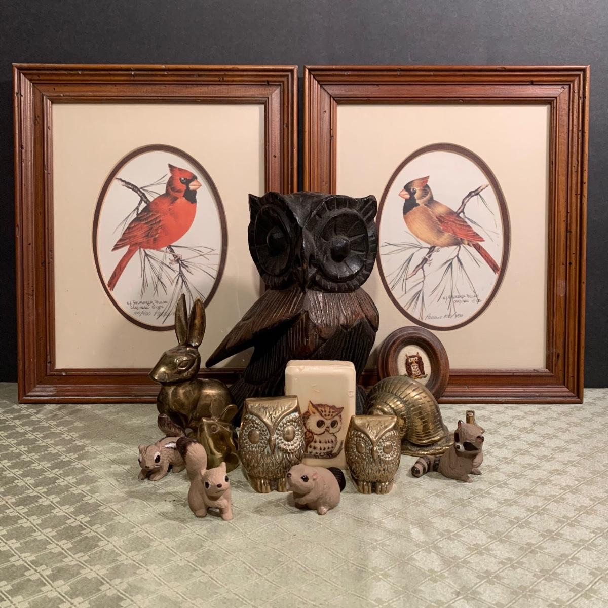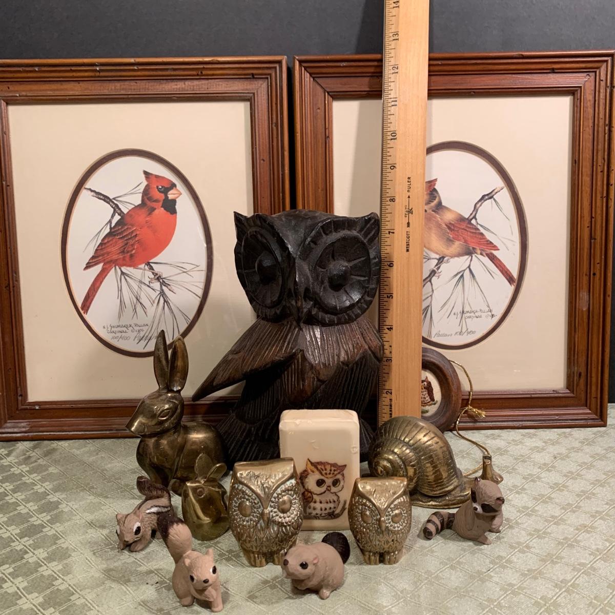 LOT 49R: Nancy Shumaker Pallan Signed and Numbered Cardinal Prints and Other Woodland Figurines In Wood Brass and Ceramic