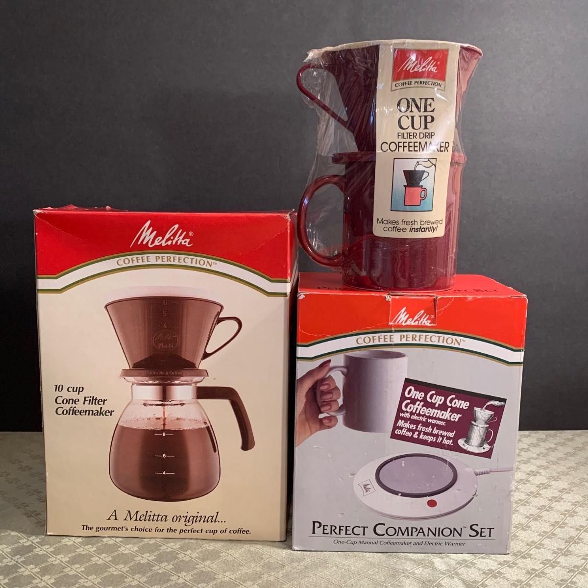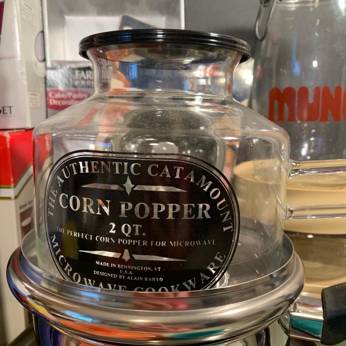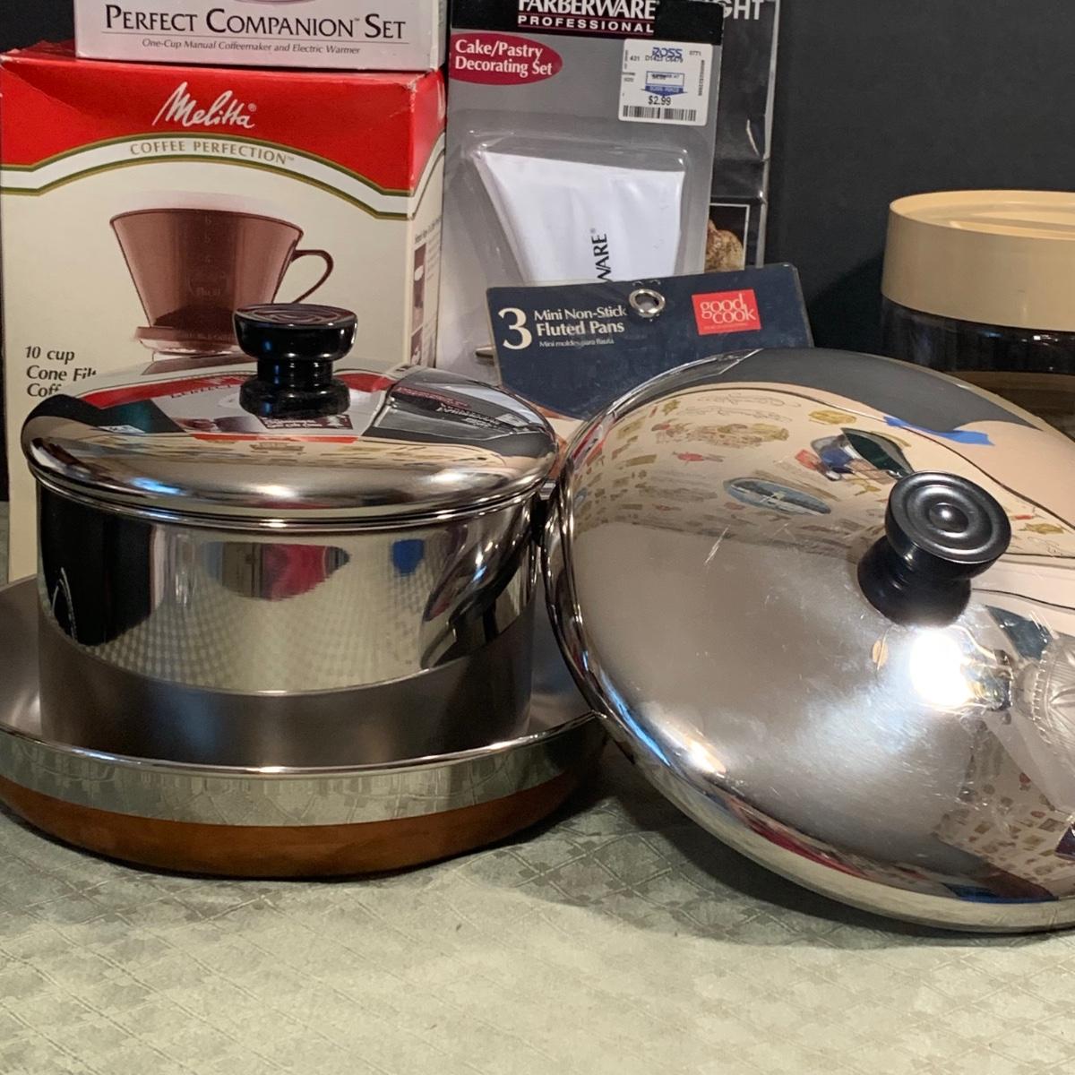 LOT 64R: Kitchen Must Haves -  Revere Ware Pans. Melitta Coffee Maker, Pampered Chief, Glass Popcorn Maker, Vintage Plastic Cups and Plates; and Much More