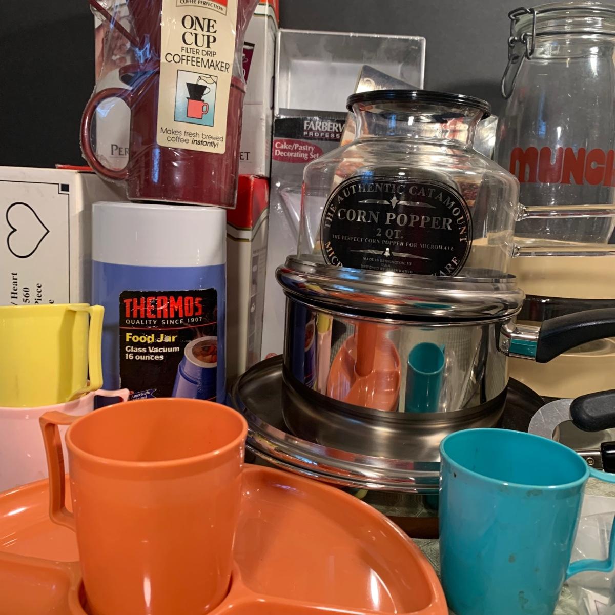 LOT 64R: Kitchen Must Haves - Revere Ware Pans. Melitta Coffee Maker, Pampered Chief, Glass Popcorn Maker, Vintage Plastic Cups and Plates; and Much More