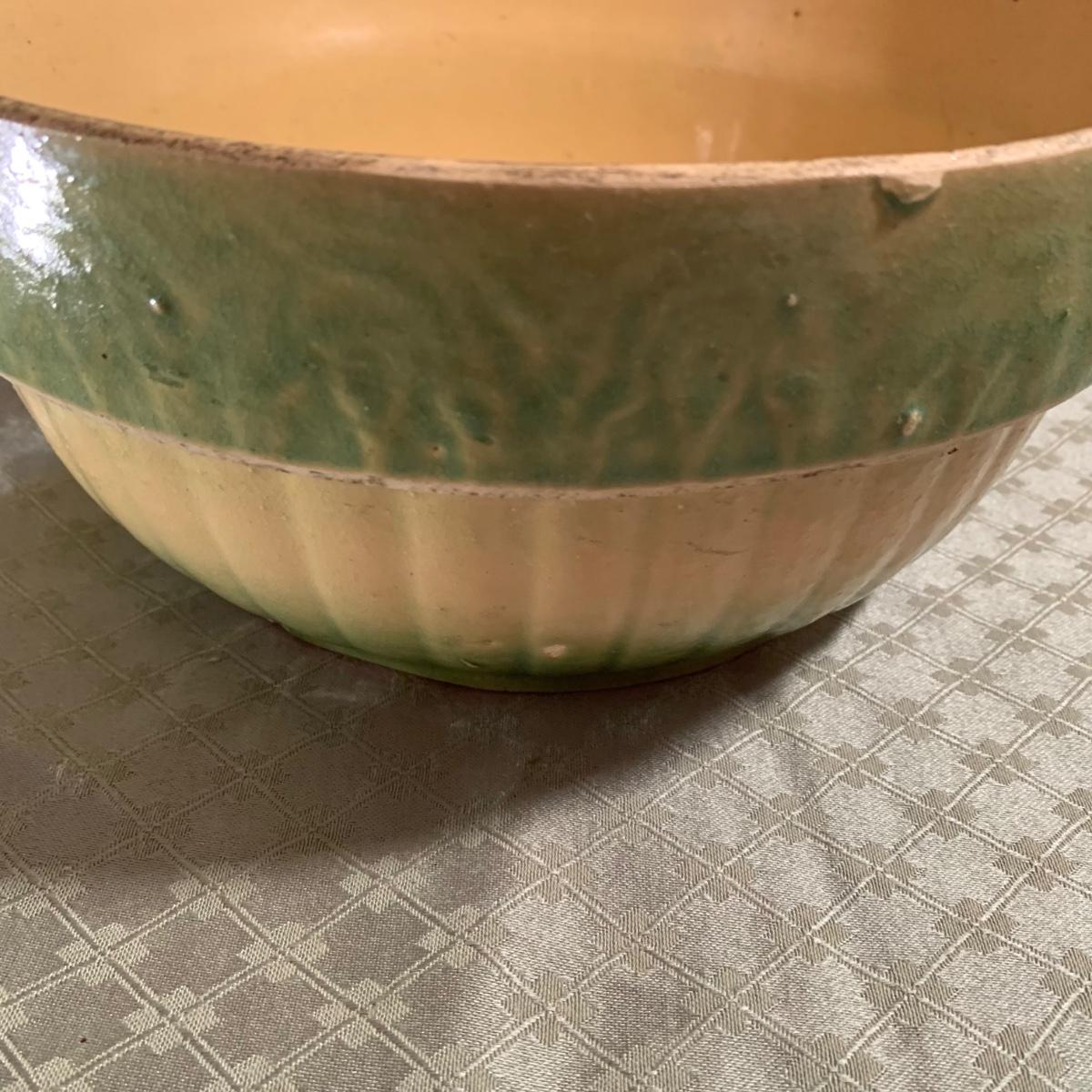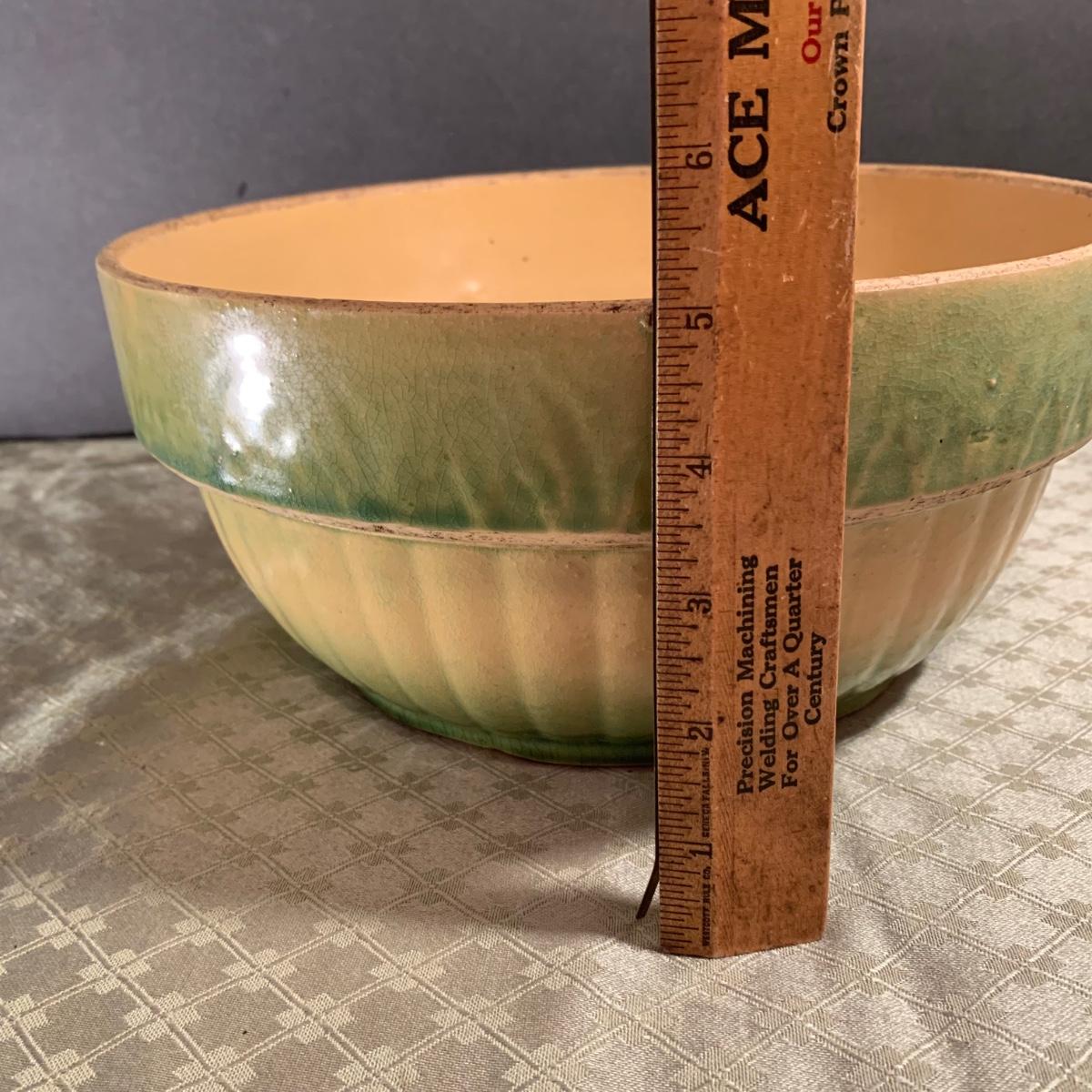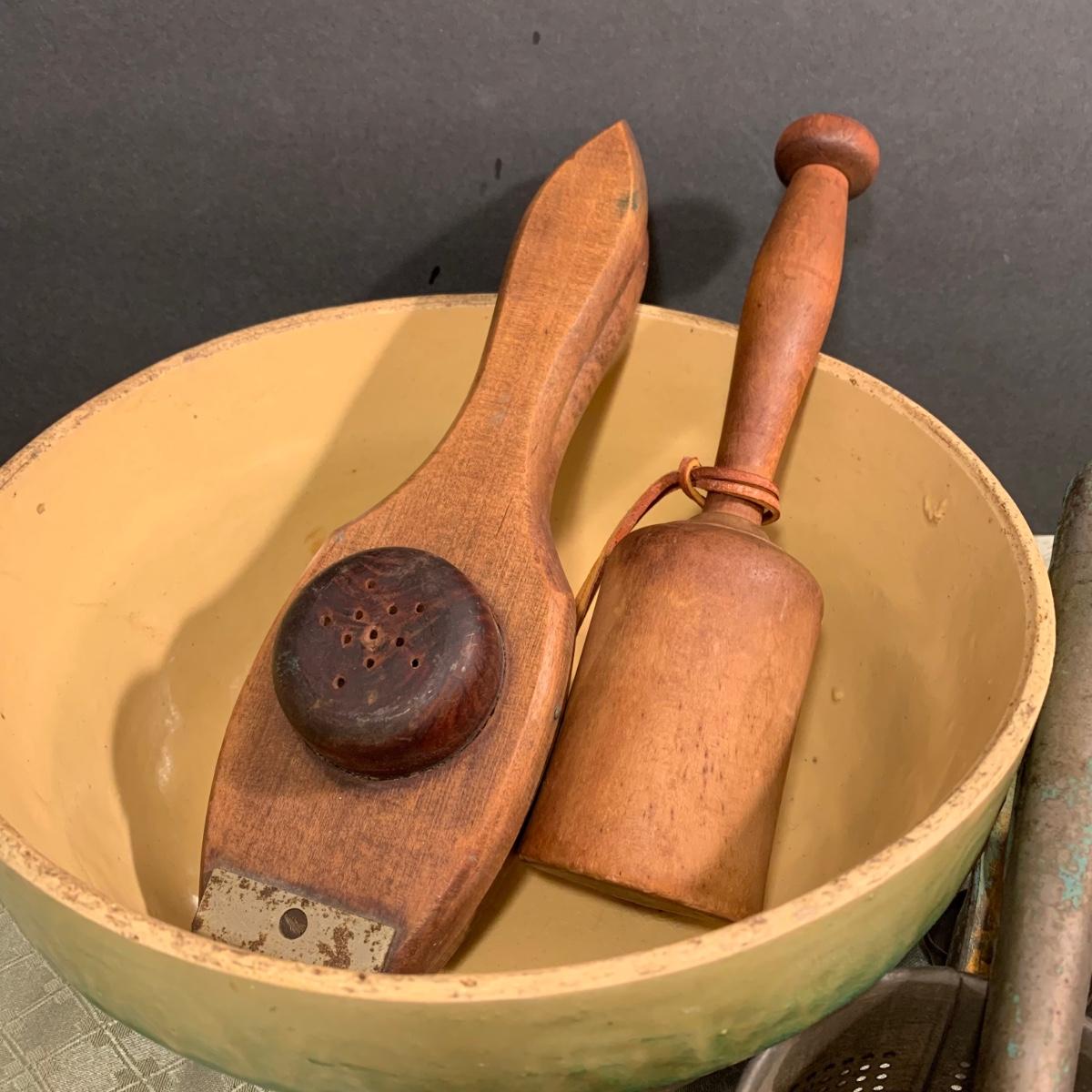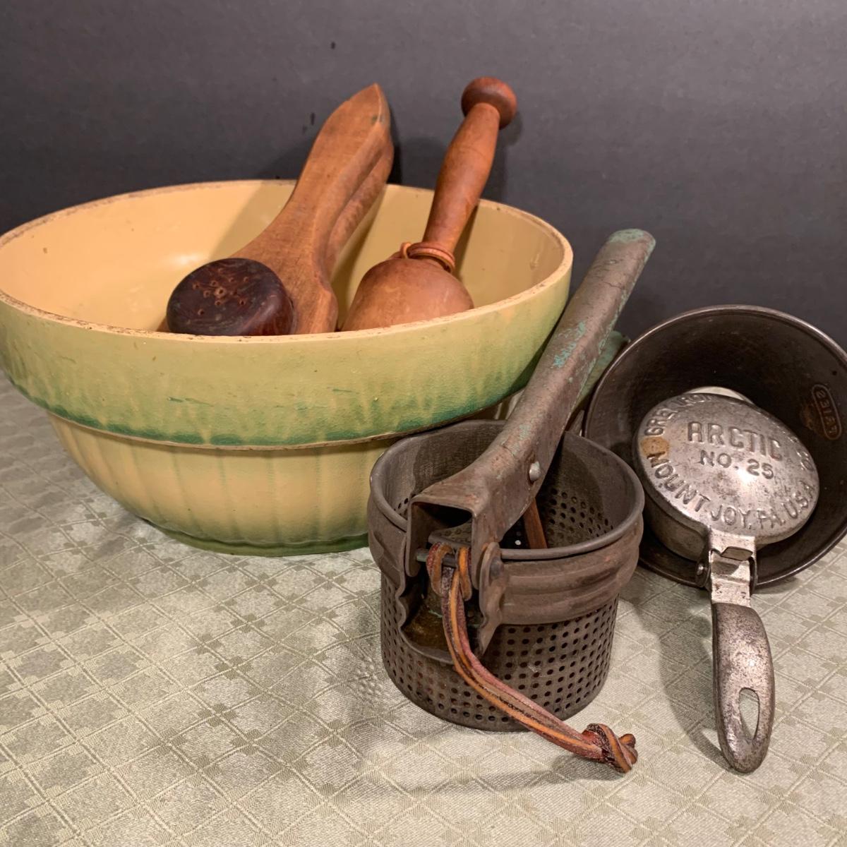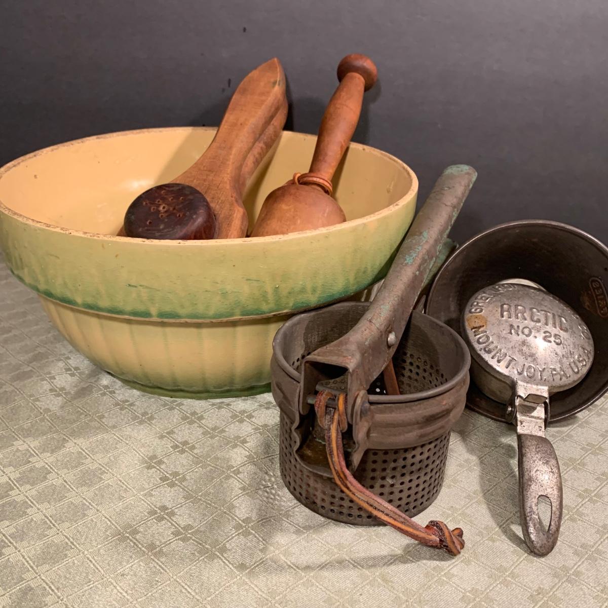 LOT 67R: Vintage Farm House Yellow & Green Stoneware Mixing Bowl & Vintage Kitchen Utensils