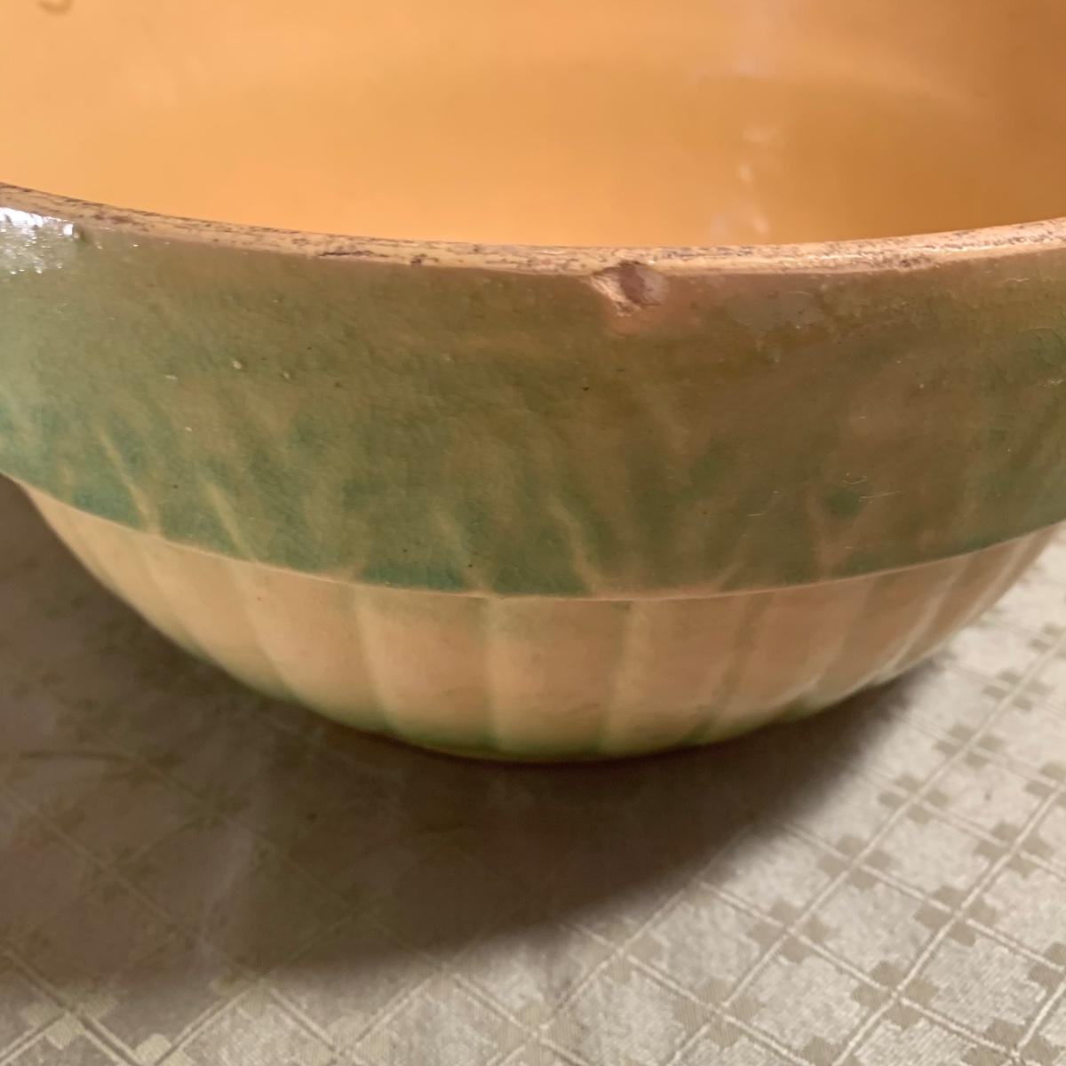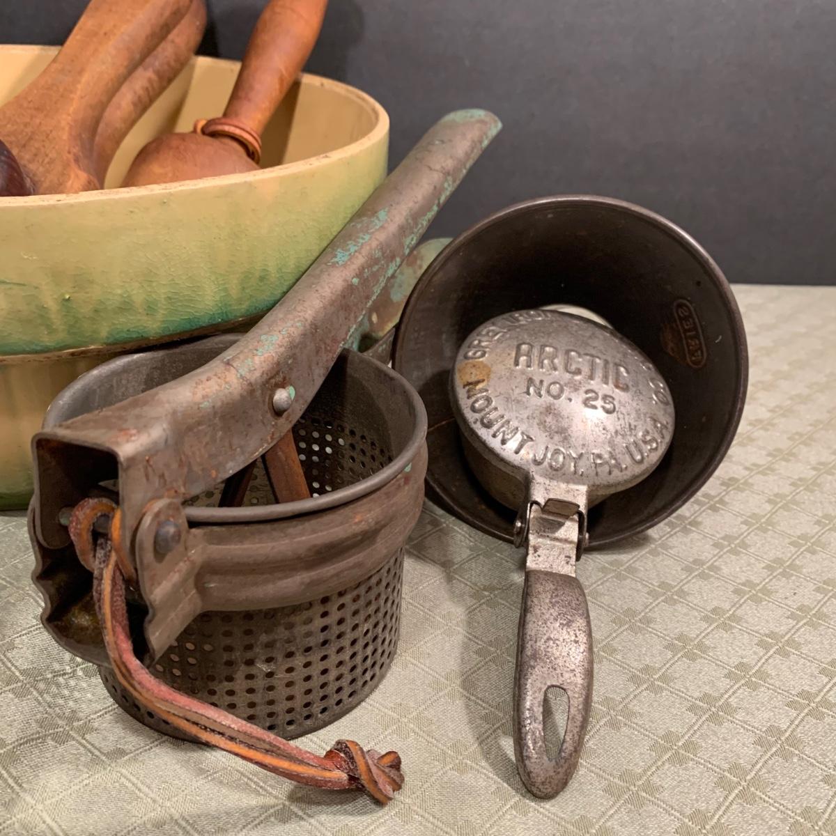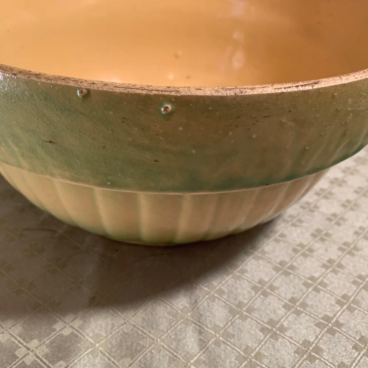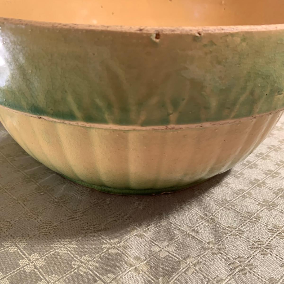 LOT 67R: Vintage Farm House Yellow & Green Stoneware Mixing Bowl & Vintage Kitchen Utensils