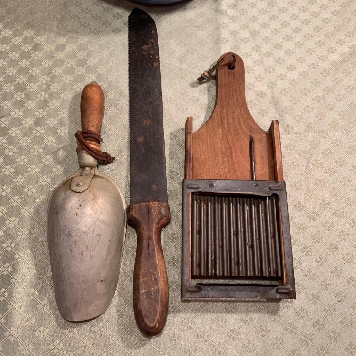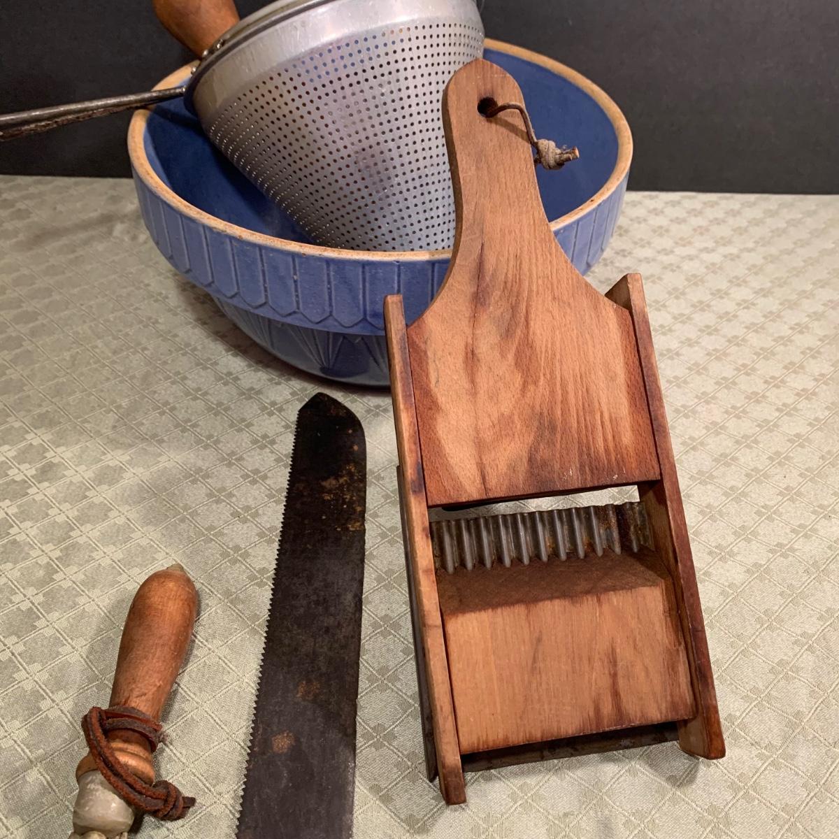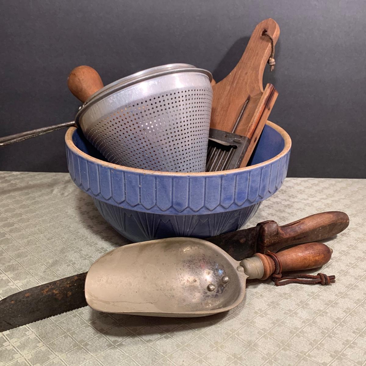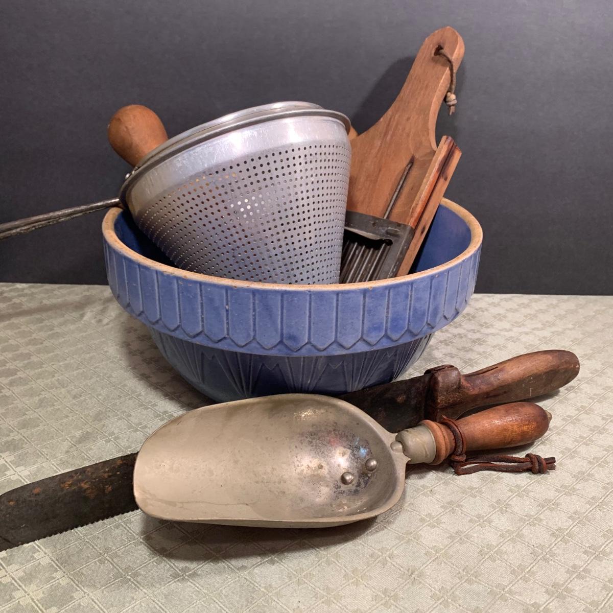 LOT 68R: Vintage Picket Fence Stoneware Mixing Bowl & Vintage Kitchen Utensils