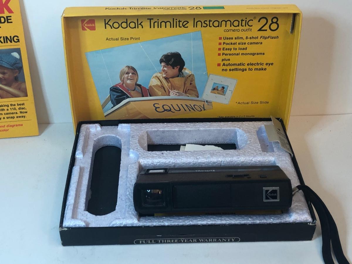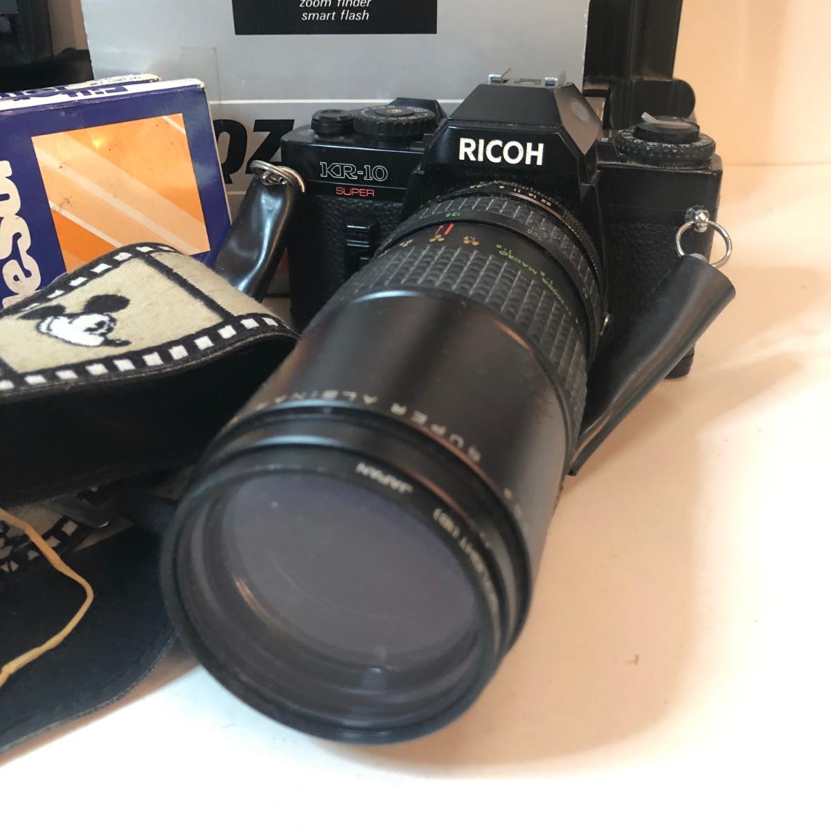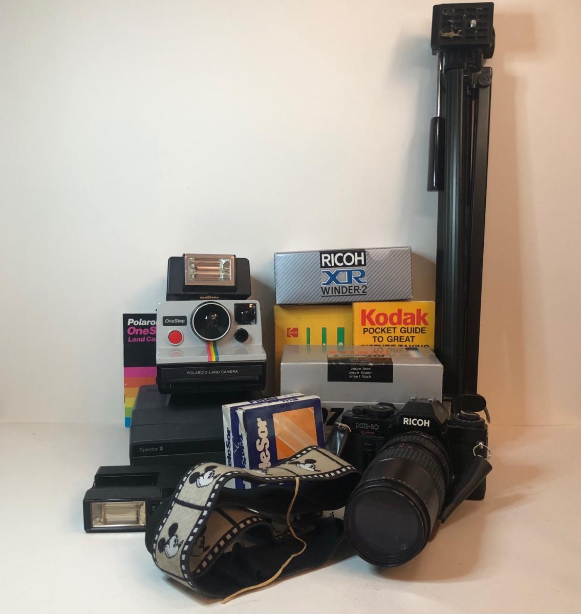 LOT 104M: Ricoh KR-10 Super 35mm Camera w/ Mickey Mouse Filmstrip Strap, Ricoh XR Winder-2, Kodak Trimlite Instamatic 28, Polaroid OneStep w/ Attachable Flash, Vista Auto-34 Flash & More