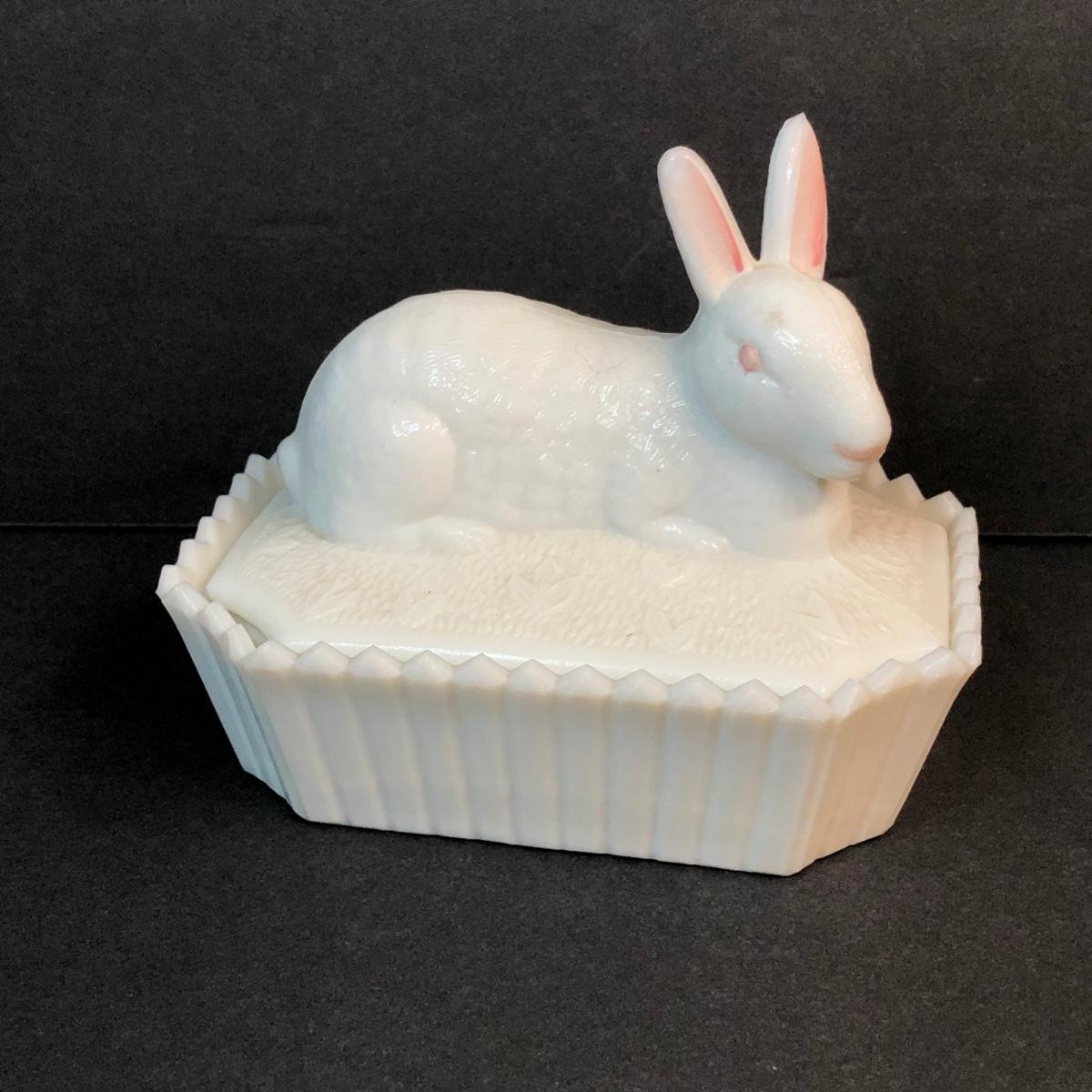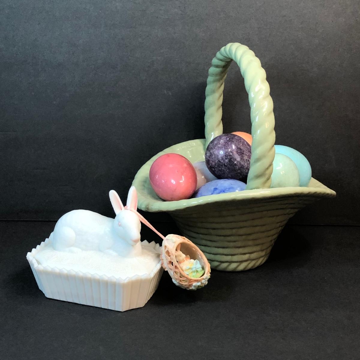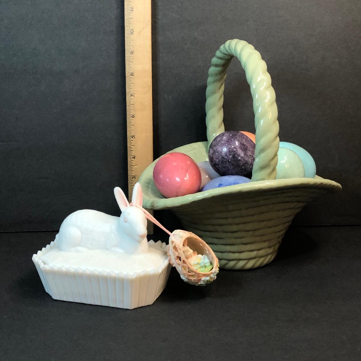 LOT 112M: Milk Glass Rabbit Dish, Pastel Color Marble Eggs, Green Pottery Basket & Small Egg Ornament