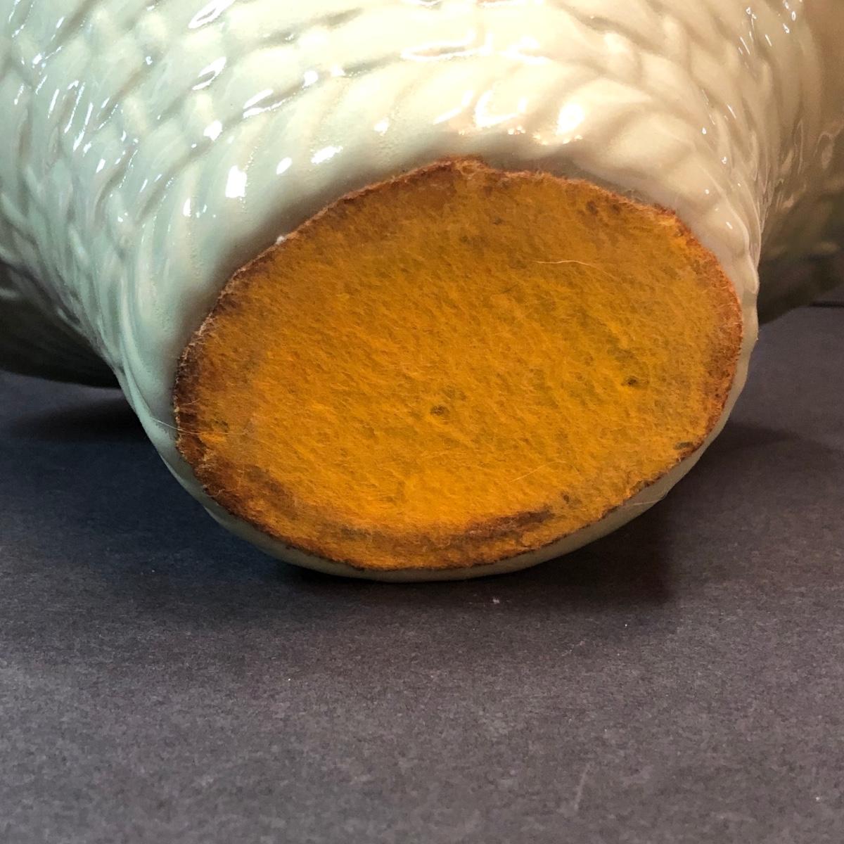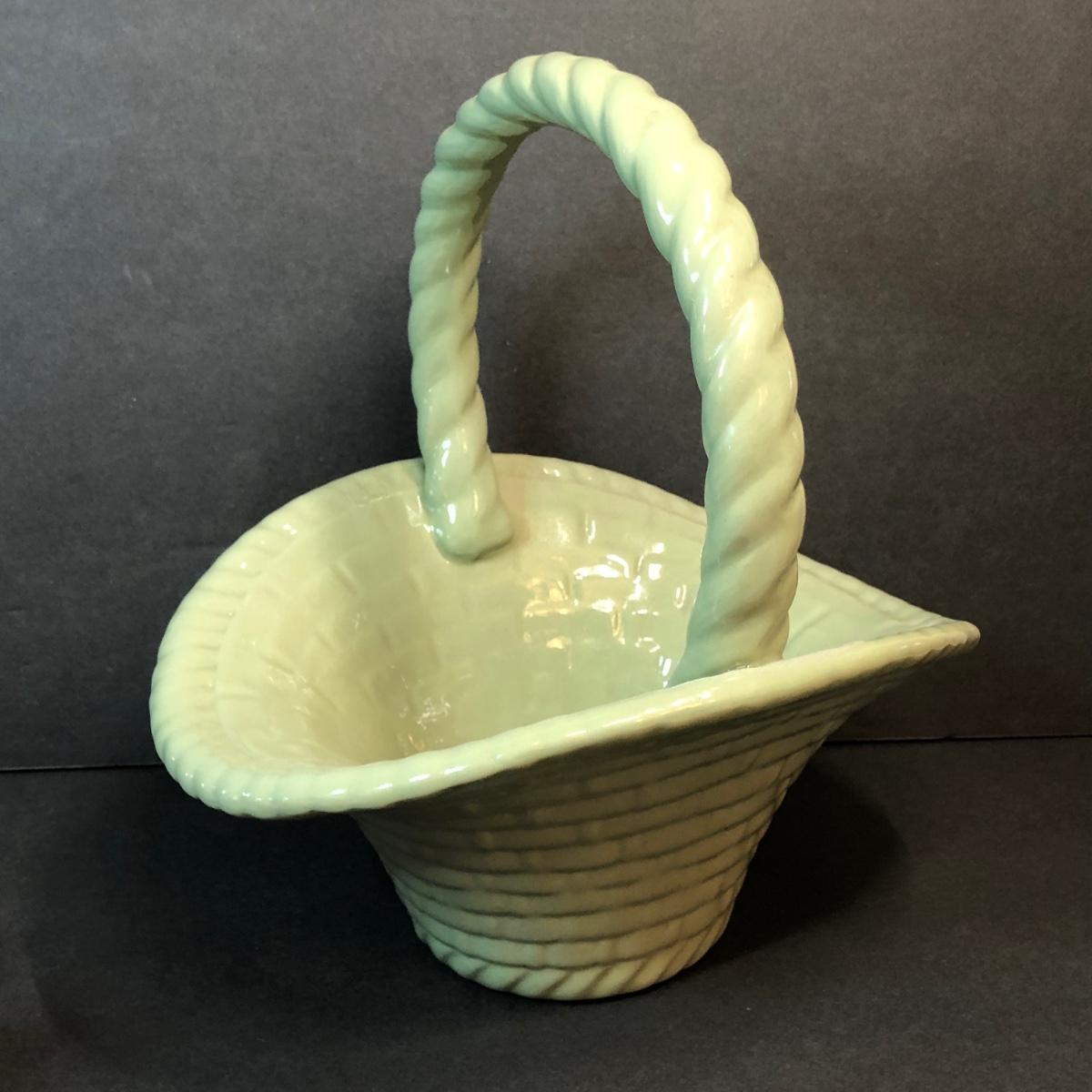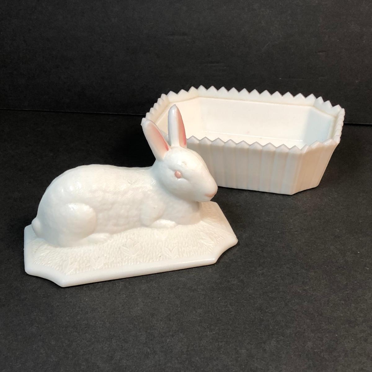 LOT 112M: Milk Glass Rabbit Dish, Pastel Color Marble Eggs, Green Pottery Basket & Small Egg Ornament
