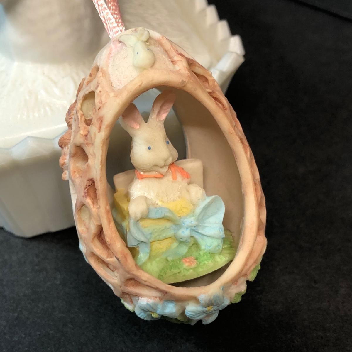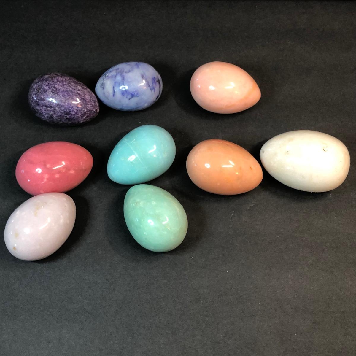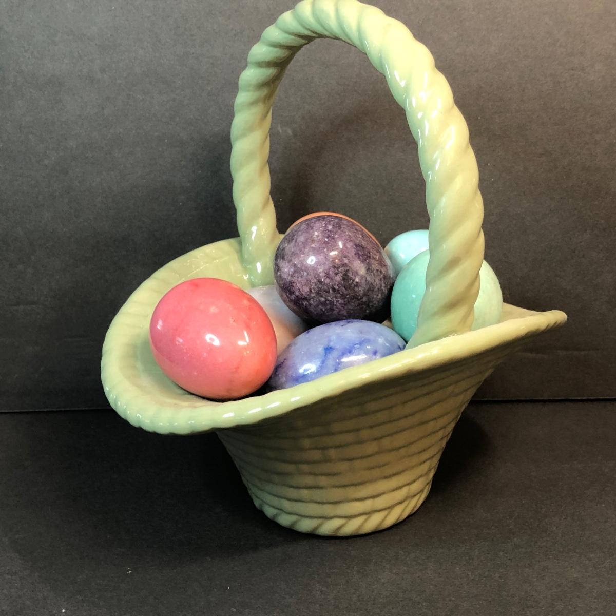 Includes 9 marble eggs, a milk glass dish, the green basket & small ornament in an egg shape with a rabbit in the center.