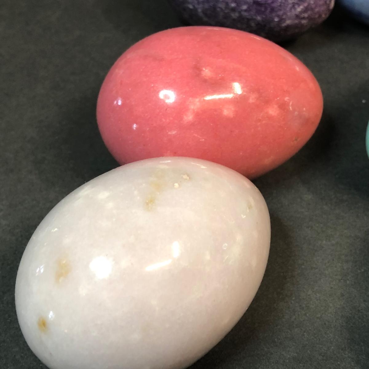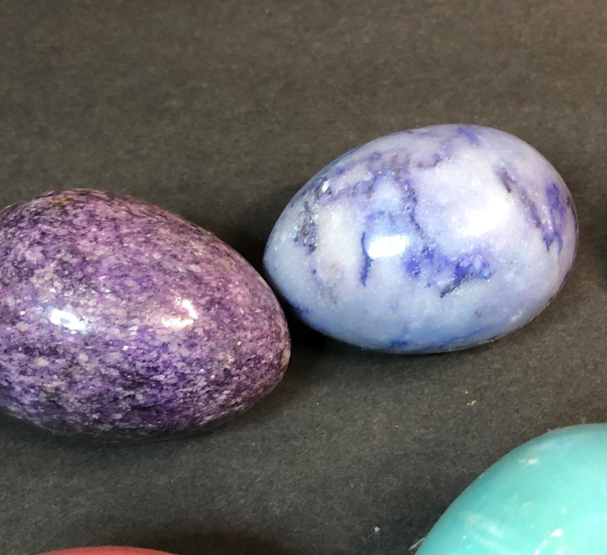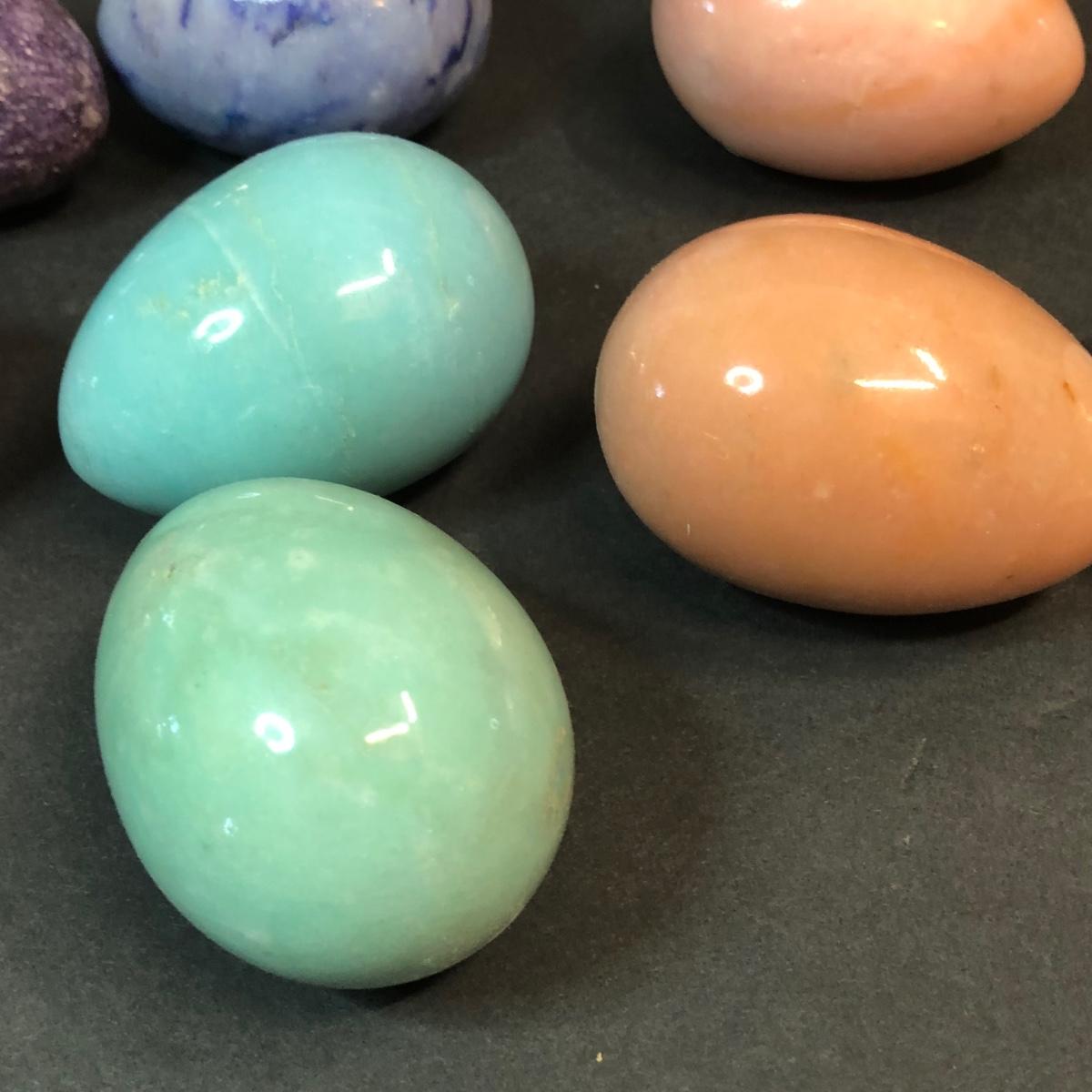 Includes 9 marble eggs, a milk glass dish, the green basket & small ornament in an egg shape with a rabbit in the center.
