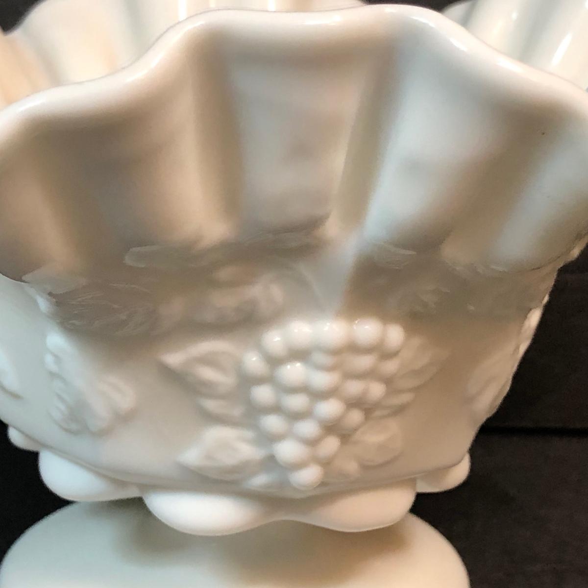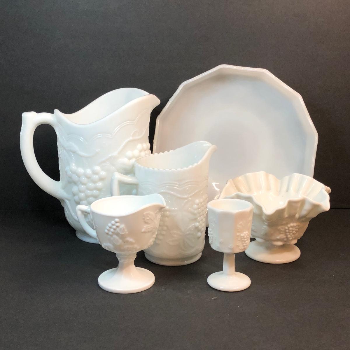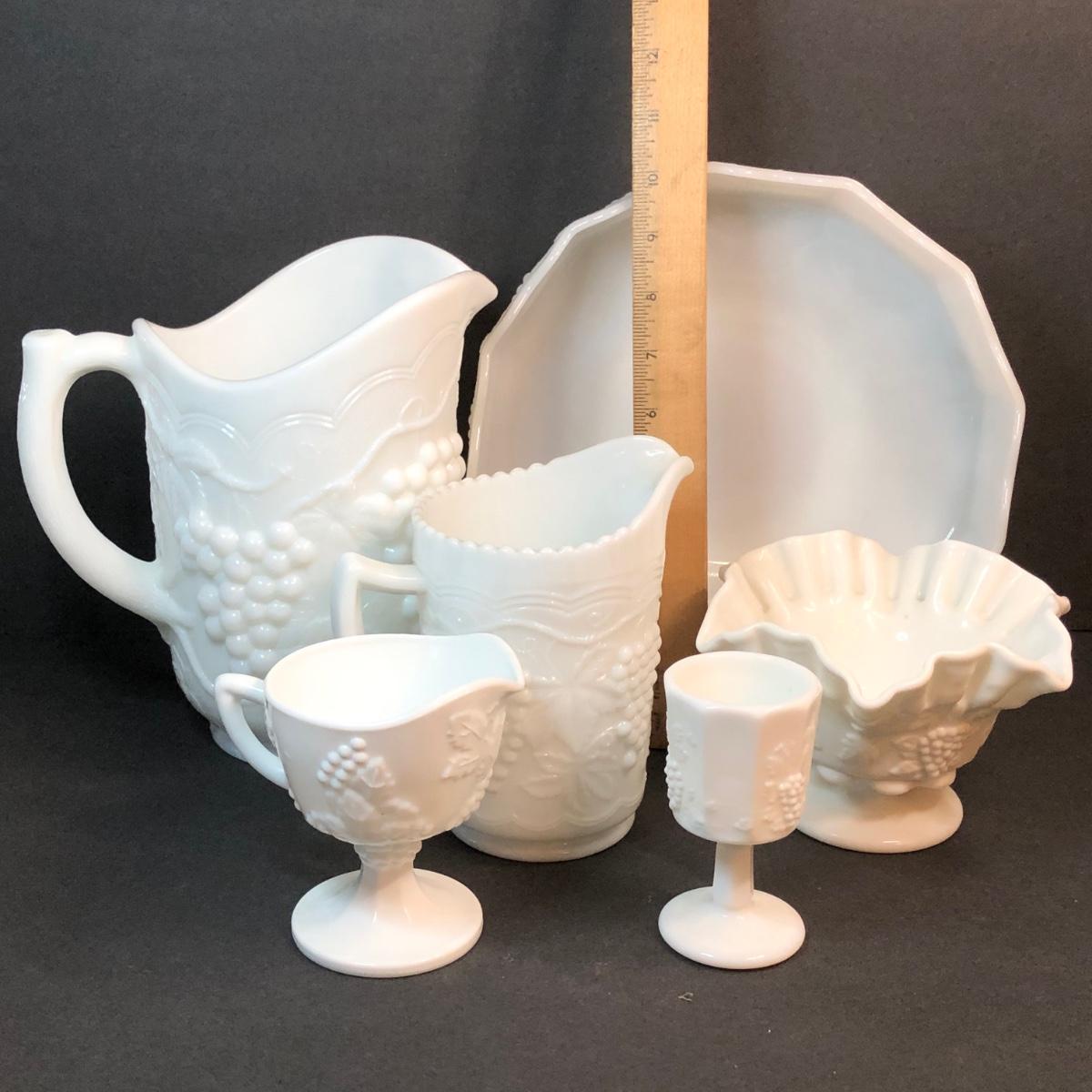 Includes 2 pitchers, a dish with a flared edge, a shallow bowl, and two stemmed cups.