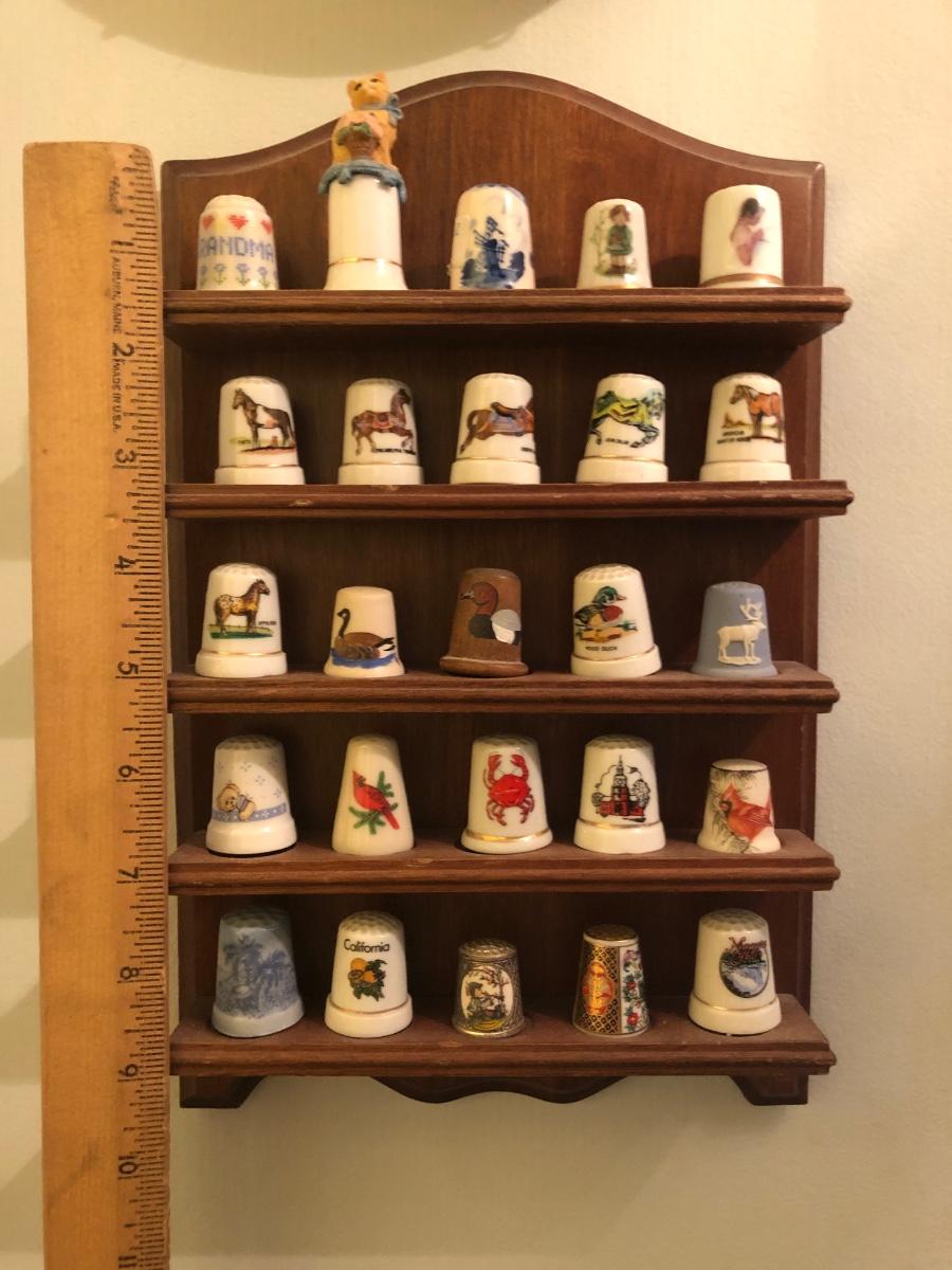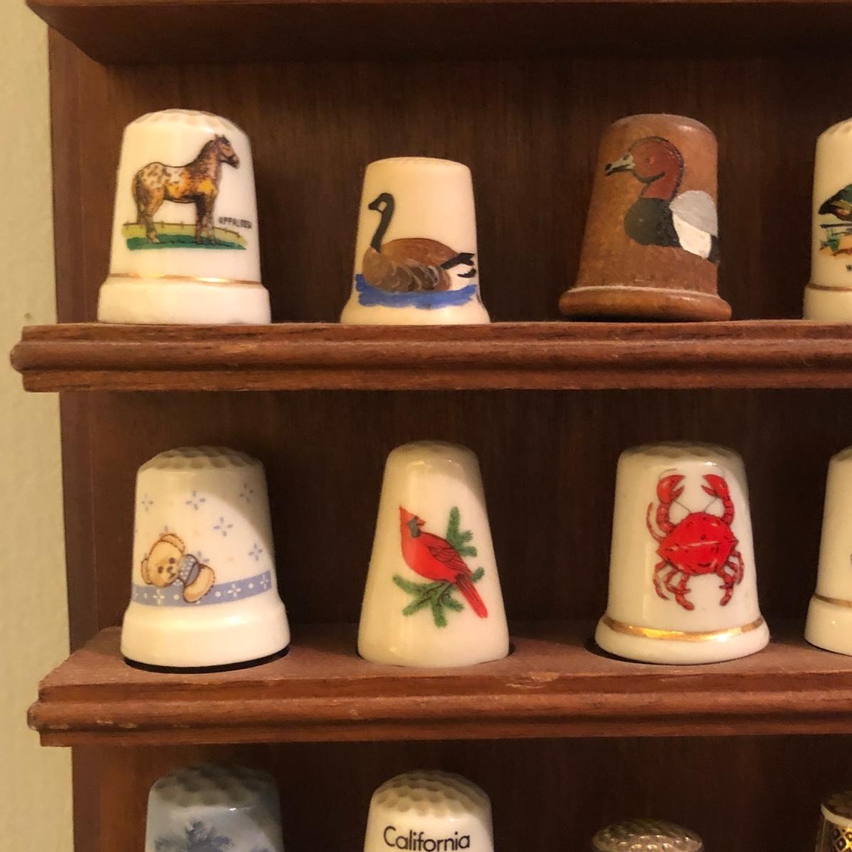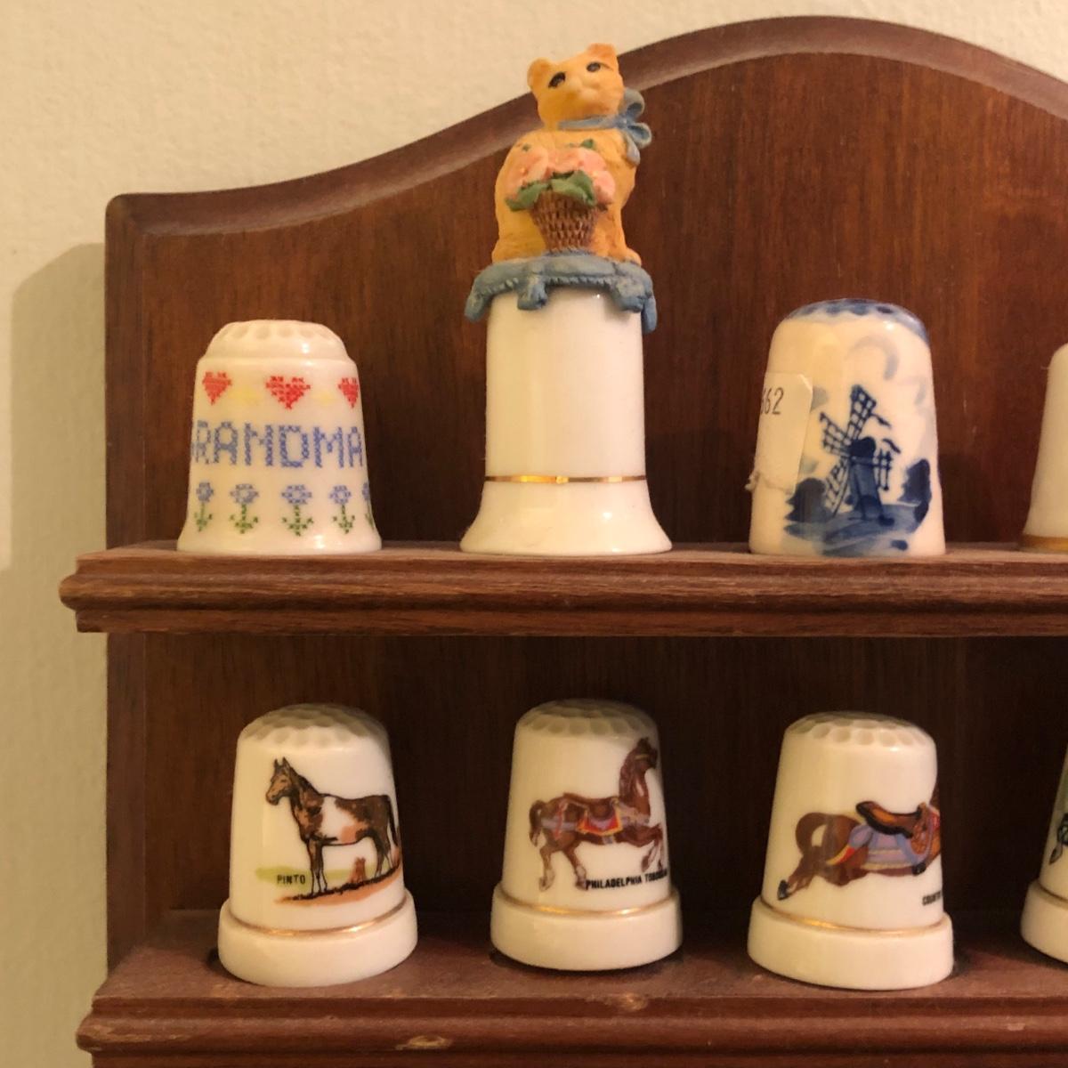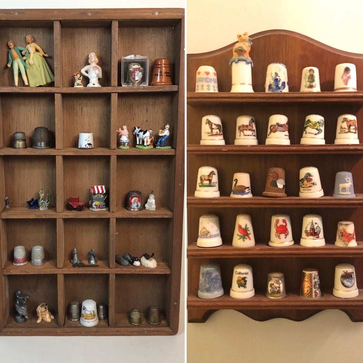 This collection includes a large number of thimbles and small miniatures. This collection contains a Lenox thimble, a Hummel thimble, painted wooden thimbles, and so much more.