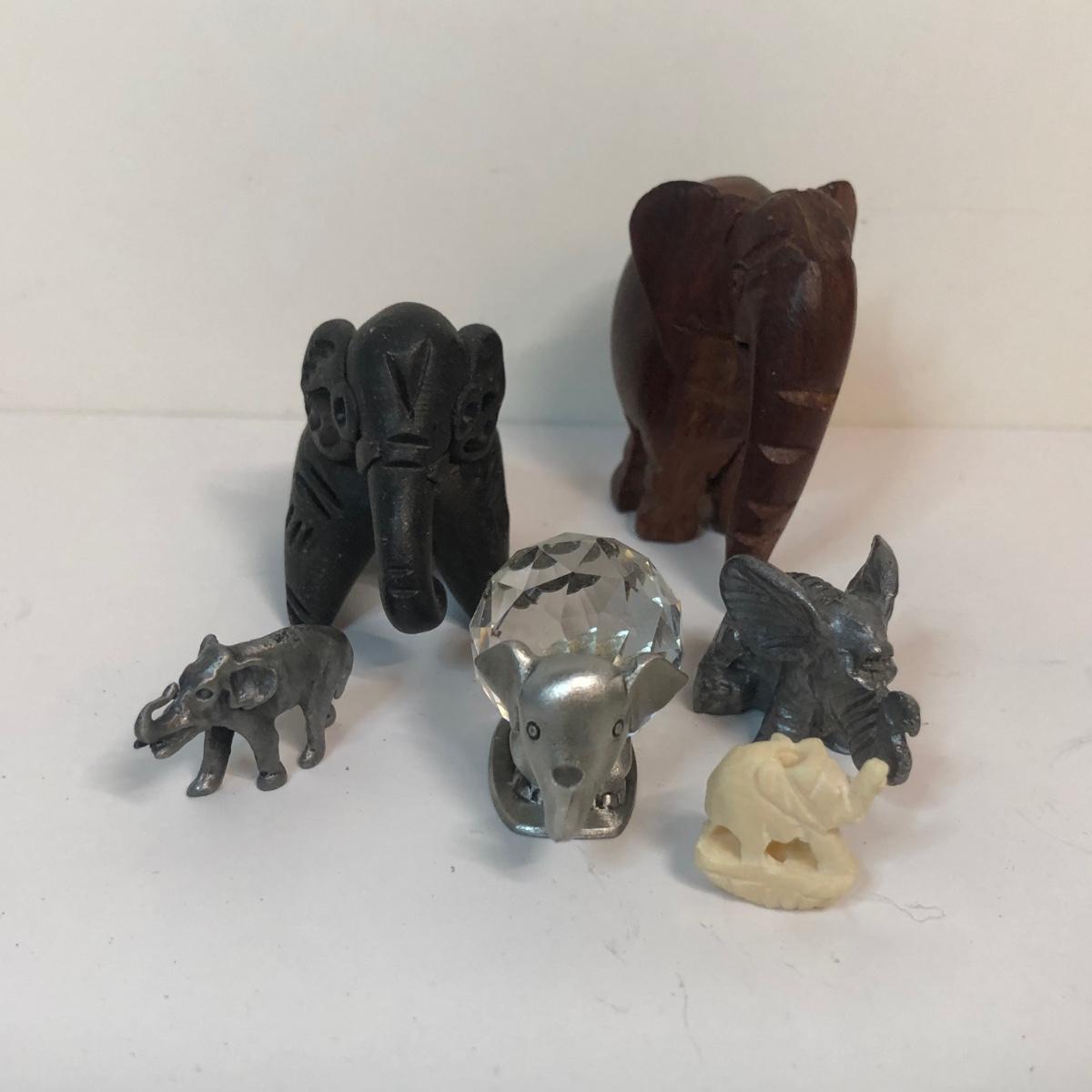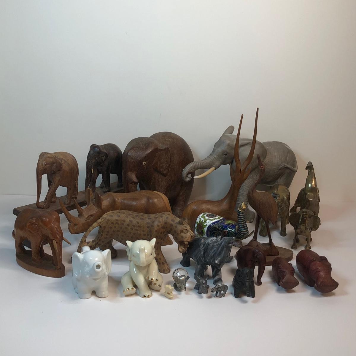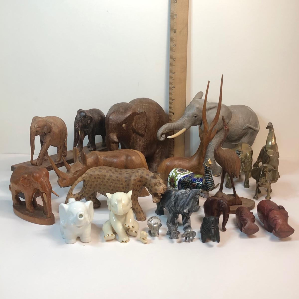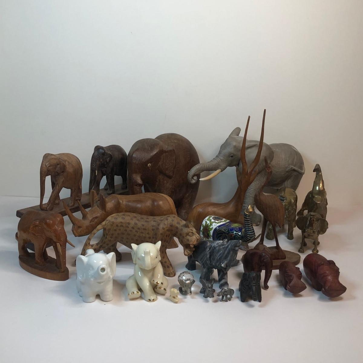 Includes a variety of wooden animal figures, brass elephants, two Lenox elephants, and a marble elephant.