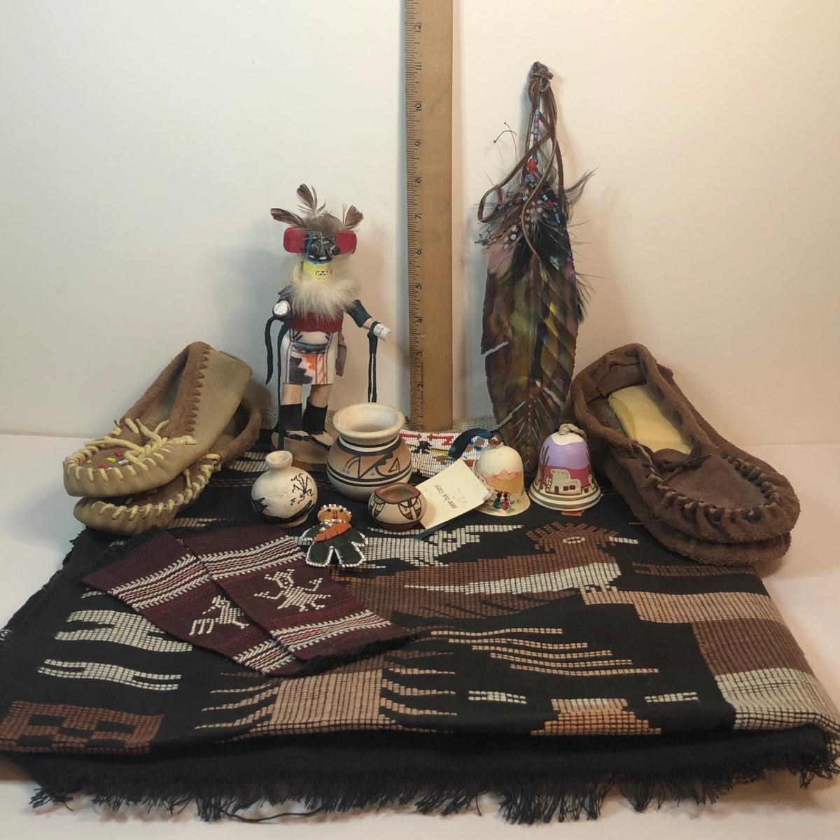 LOT 129M: Southwest:  Blanket, Moccasins, Miniature Pottery, Spirit Feather, Painted Bells & More