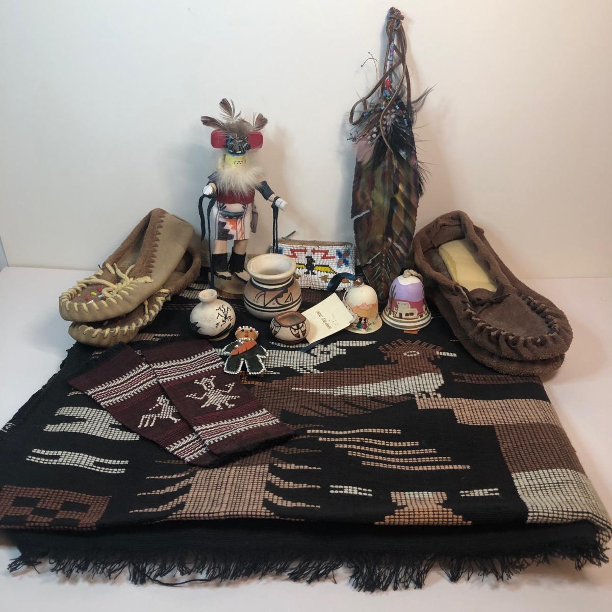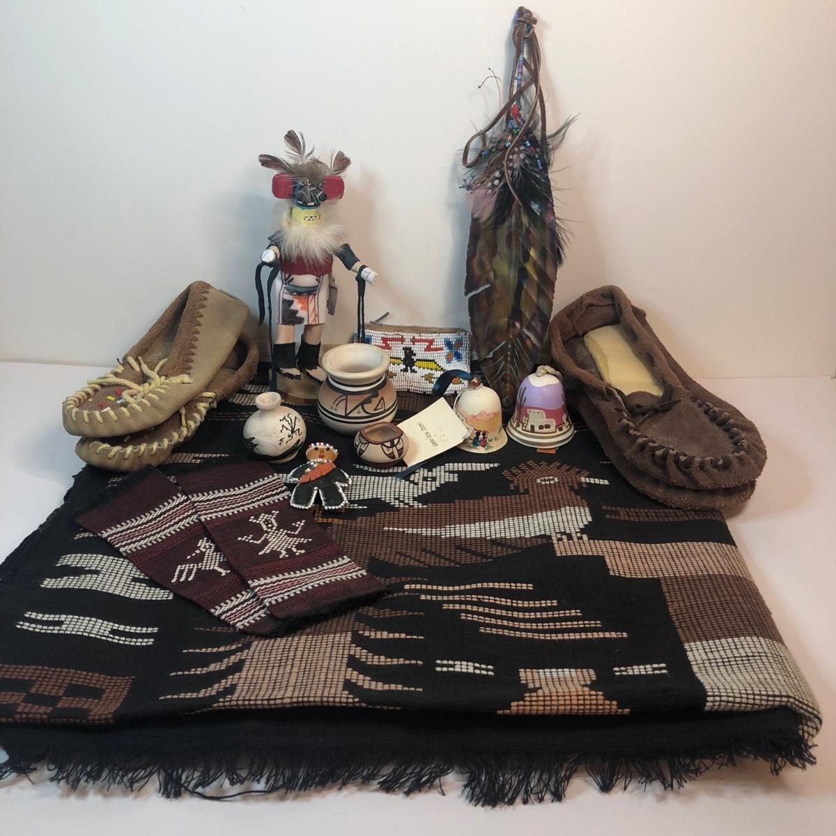 LOT 129M: Southwest: Blanket, Moccasins, Miniature Pottery, Spirit Feather, Painted Bells & More