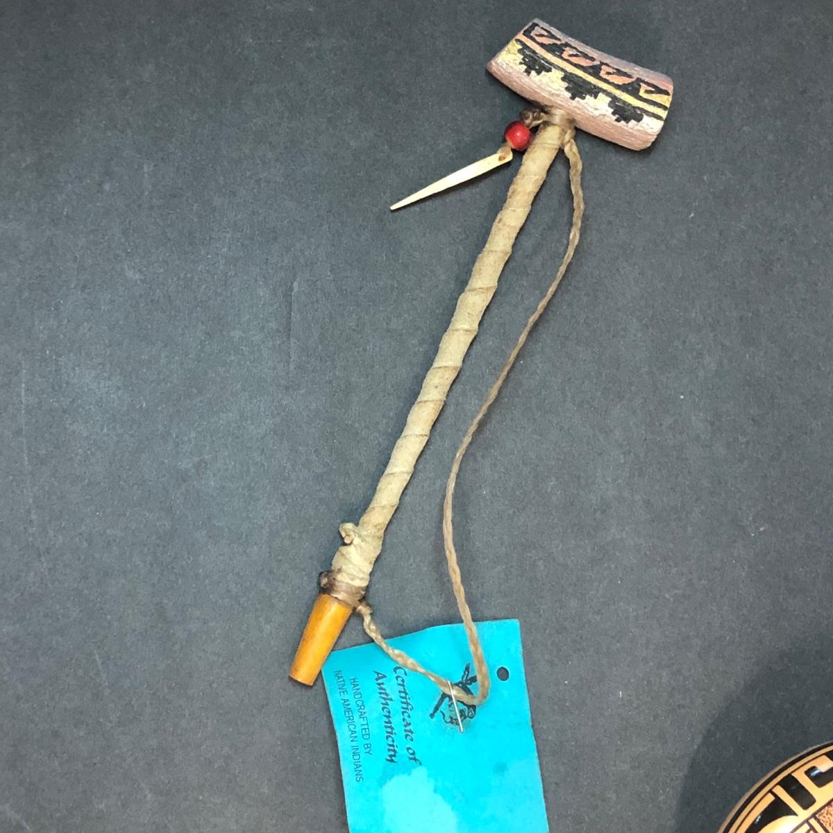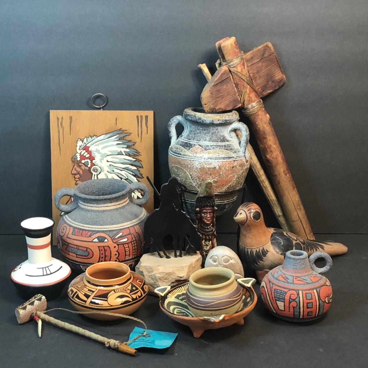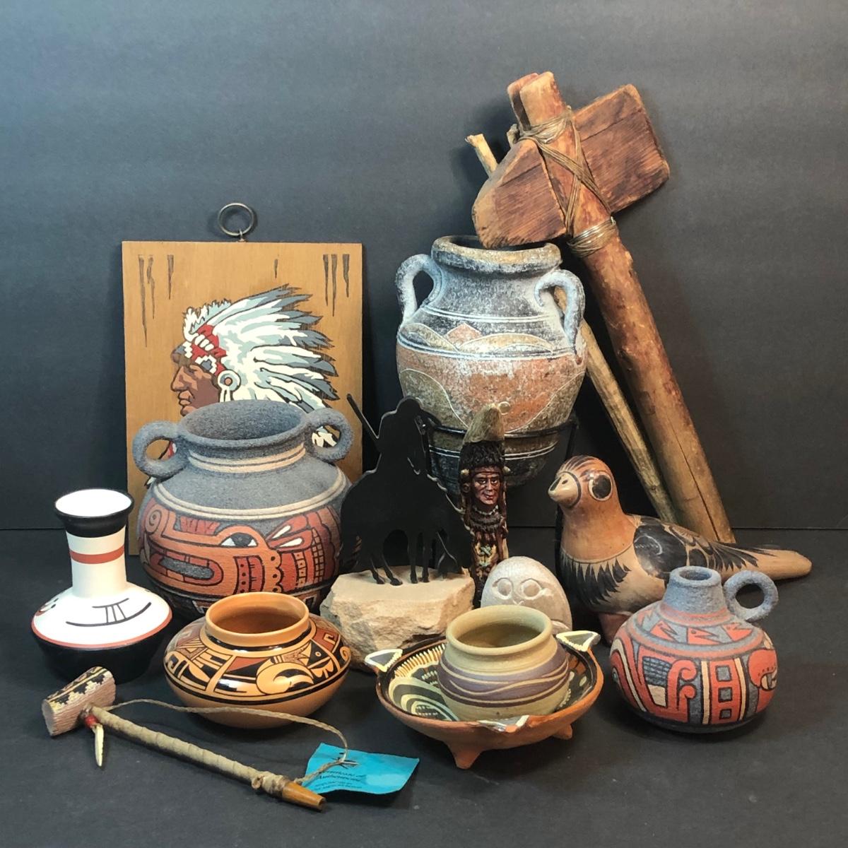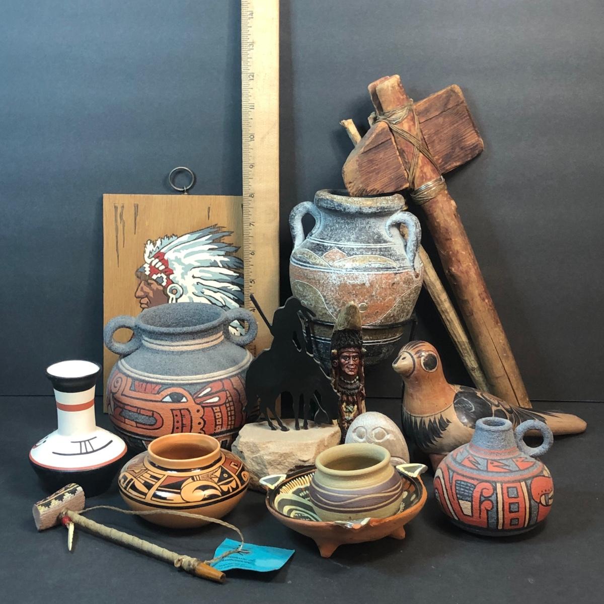 LOT 132M: Native American Plywood Painting, Pottery Pieces, Wooden Hatchet & Navajo Piece