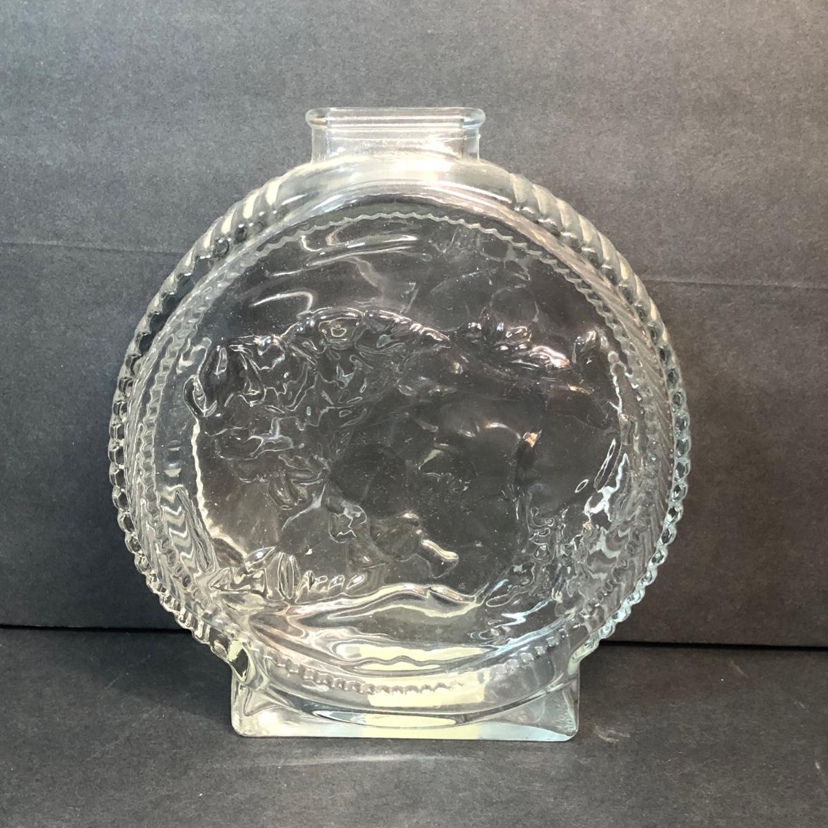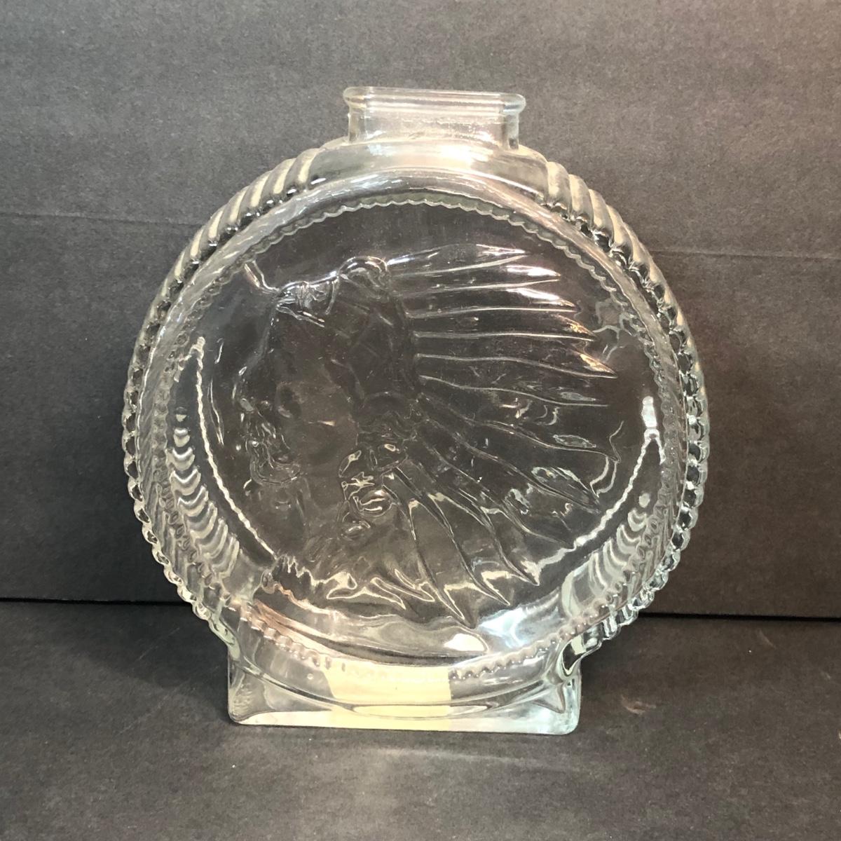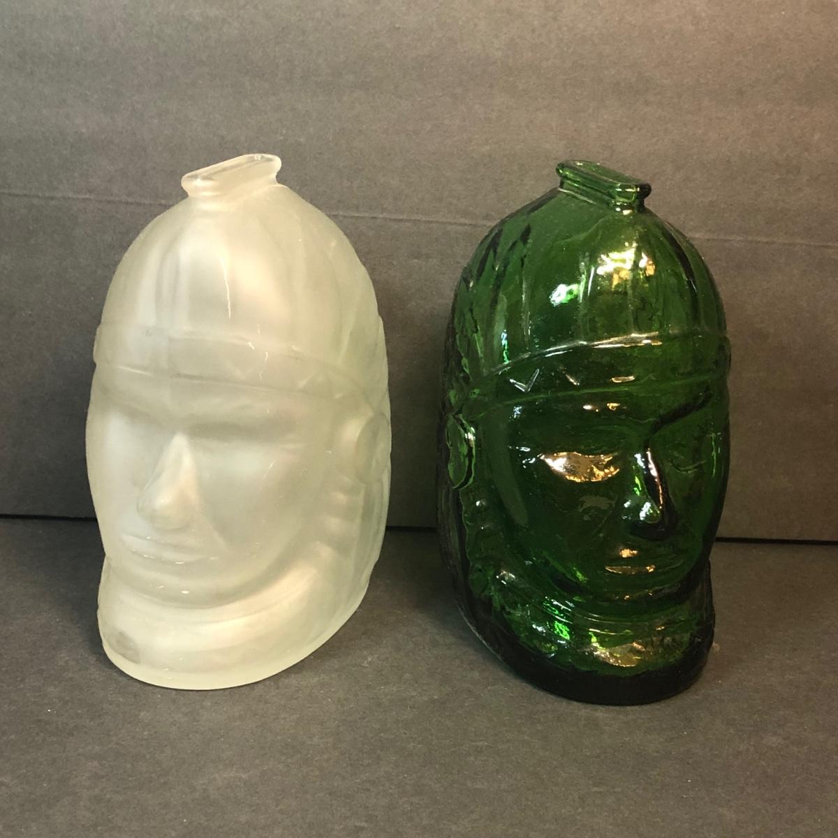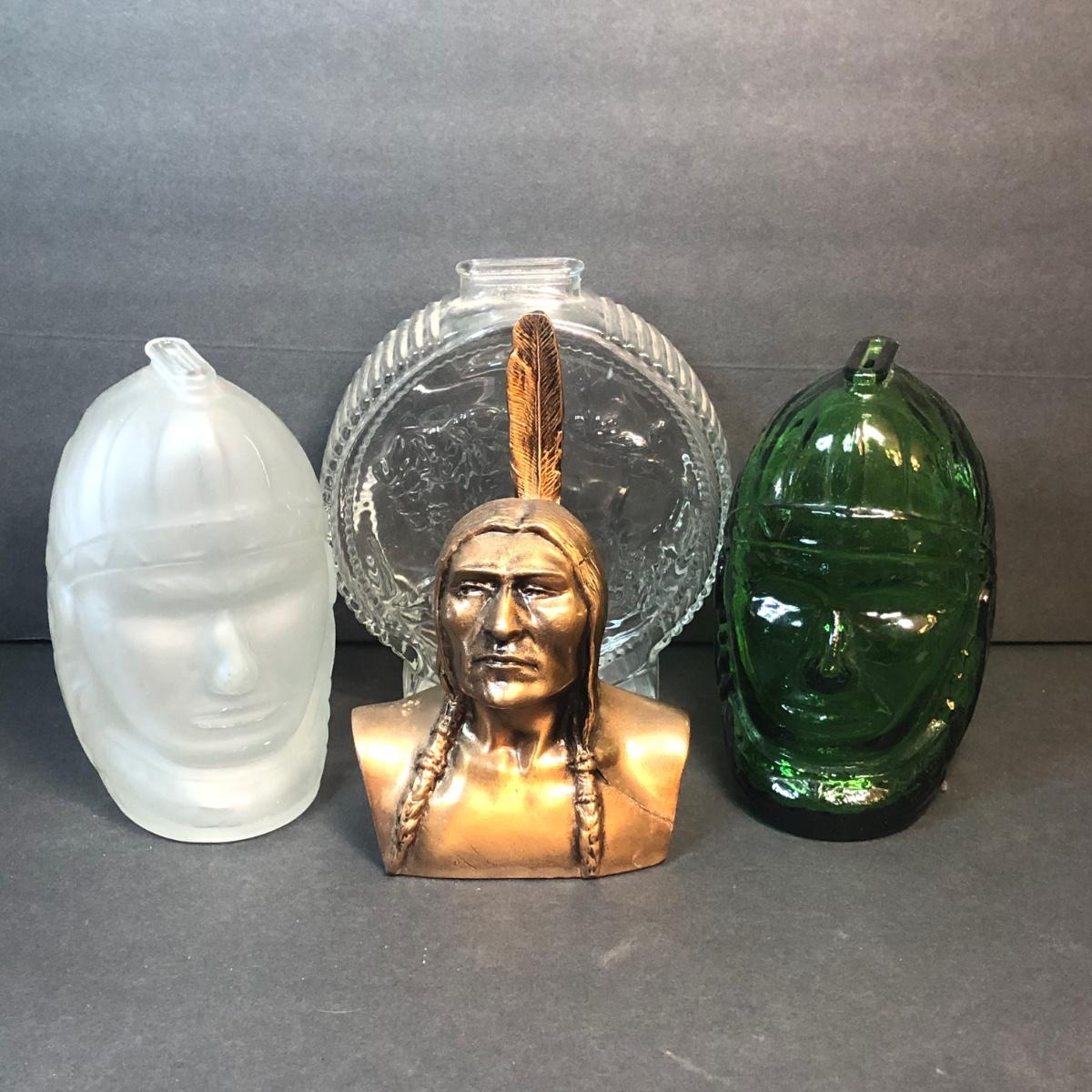 Two glass coin banks made from the same mold, another coin bank with a buffalo on one side and Native American head on the other, and a brass sculpture.