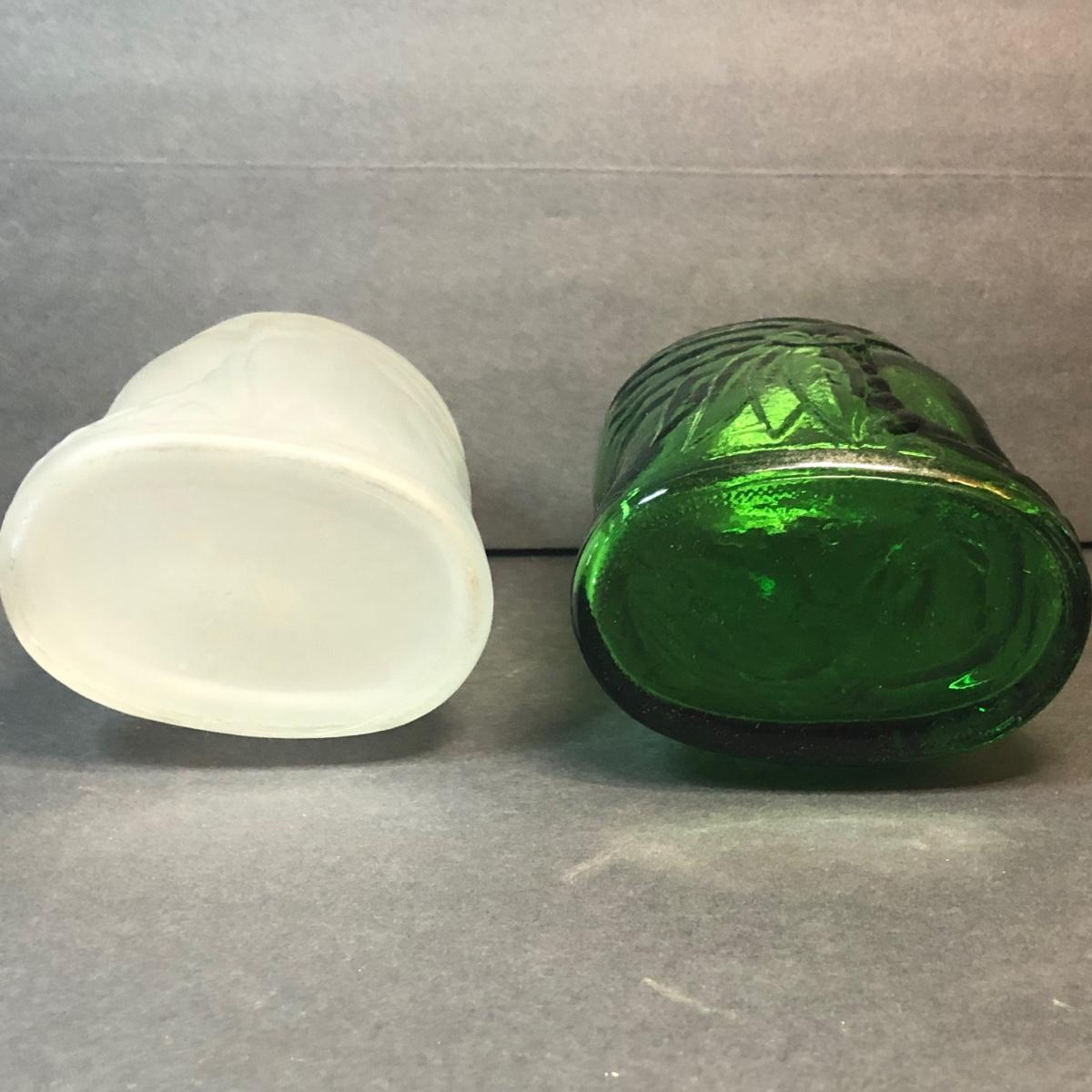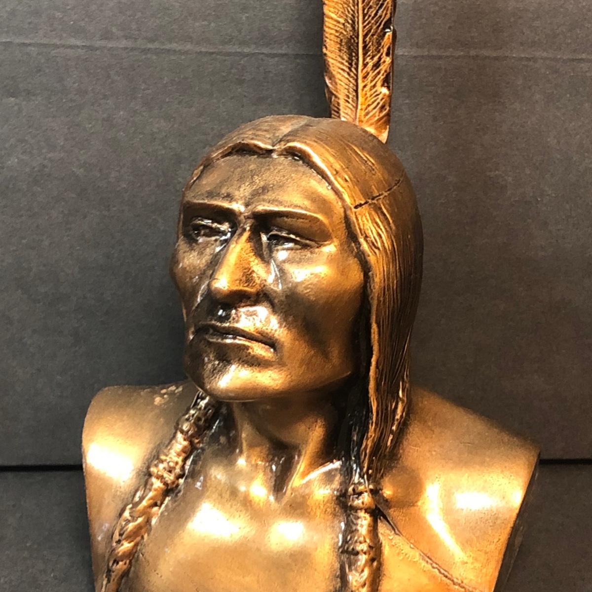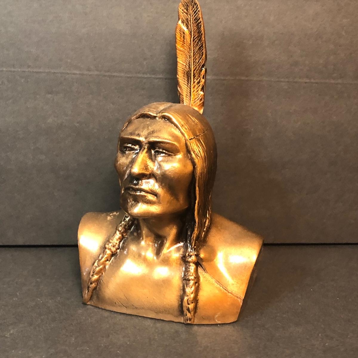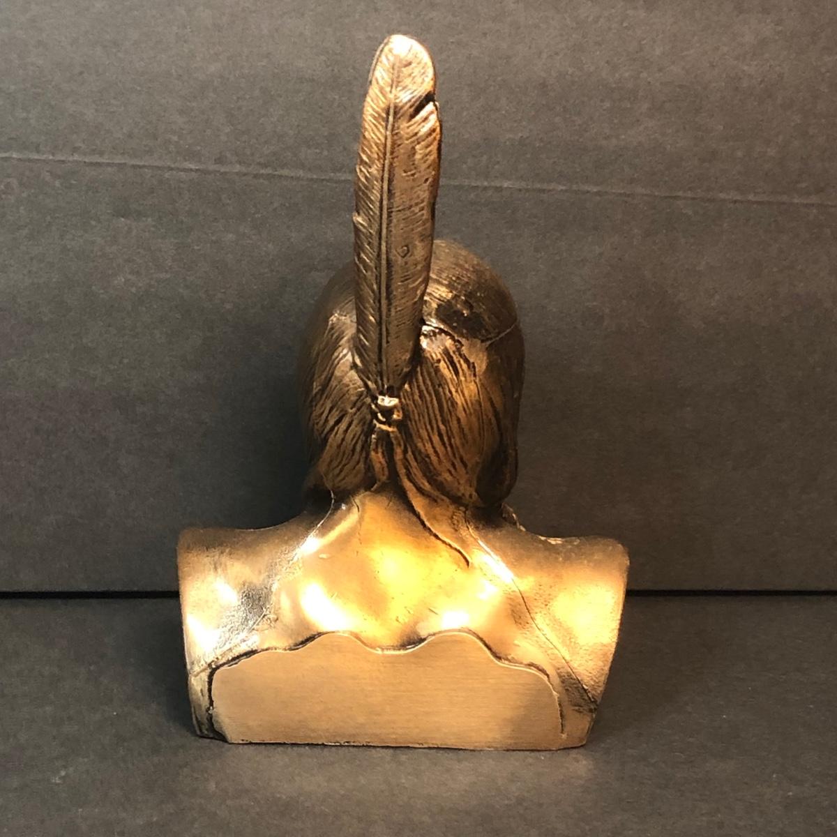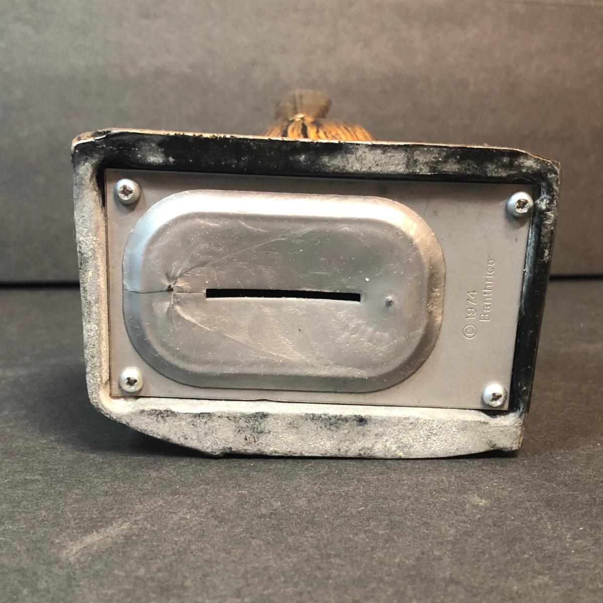 Two glass coin banks made from the same mold, another coin bank with a buffalo on one side and Native American head on the other, and a brass sculpture.