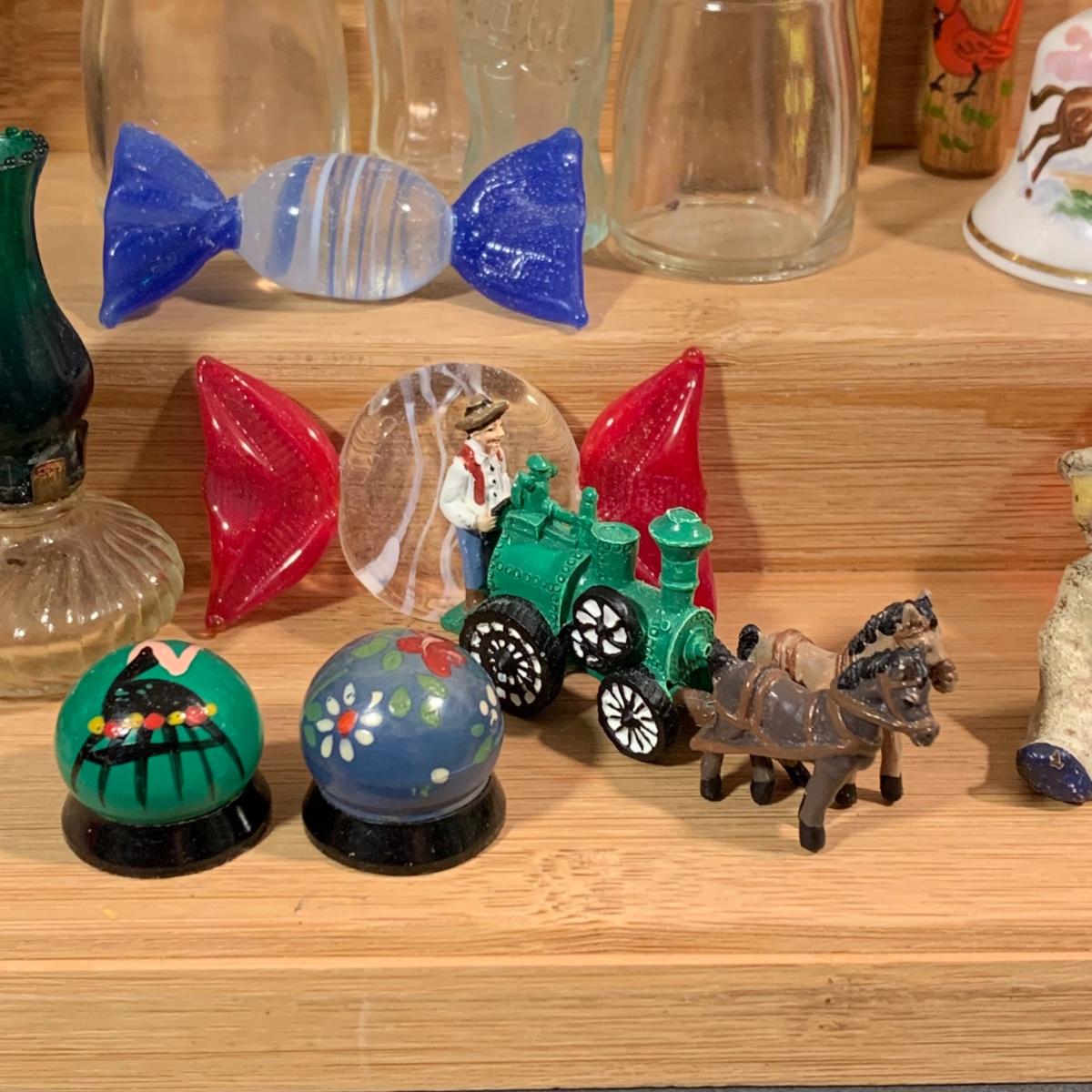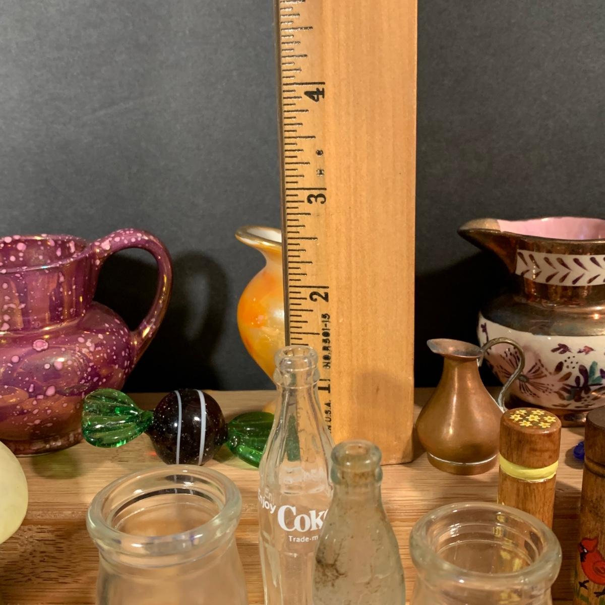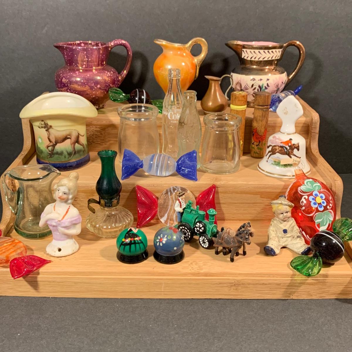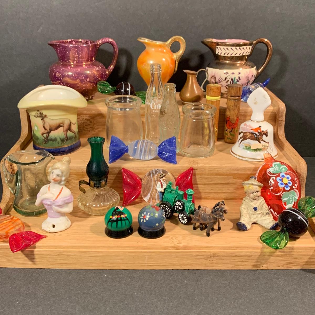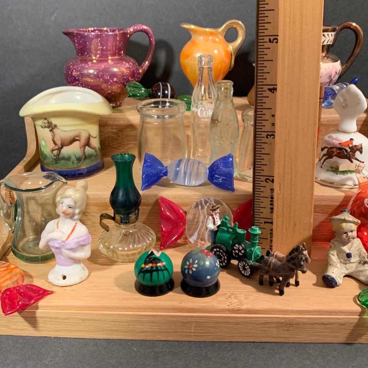 LOT 136: Unique Collection of Miniatures: Vintage Concreta Molinard Perfume Pots, Glass Candy, Coke Bottle, Creamers & More