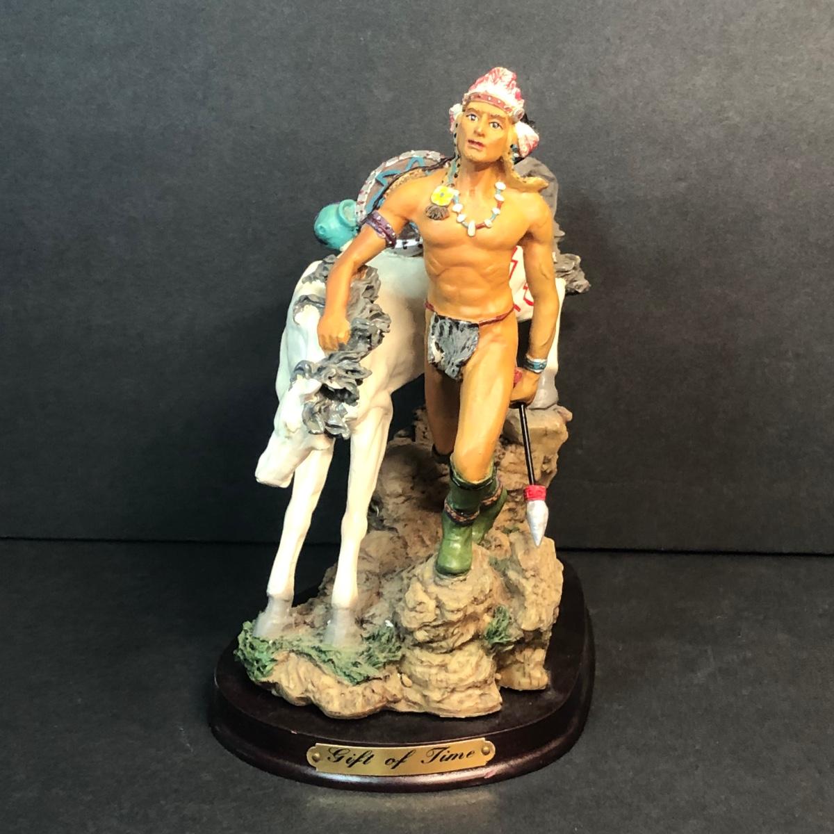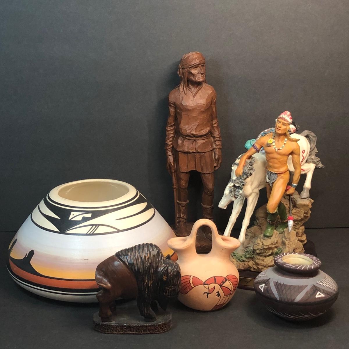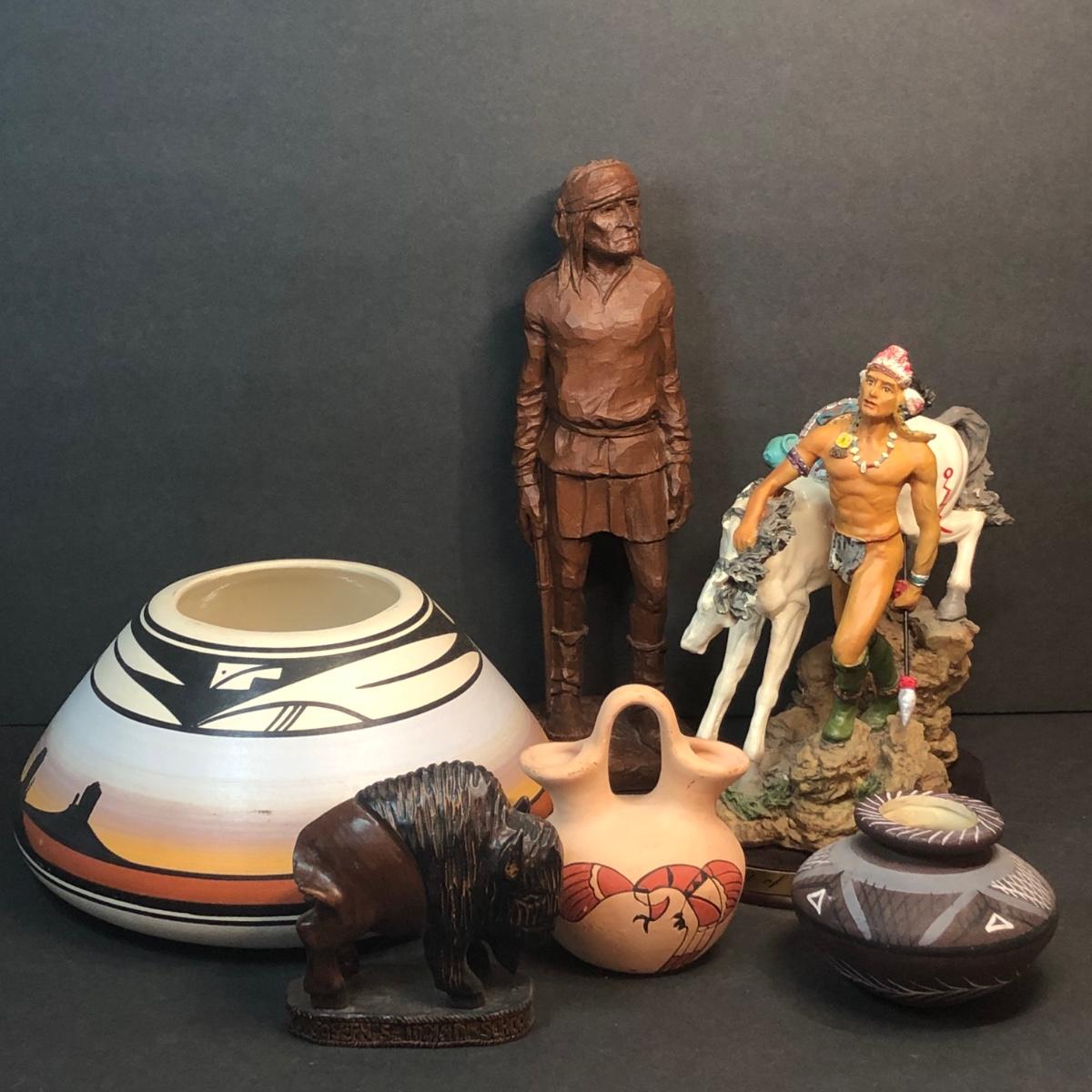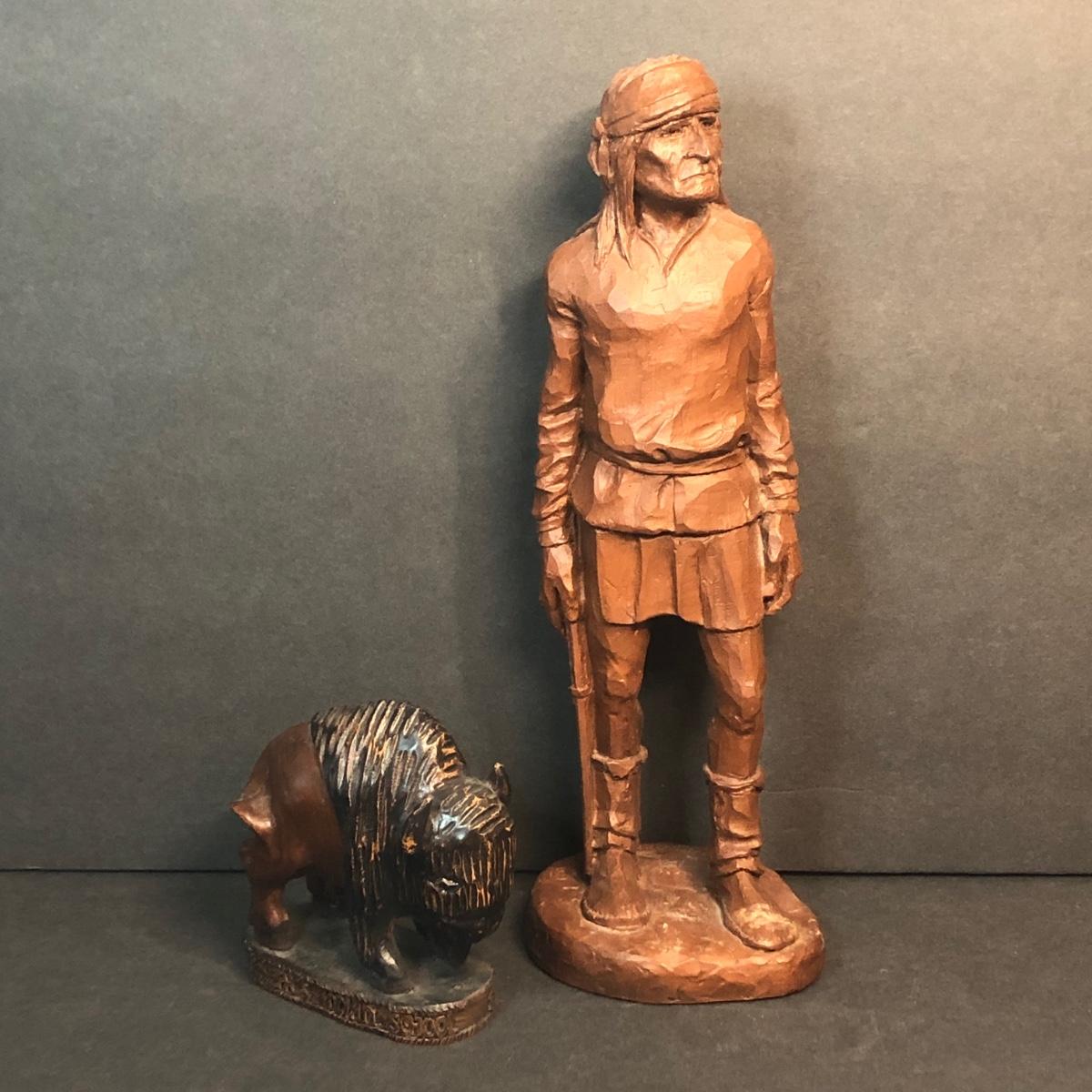 LOT 167M: Pottery Pieces, Wooden Carved Sculpture, "Gift of Time" Figure, Carved Buffalo
