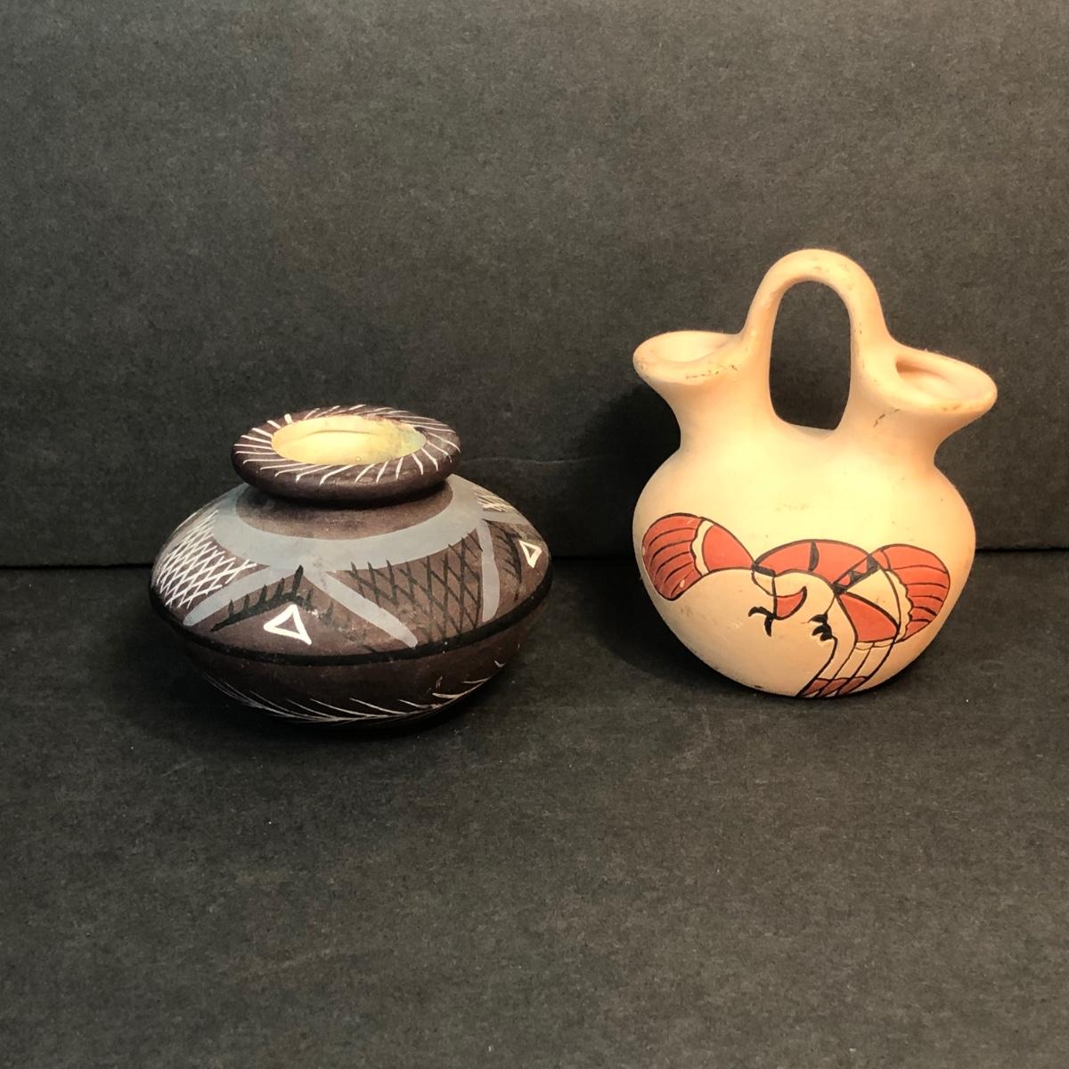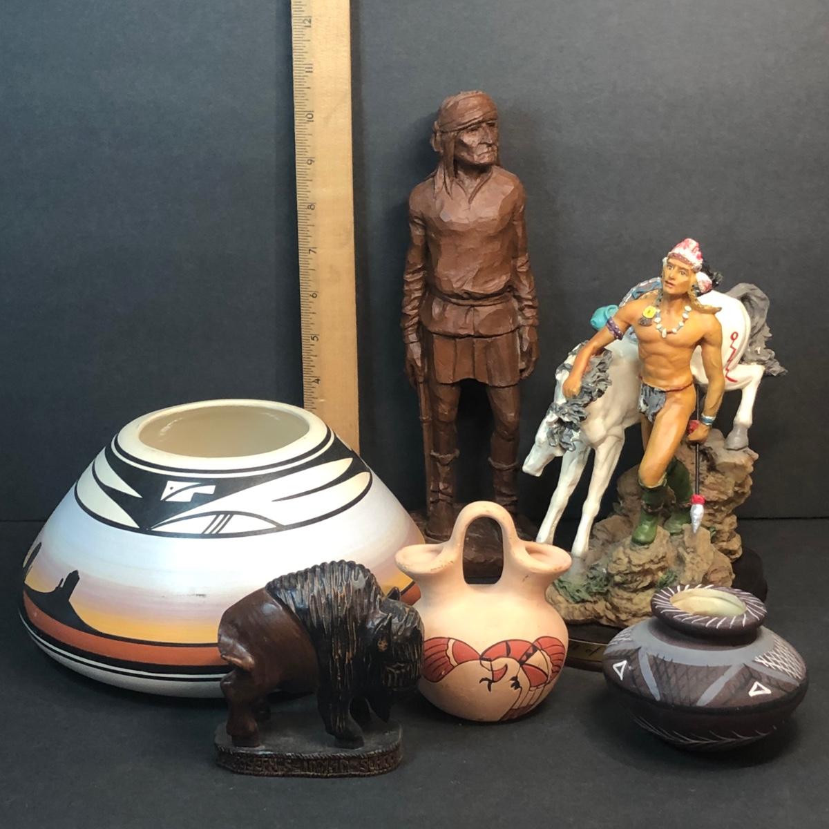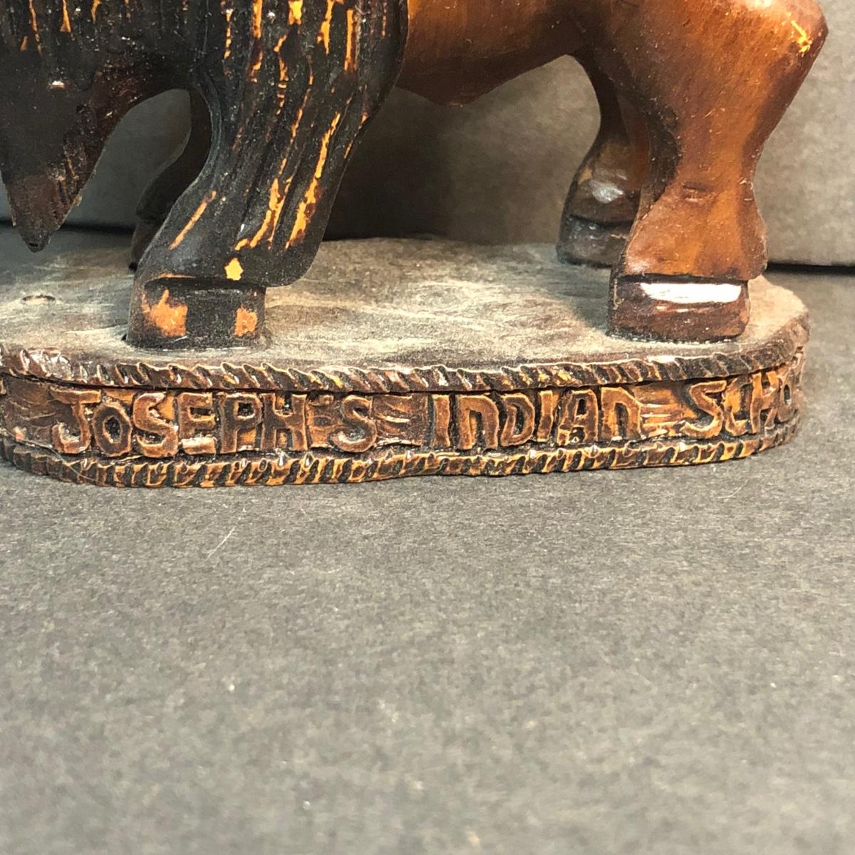 Includes 3 pieces of pottery, the large one is signed. The carved buffalo says "Joseph's Indian School" on the base of it.