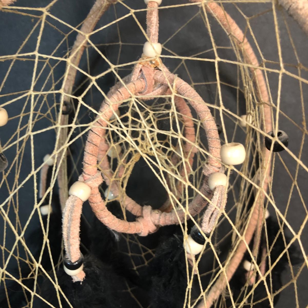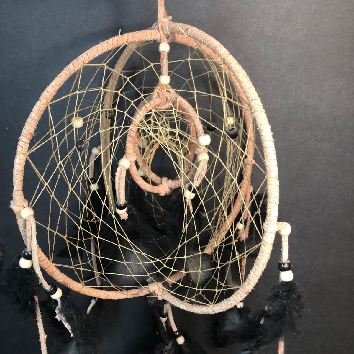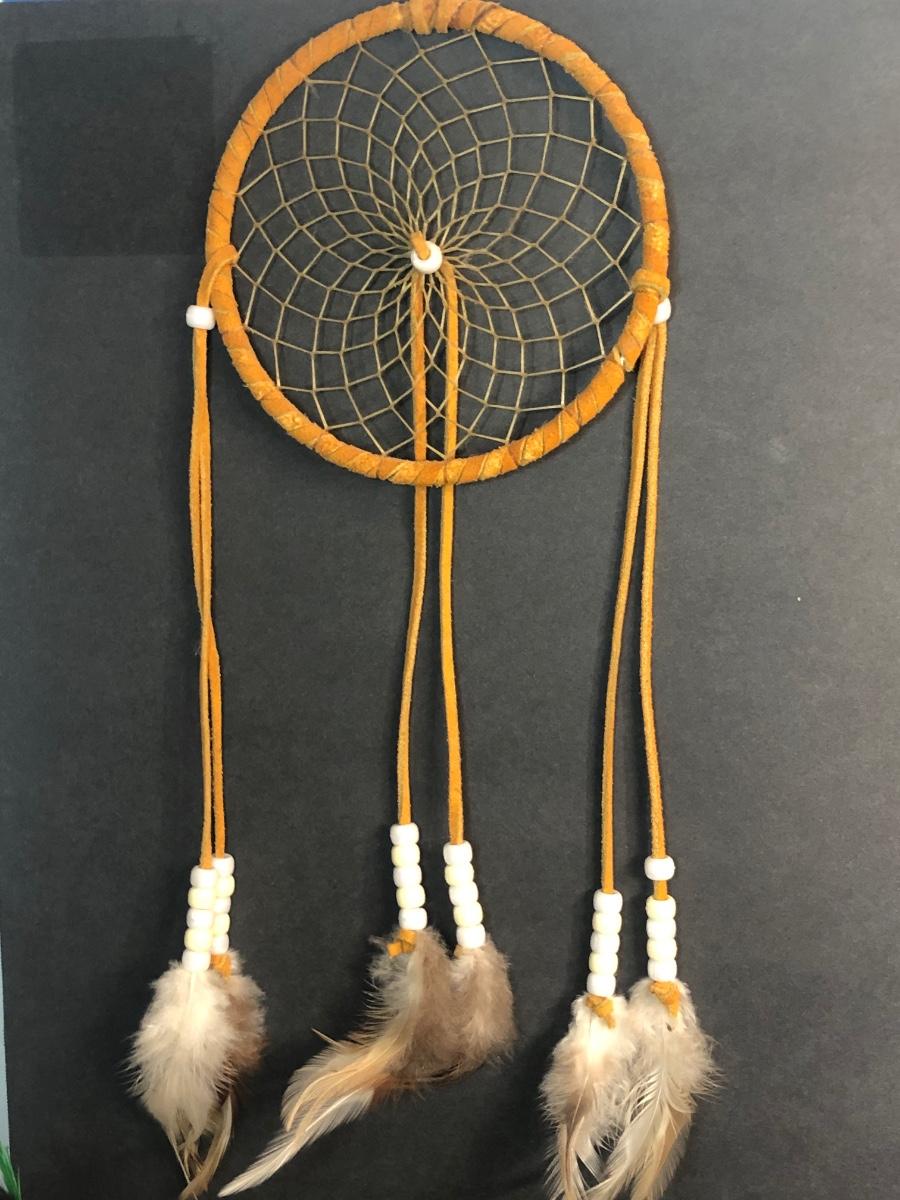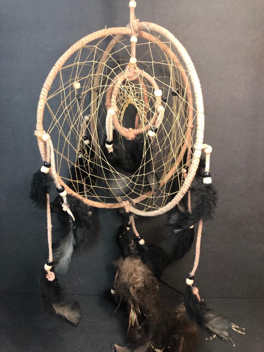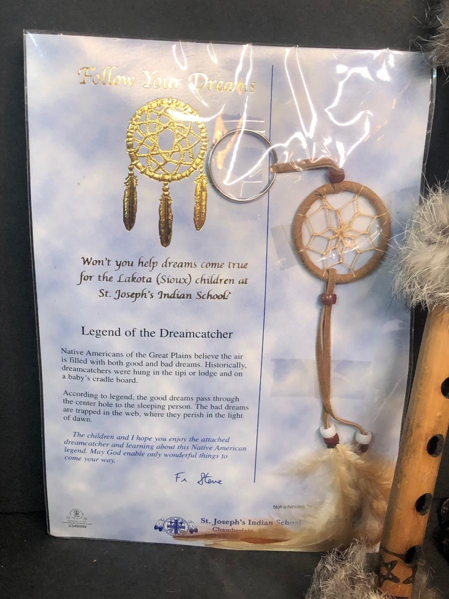 Includes one large multi-layered dream catcher, a medium sized flat dream catcher, and a miniature keychain dream catcher in package. Includes six dolls.